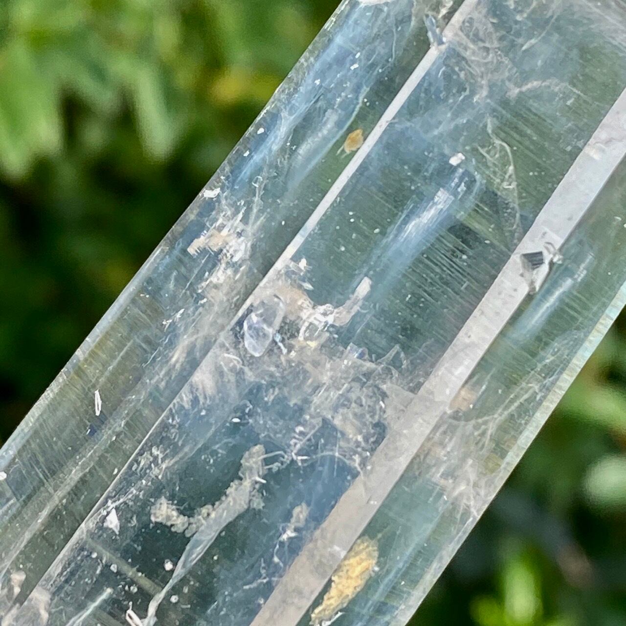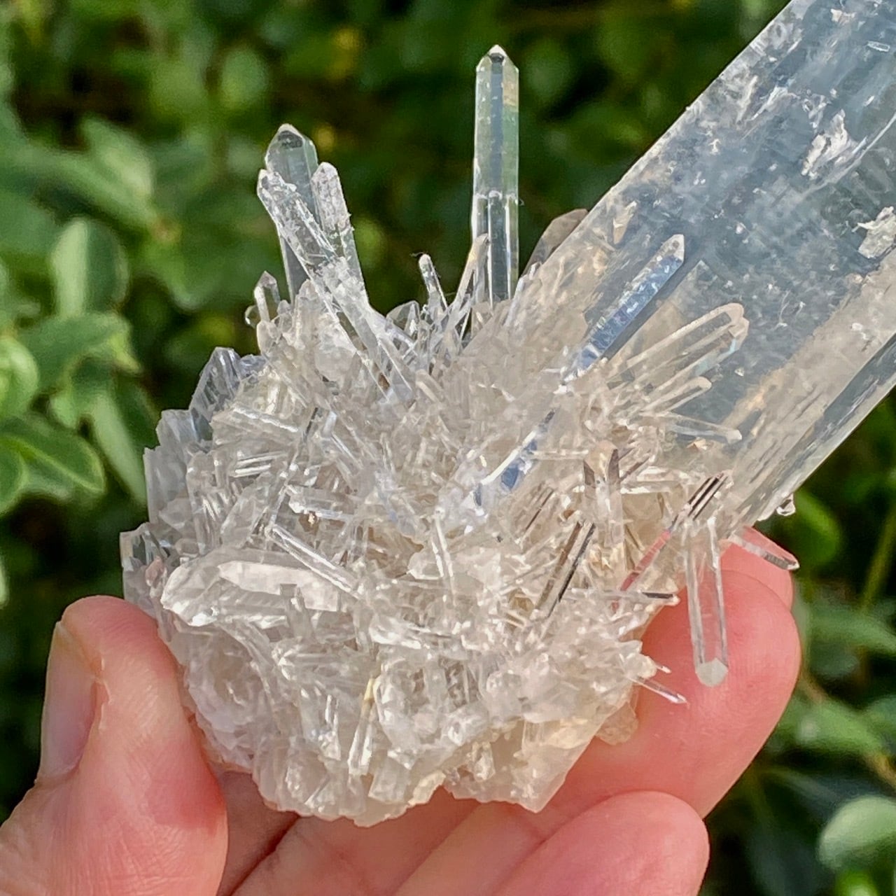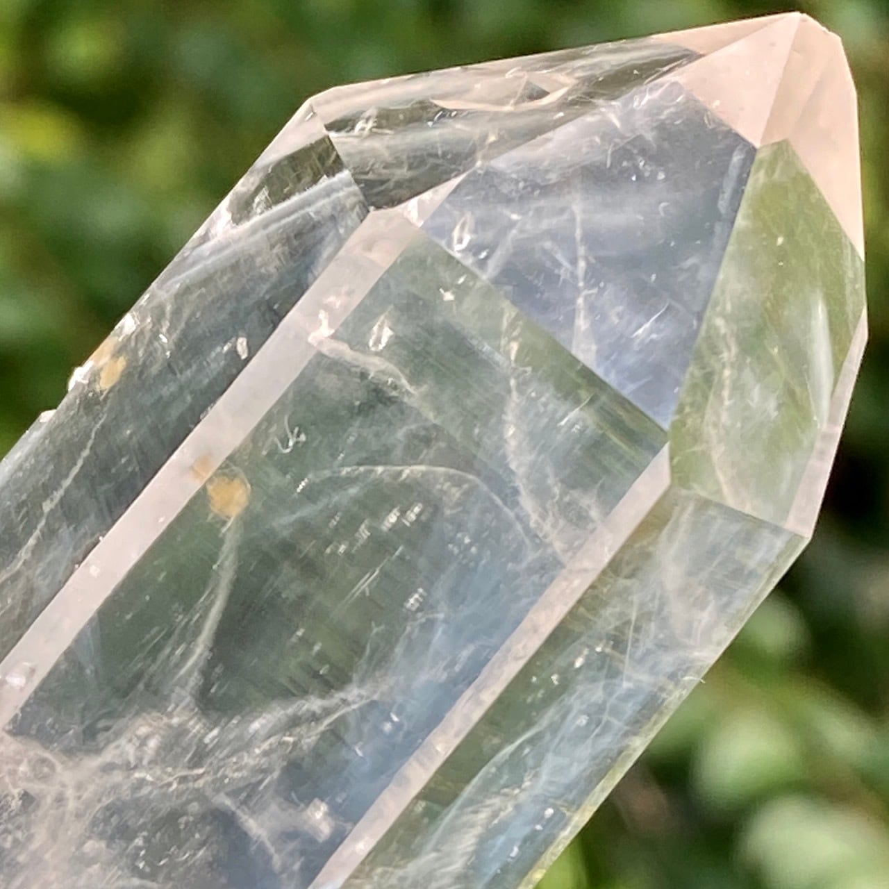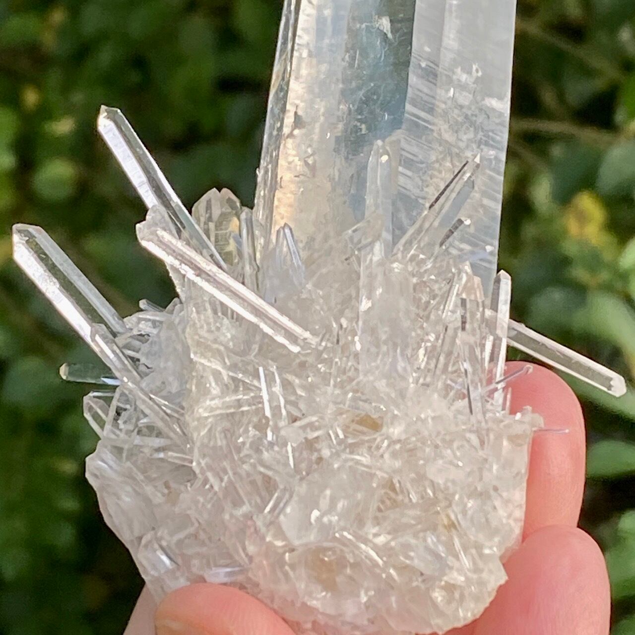コロンビア産の高透明度で照りの強い、しっかりとした太くて照りのあるポイントとそこに浮かぶブルースモーク、そしてレムリアンの組み合わせだけでもスペシャル過ぎますが、さらに極細で透明感のあるきらっきらのニードルクォーツのクラスターが下部にびっしりと付いているゴージャスな子です。