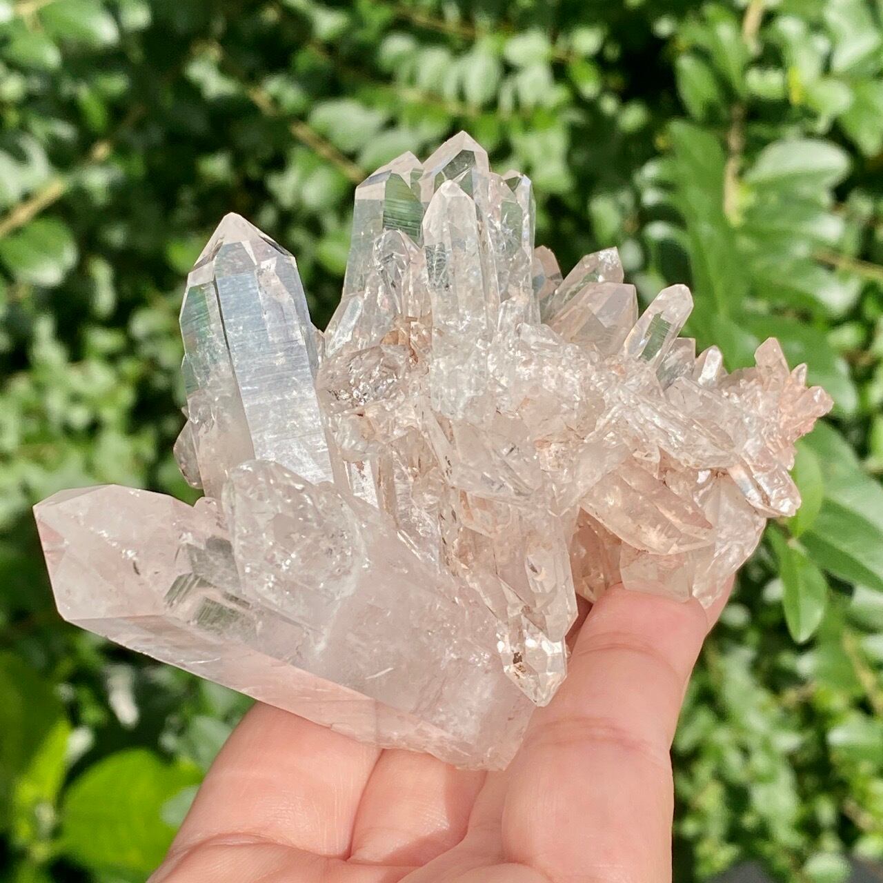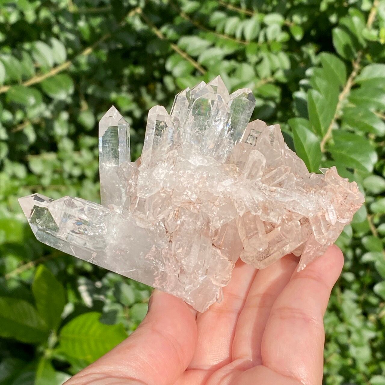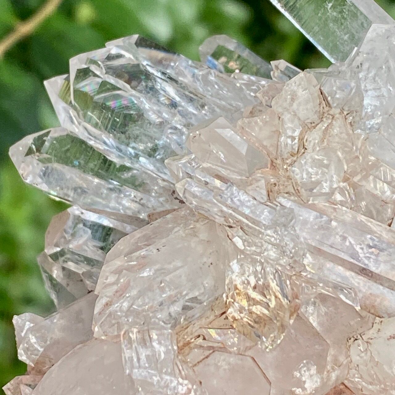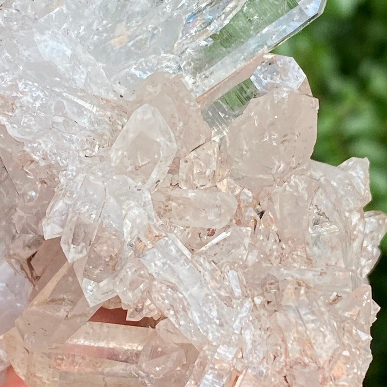 透明度は個体によって異なります。ピンクレムリアンに関しては、形状も一般的なクラスターに加え、沢山のポイントが折り重なっている形状や、非常にレアなタビュラー型のファーデンクォーツのフォーメンションから成ります。