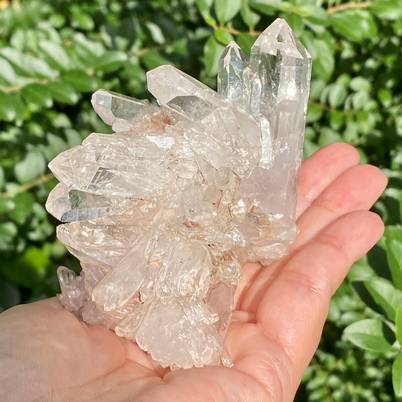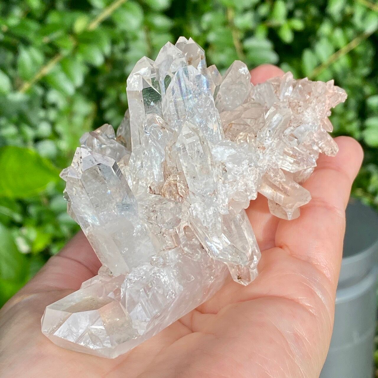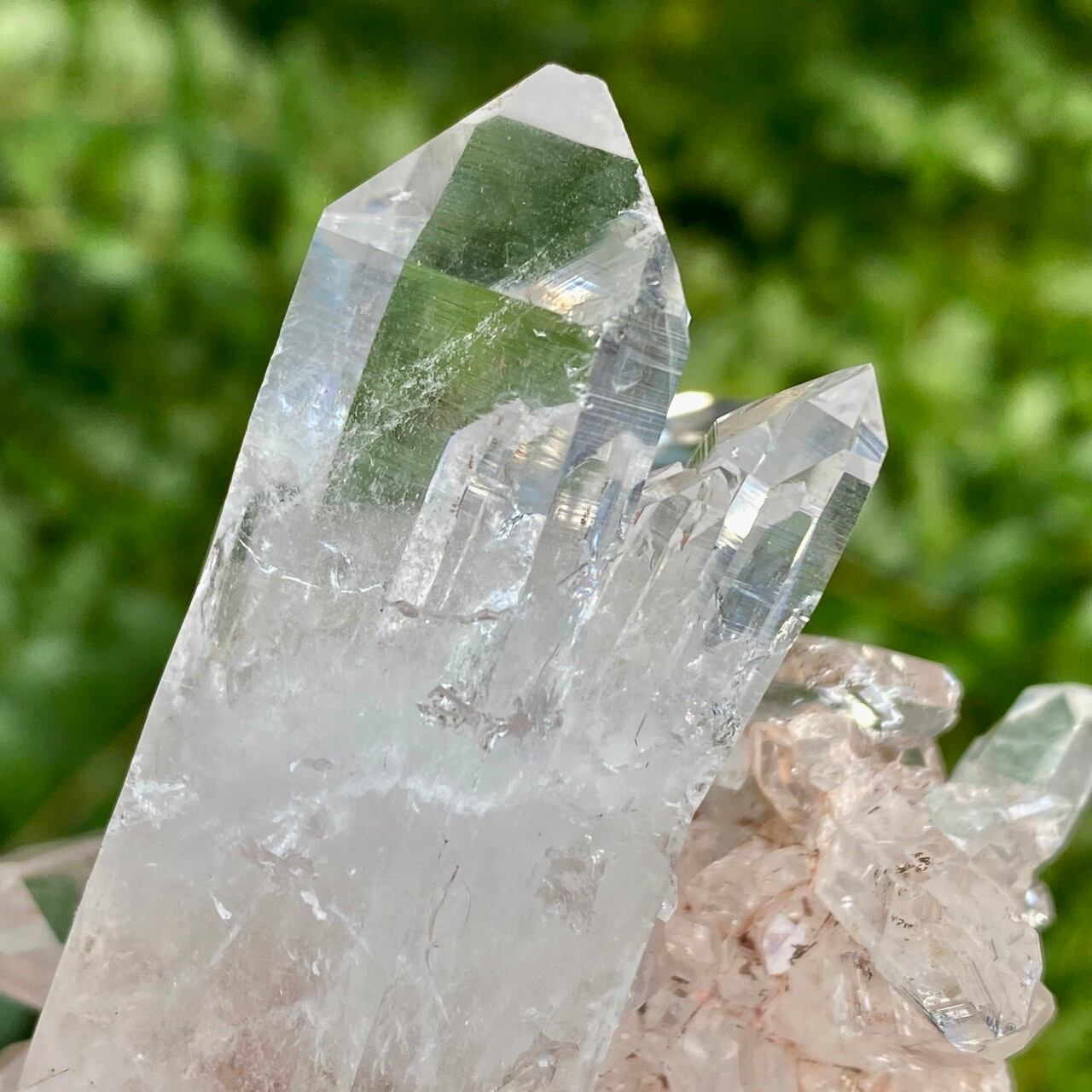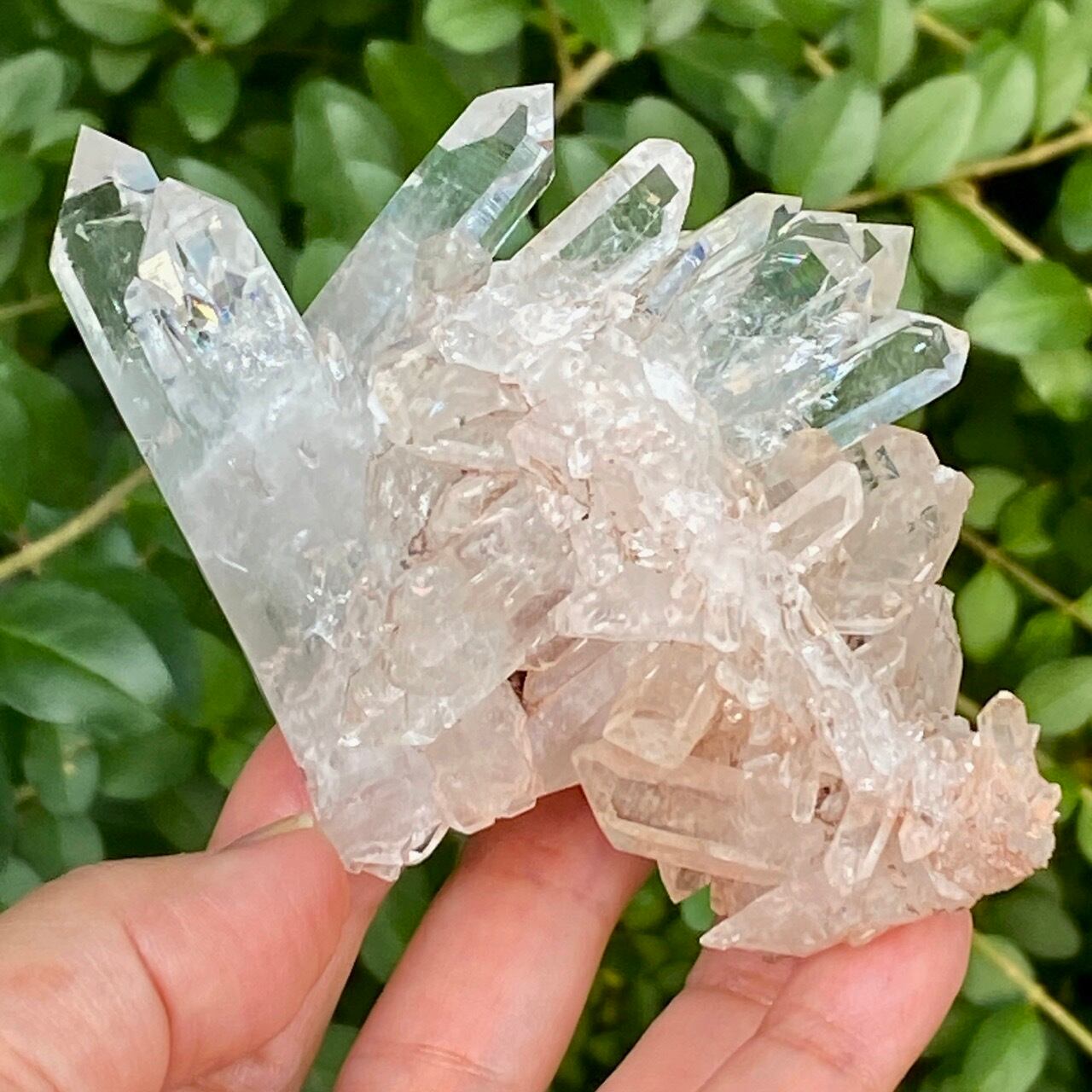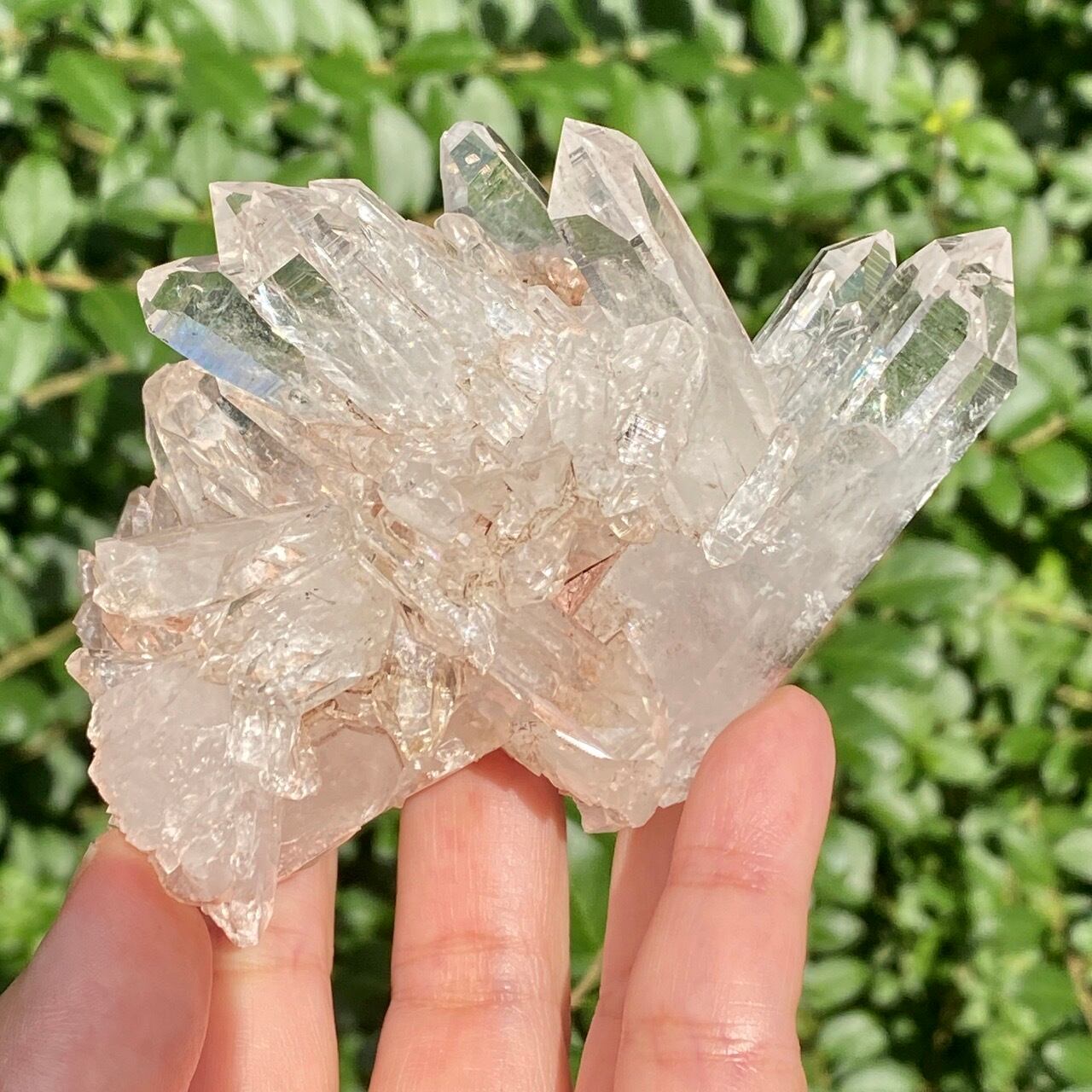 透明度は個体によって異なります。ピンクレムリアンに関しては、形状も一般的なクラスターに加え、沢山のポイントが折り重なっている形状や、非常にレアなタビュラー型のファーデンクォーツのフォーメンションから成ります。