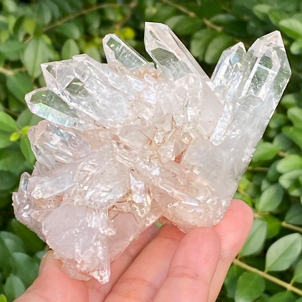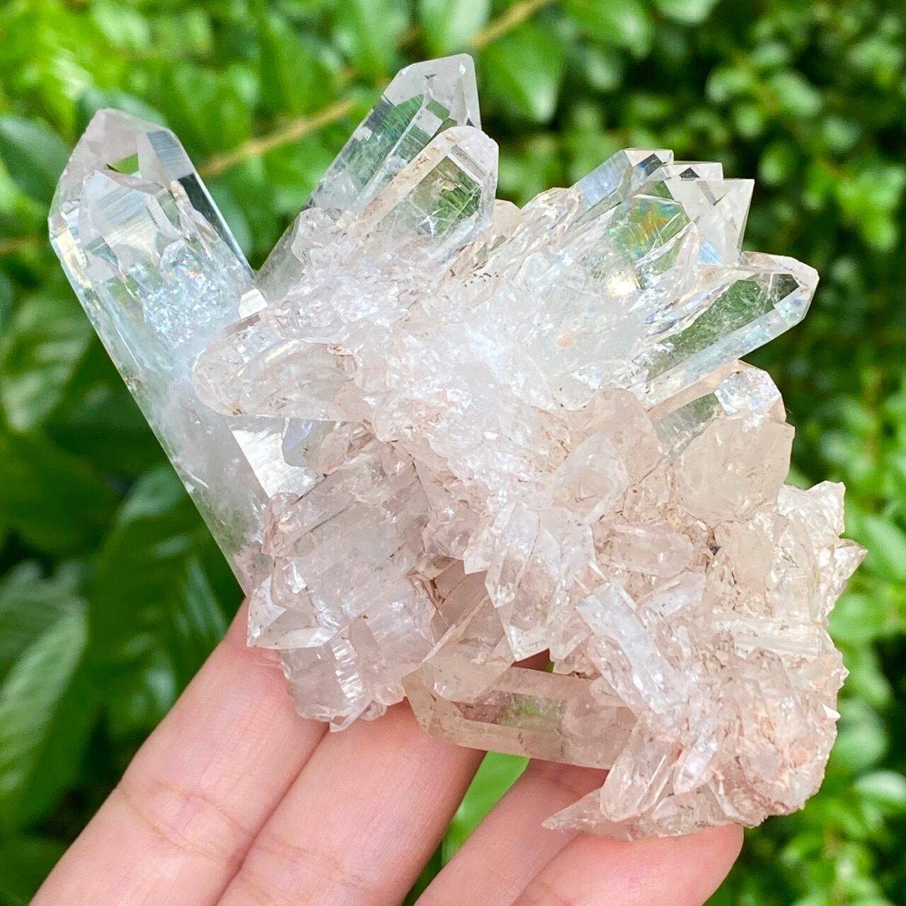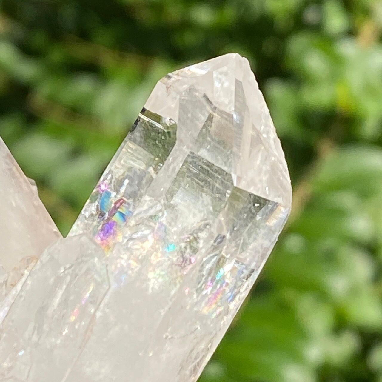 しっかりとしたDT (両剣)のポイントが扇のように広がり、まるで鳥の様な魅力的なフォーメーションがアイキャッチな子になります。リチウム水晶に多いミルキー部分と透明度の高い部分から成り、コロンビア水晶の魅力が味わえ、虹も数カ所あって輝きも綺麗です。