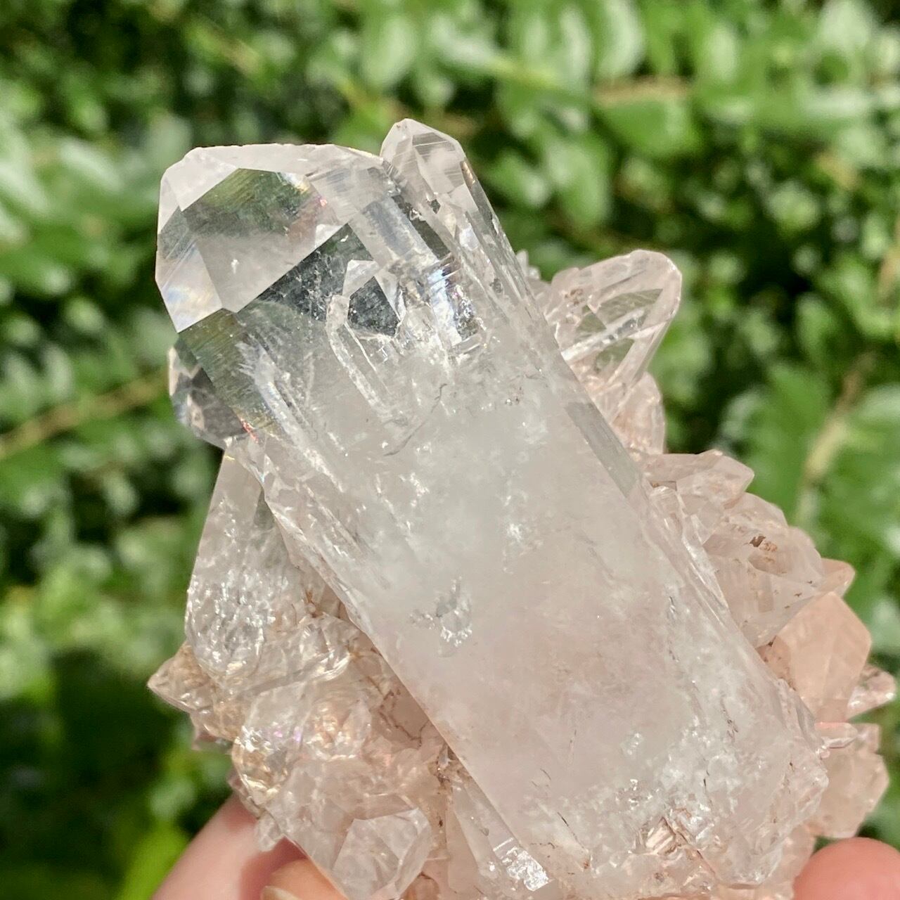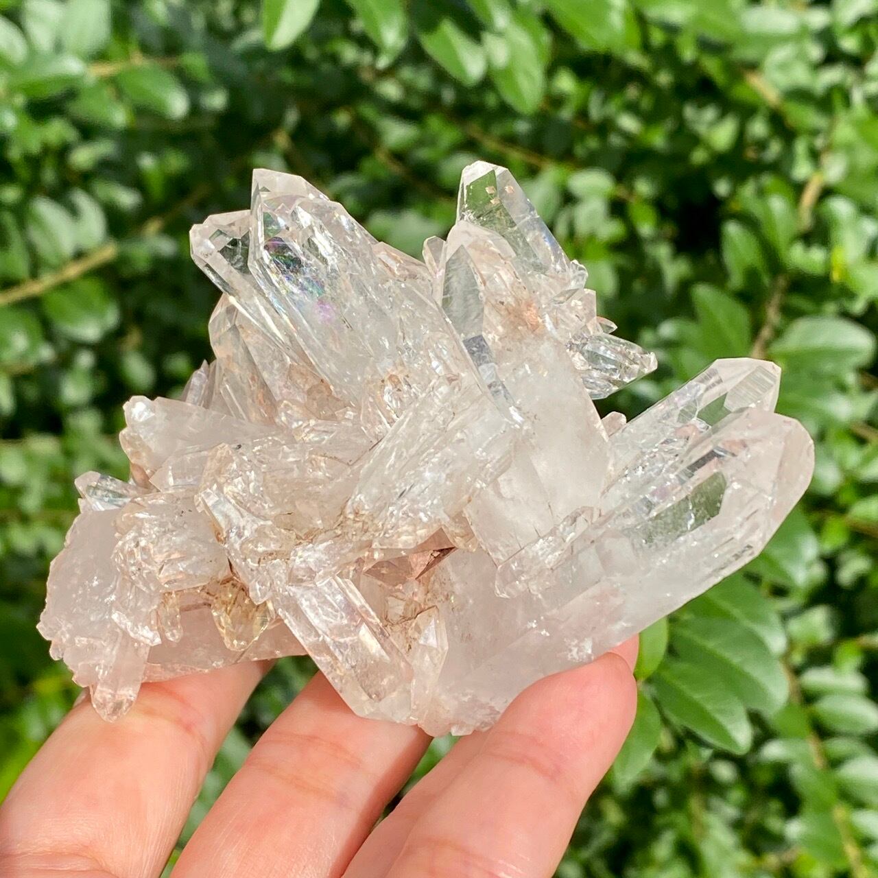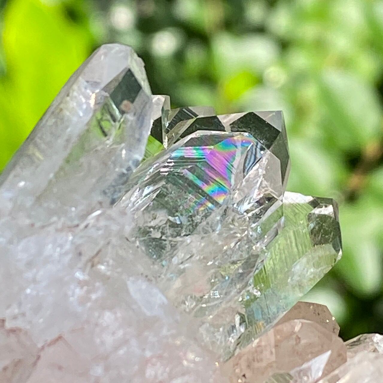 しっかりとしたDT (両剣)のポイントが扇のように広がり、まるで鳥の様な魅力的なフォーメーションがアイキャッチな子になります。リチウム水晶に多いミルキー部分と透明度の高い部分から成り、コロンビア水晶の魅力が味わえ、虹も数カ所あって輝きも綺麗です。