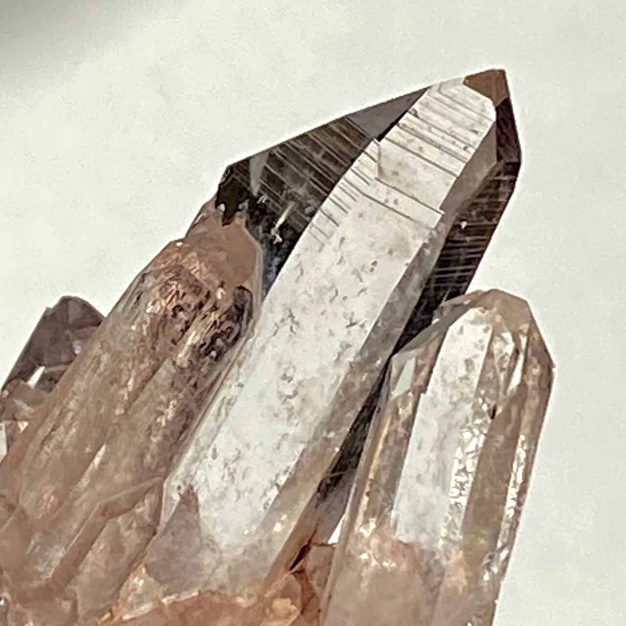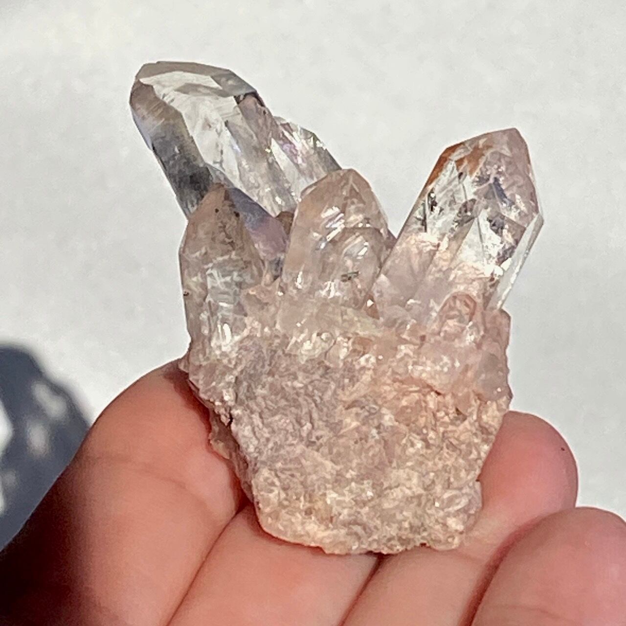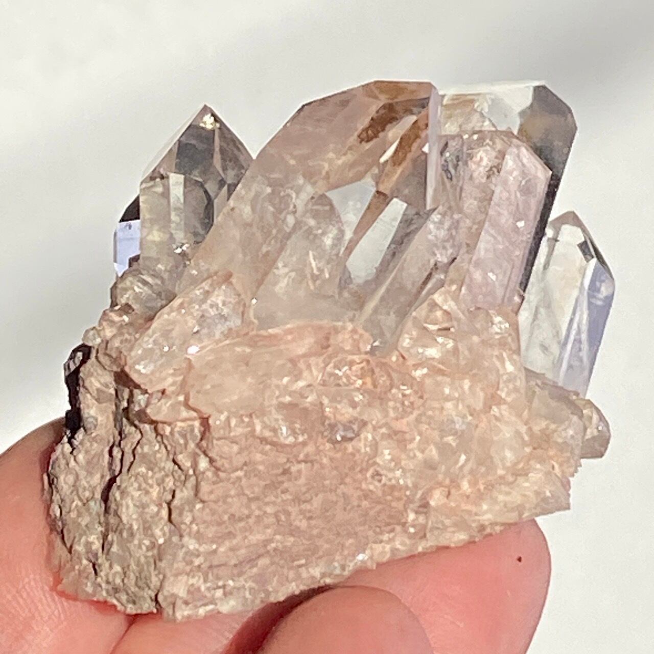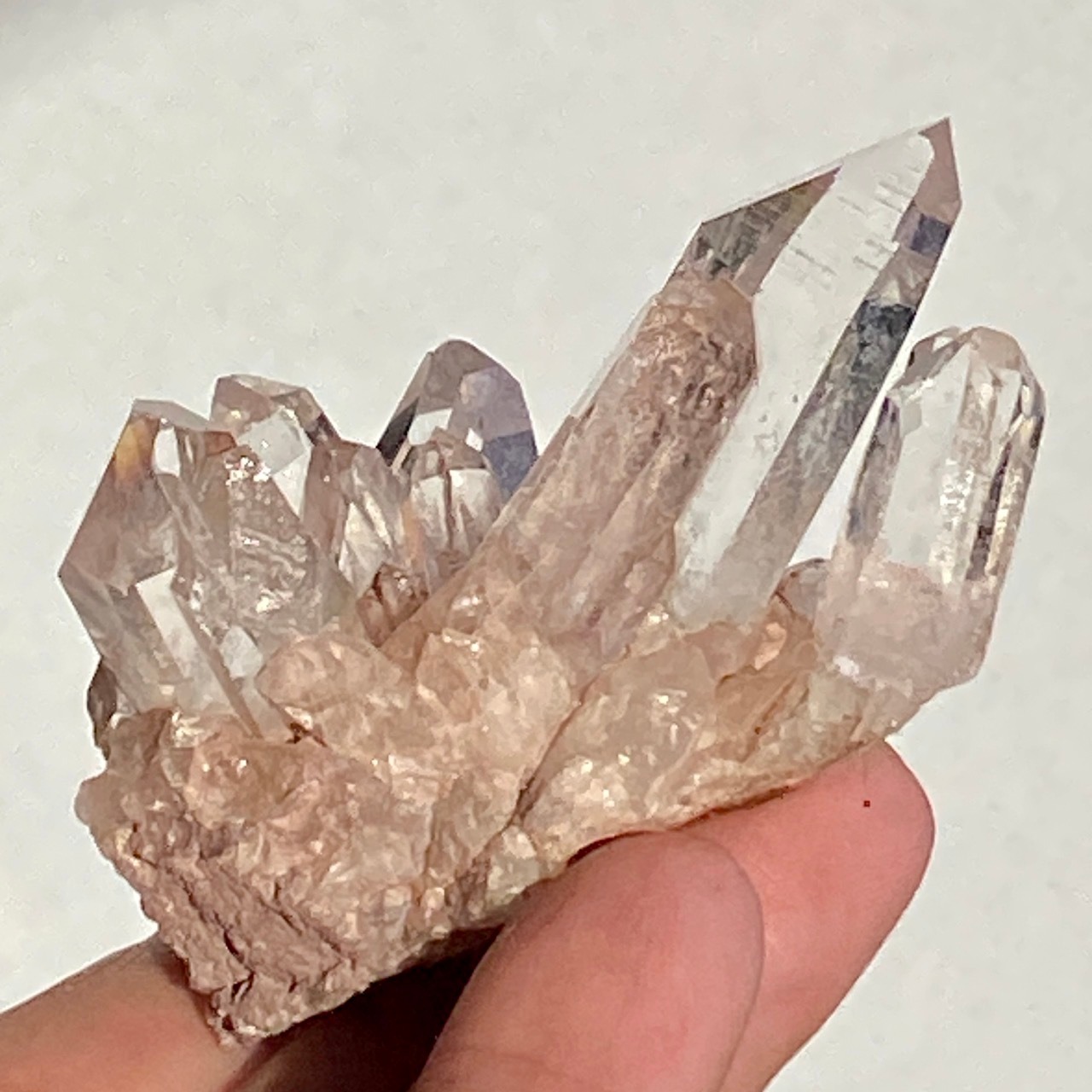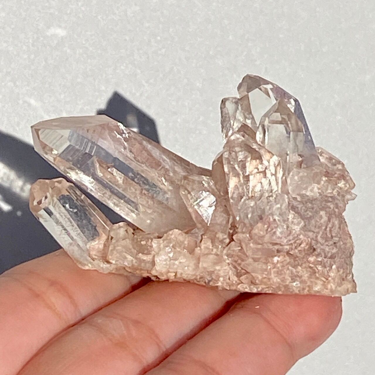 透明度は個体によって異なります。ピンクレムリアンに関しては、形状も一般的なクラスターに加え、沢山のポイントが折り重なっている形状や、非常にレアなタビュラー型のファーデンクォーツのフォーメンションから成ります。