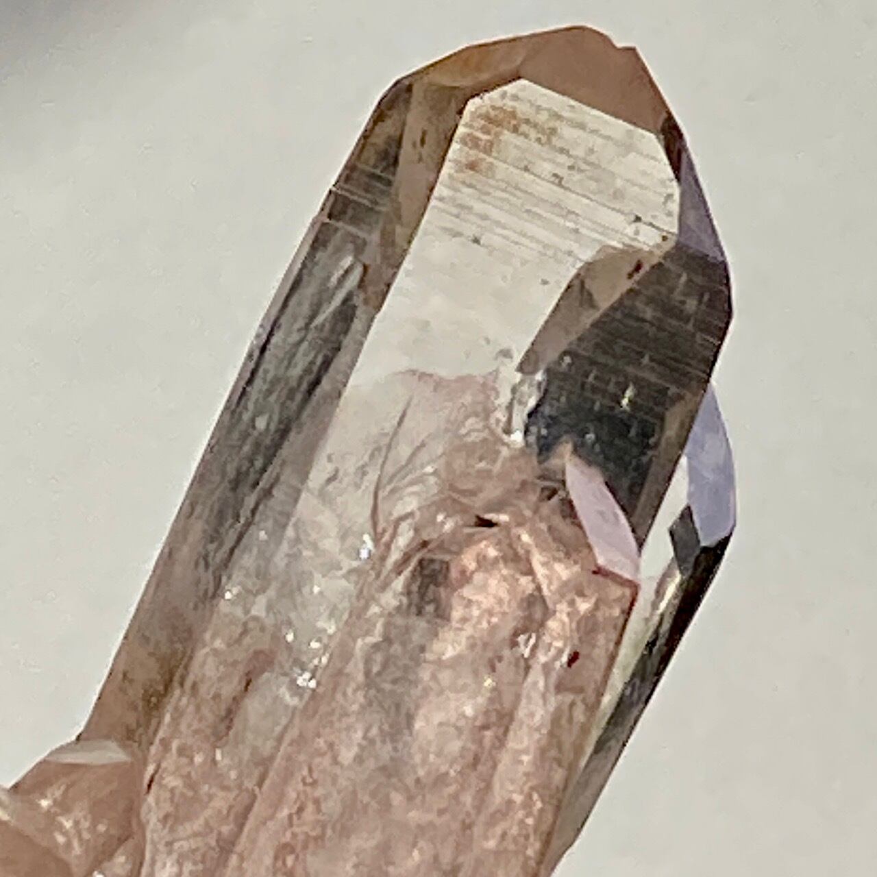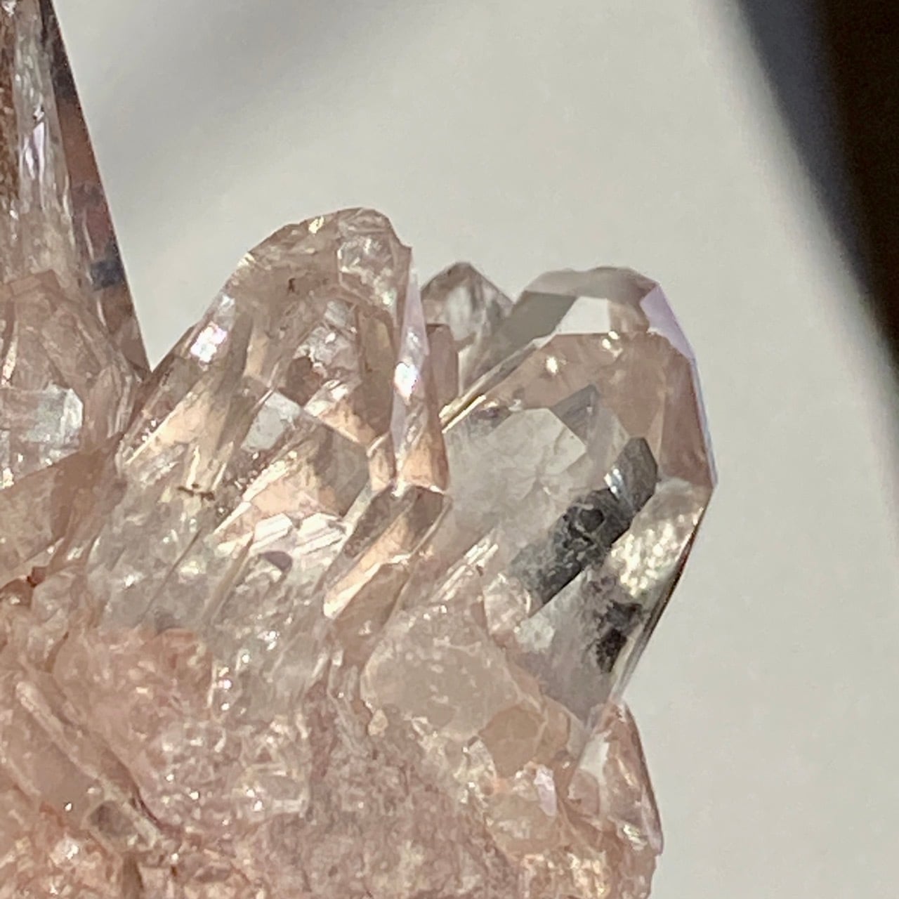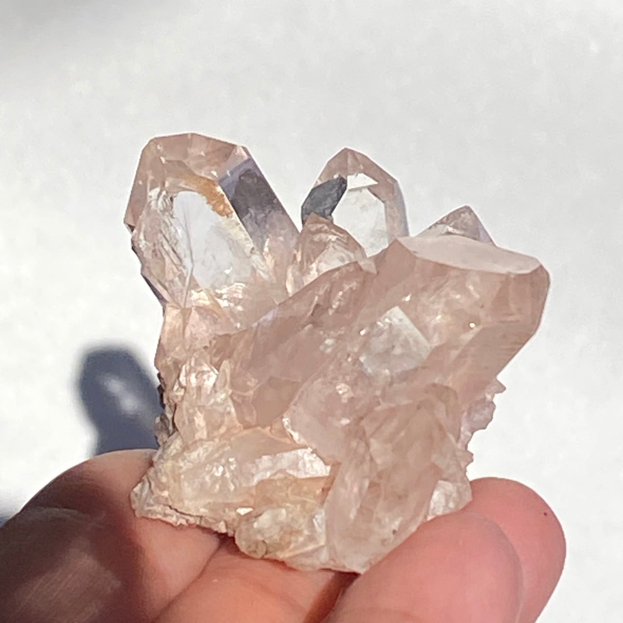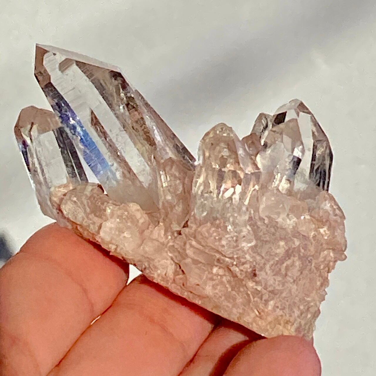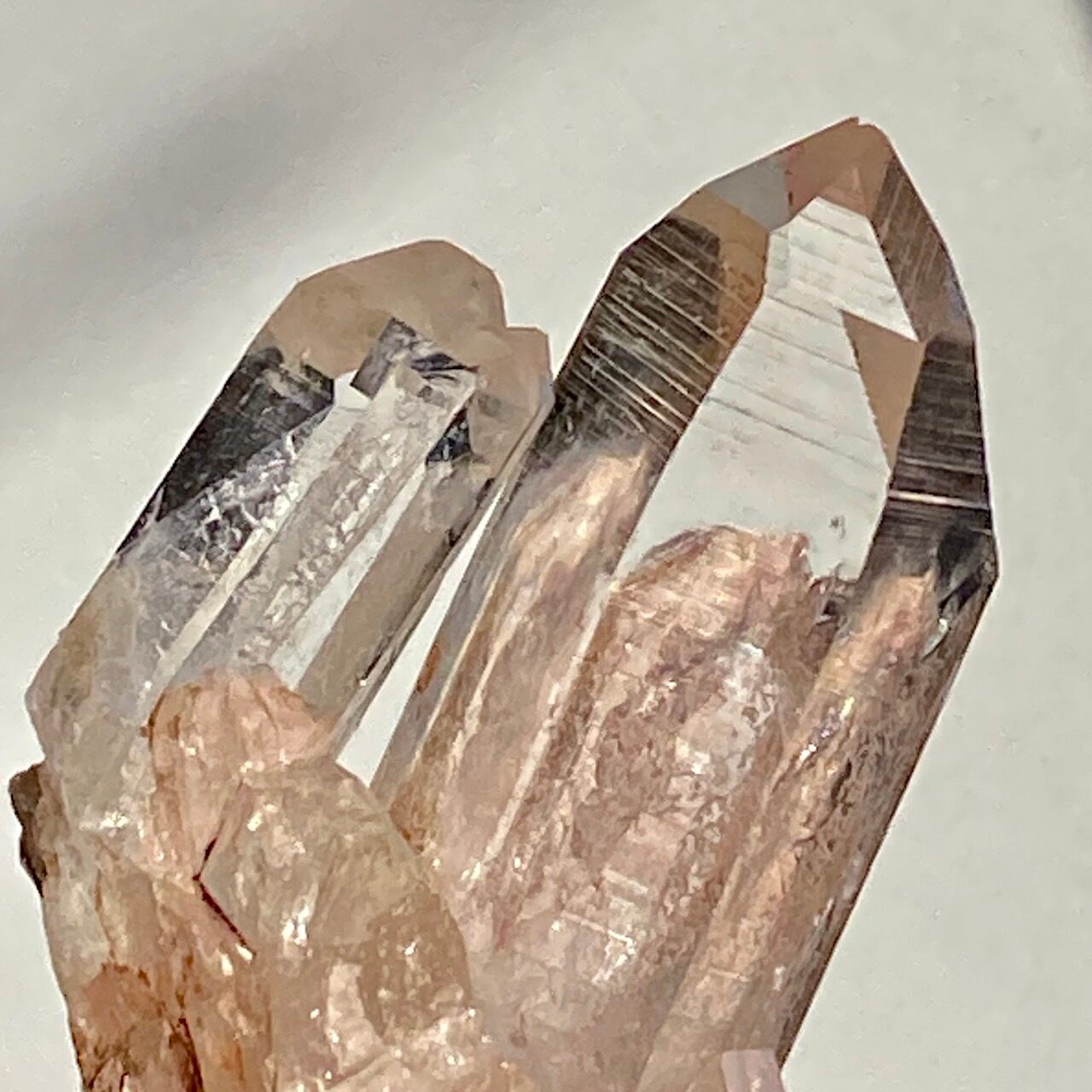 透明度は個体によって異なります。ピンクレムリアンに関しては、形状も一般的なクラスターに加え、沢山のポイントが折り重なっている形状や、非常にレアなタビュラー型のファーデンクォーツのフォーメンションから成ります。