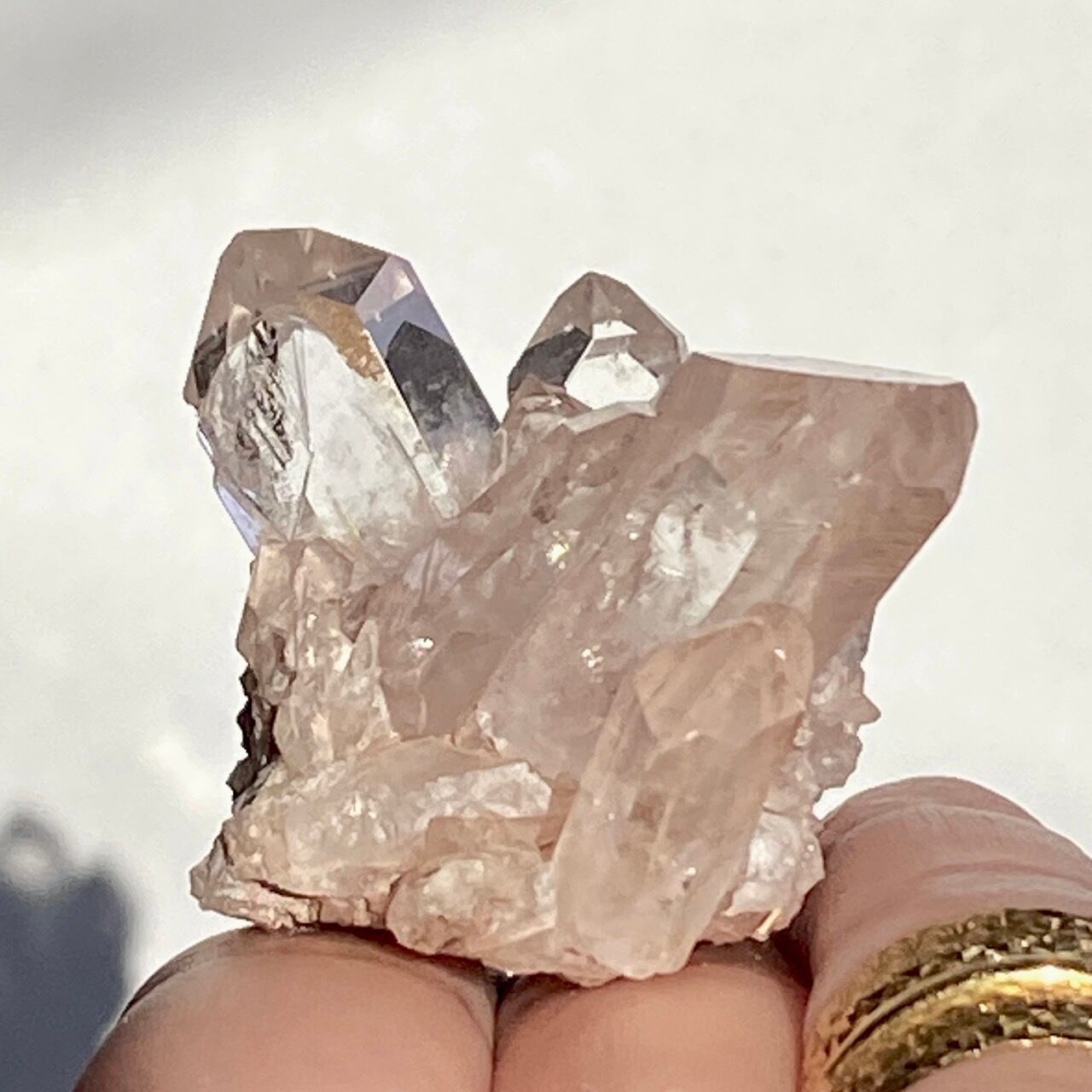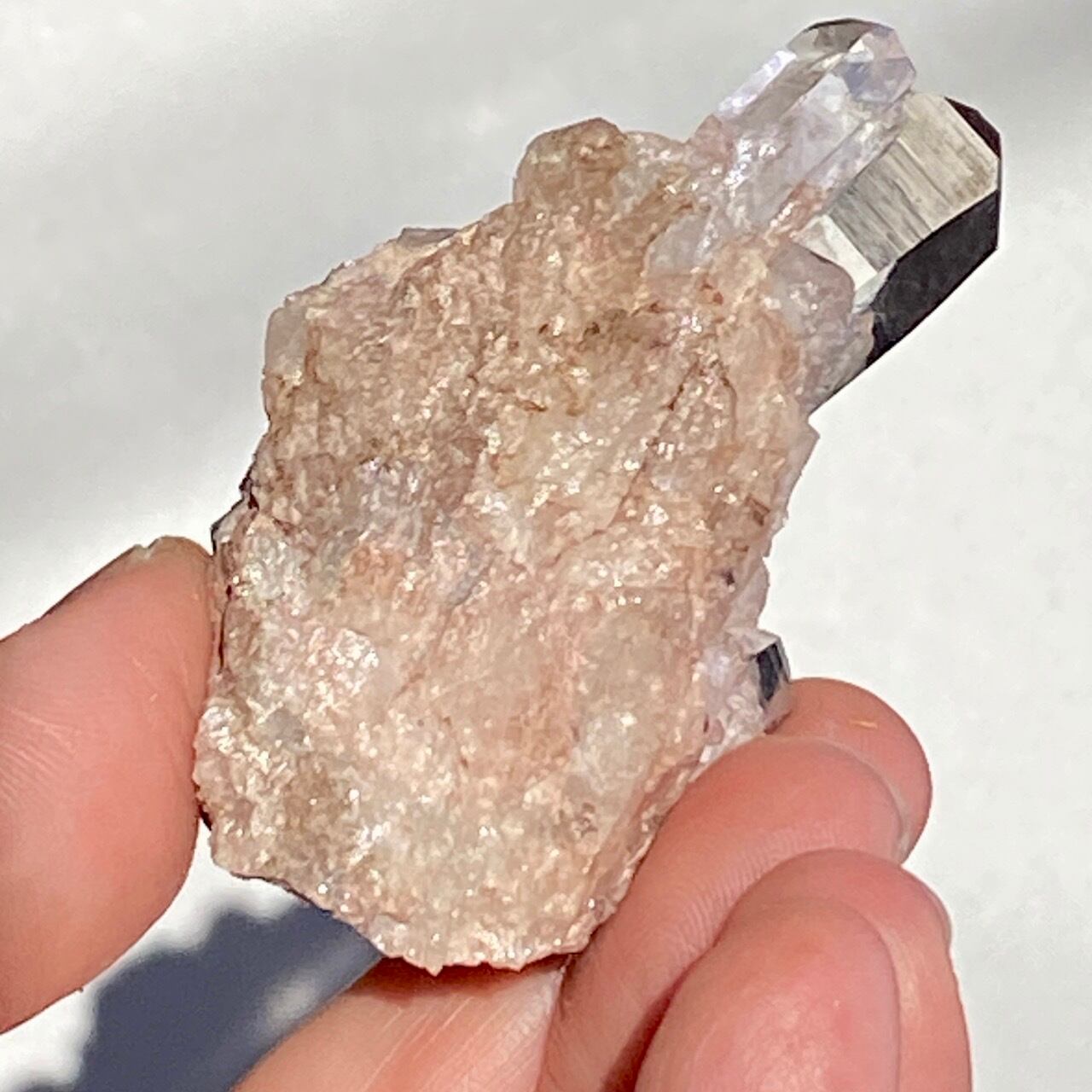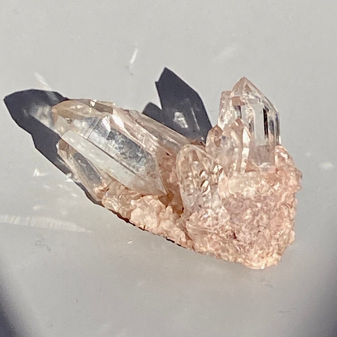 ピンク〜ココア色の母岩がに透明度の高いポイントが付いた子です。スペシメン風に飾っても可愛いサイズです。