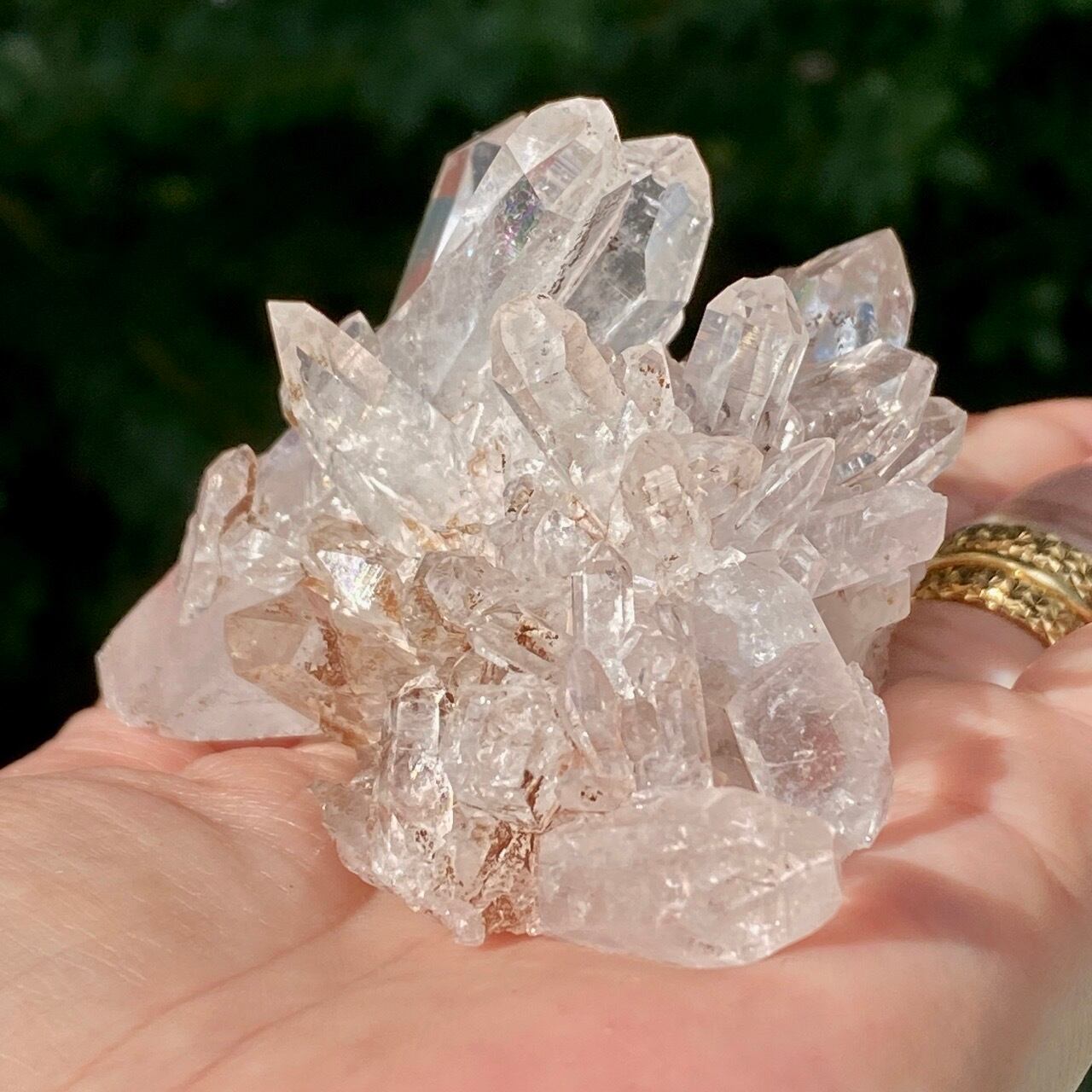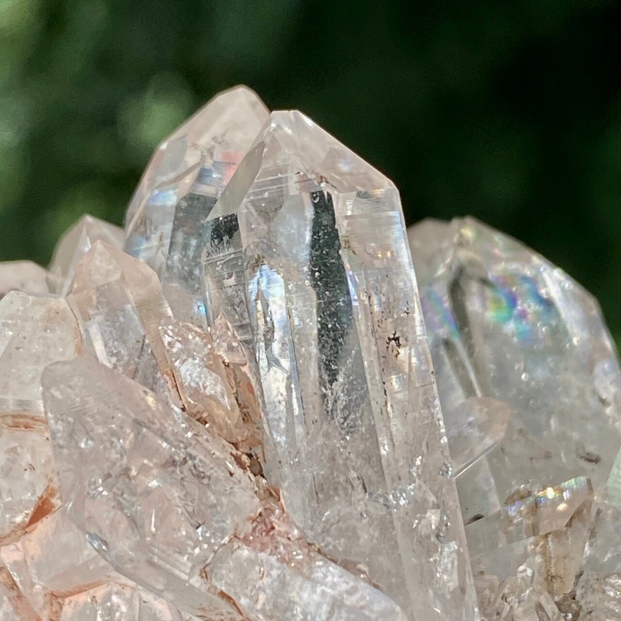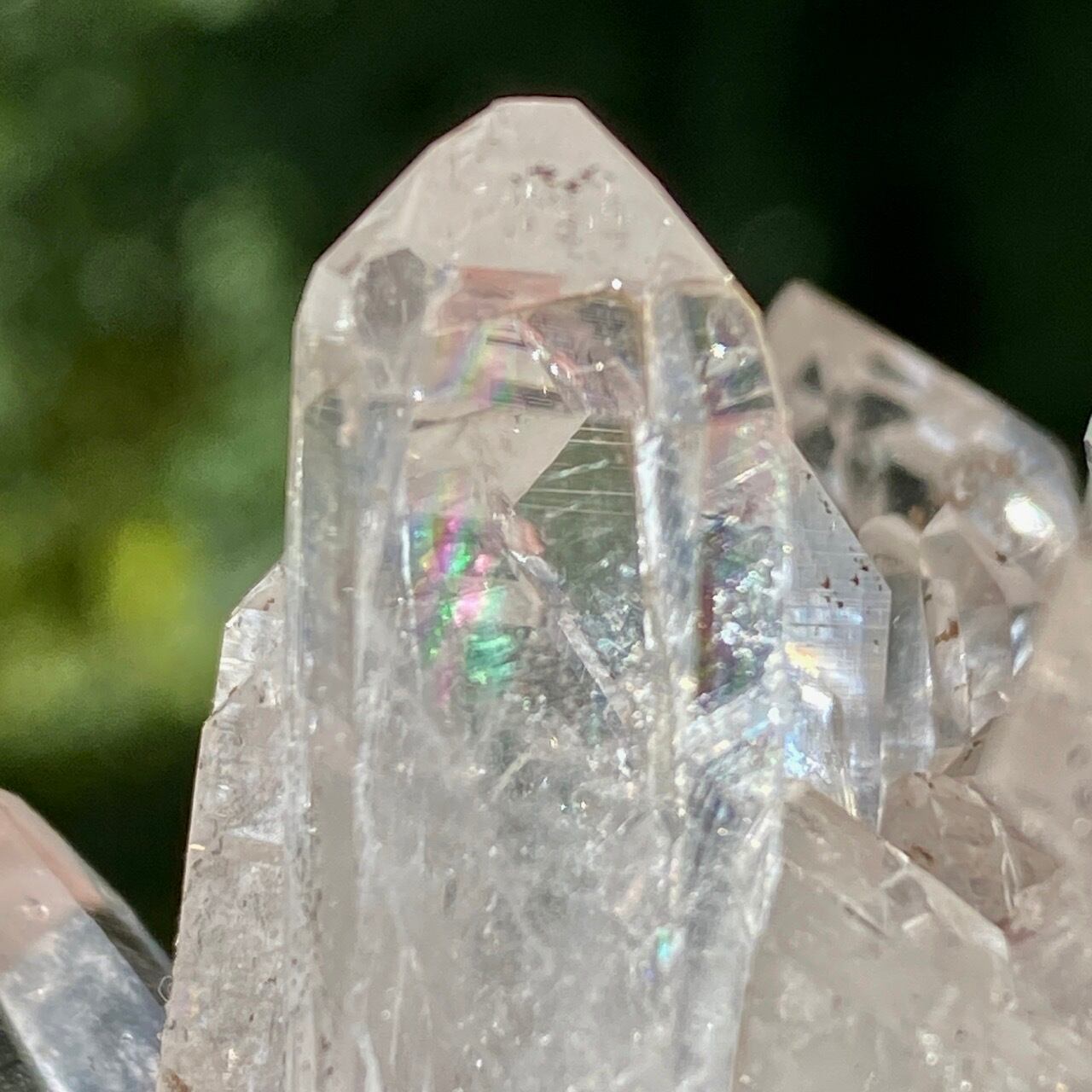 放射状に伸びたポイントが目を引く美しいフォーメーション。虹も見られ、リチウム水晶に多い、ミルキーな部分と透明な部分両方から成るポイントがびっしりと付いています。