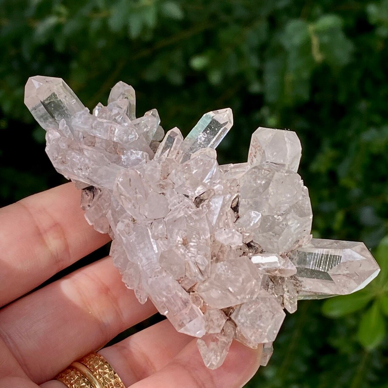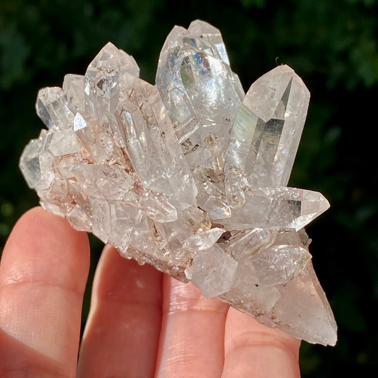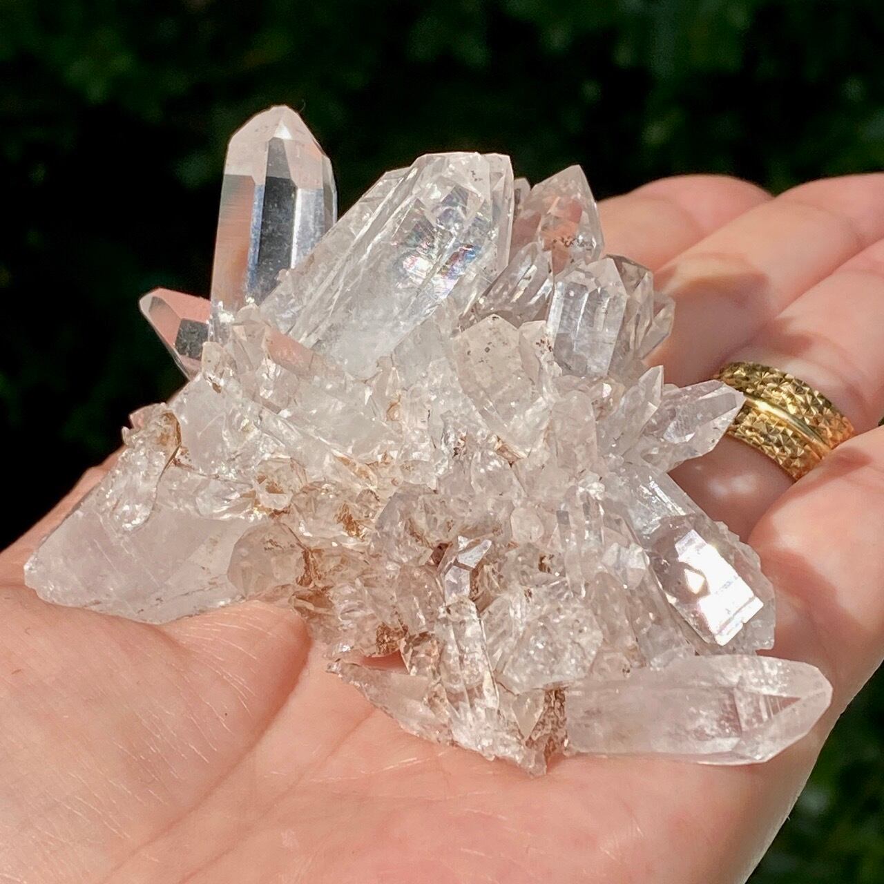 放射状に伸びたポイントが目を引く美しいフォーメーション。虹も見られ、リチウム水晶に多い、ミルキーな部分と透明な部分両方から成るポイントがびっしりと付いています。