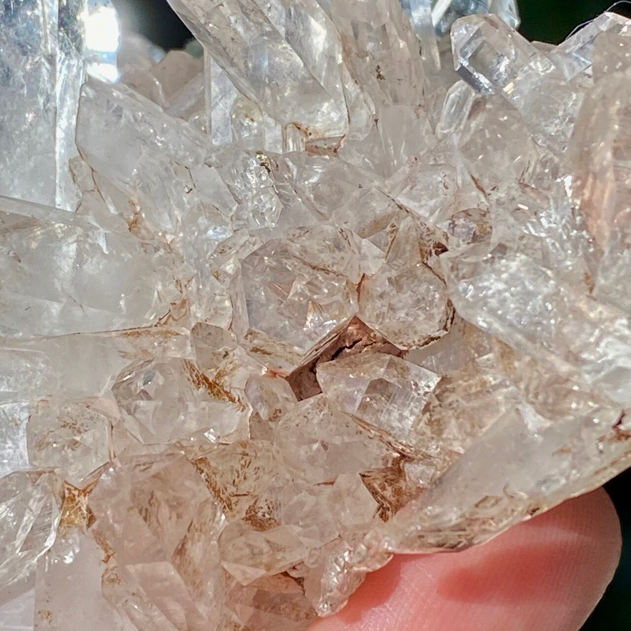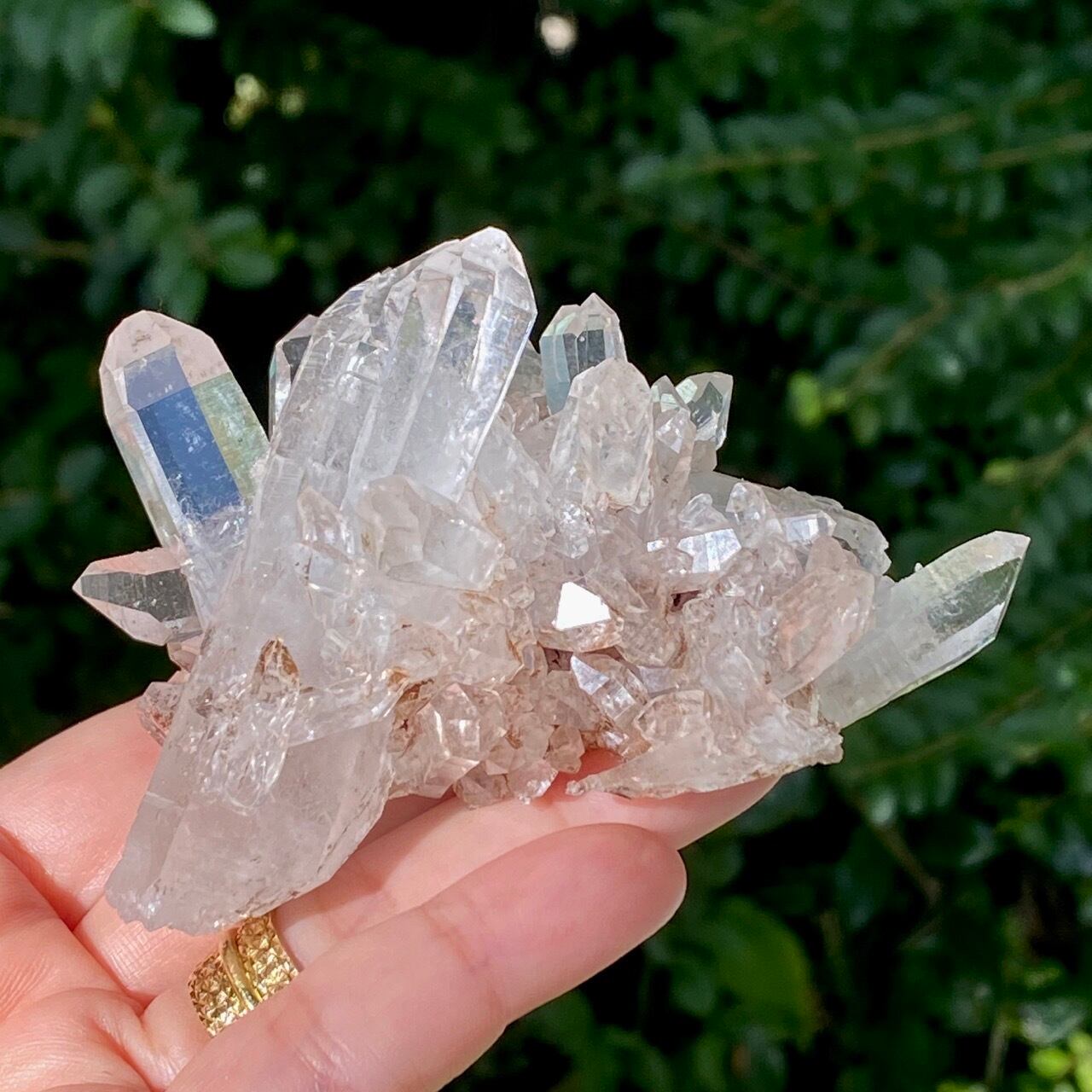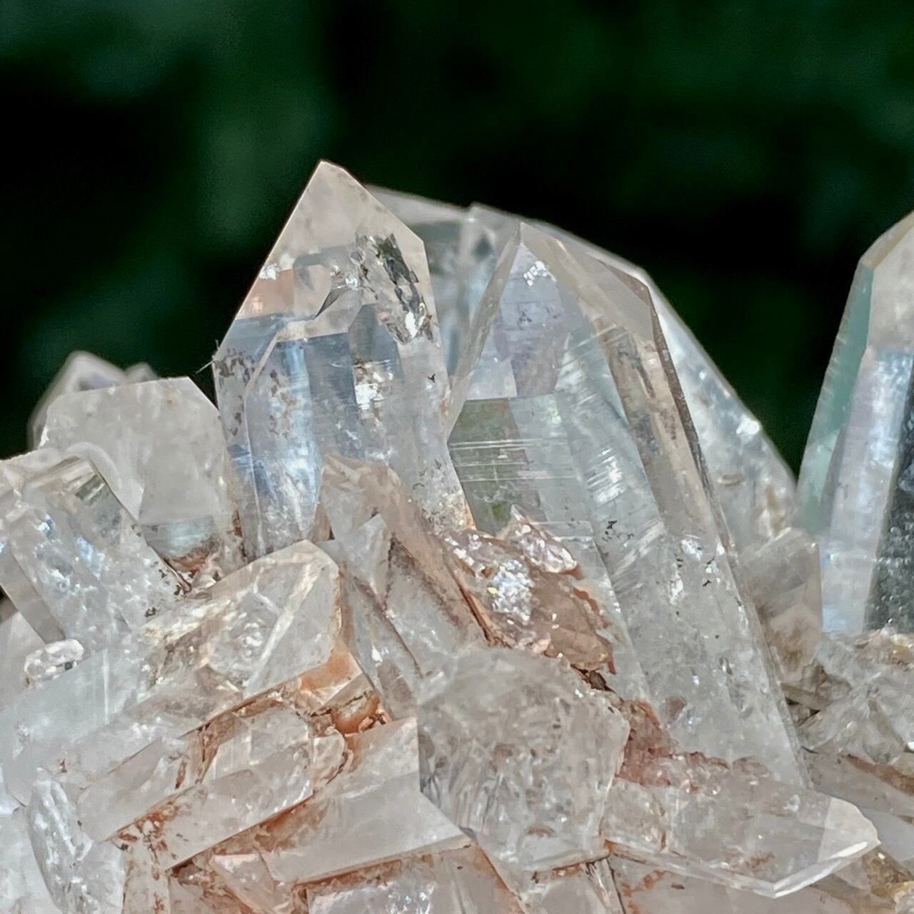 透明度は個体によって異なります。ピンクレムリアンに関しては、形状も一般的なクラスターに加え、沢山のポイントが折り重なっている形状や、非常にレアなタビュラー型のファーデンクォーツのフォーメンションから成ります。