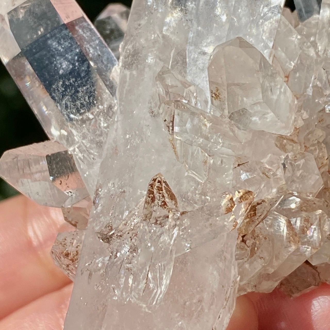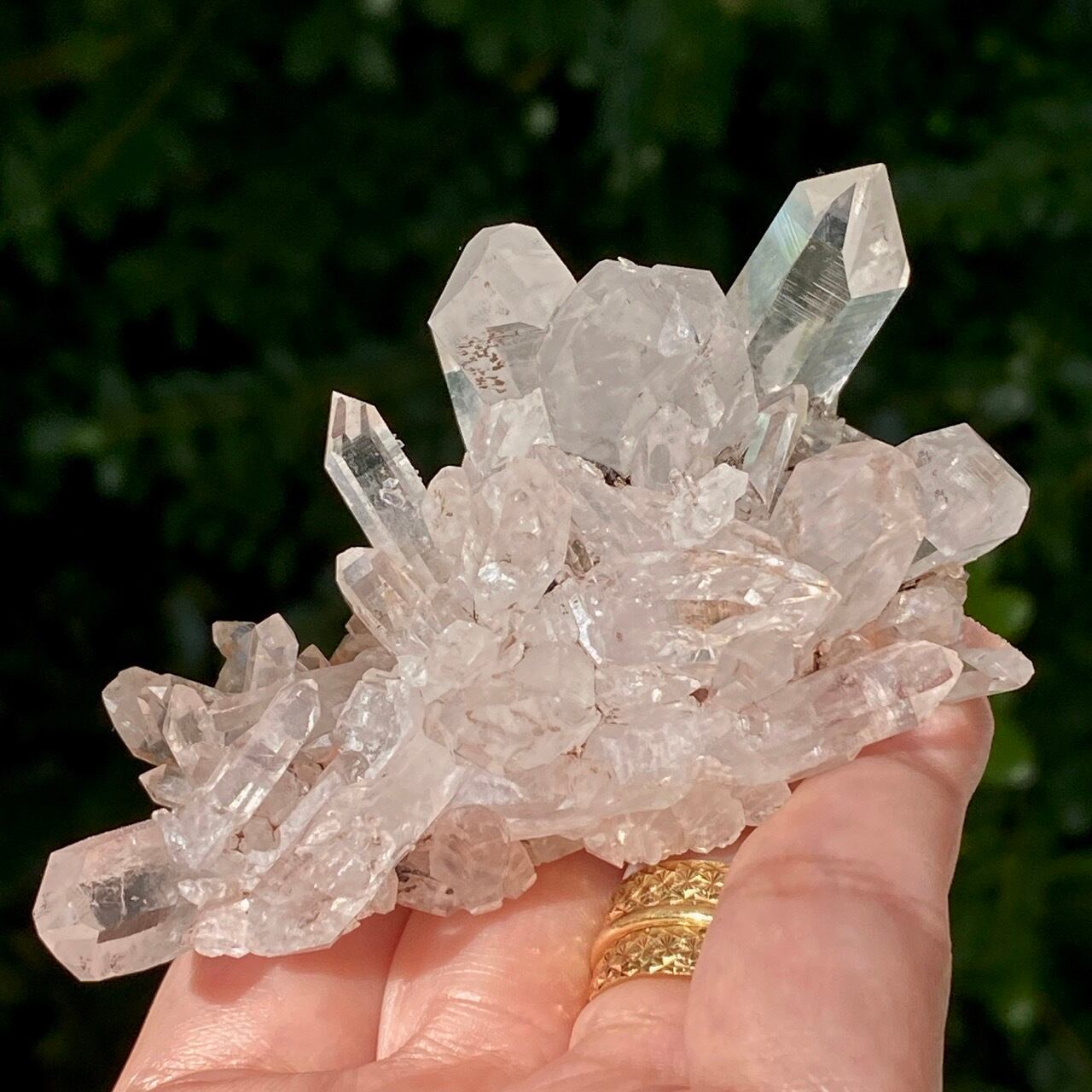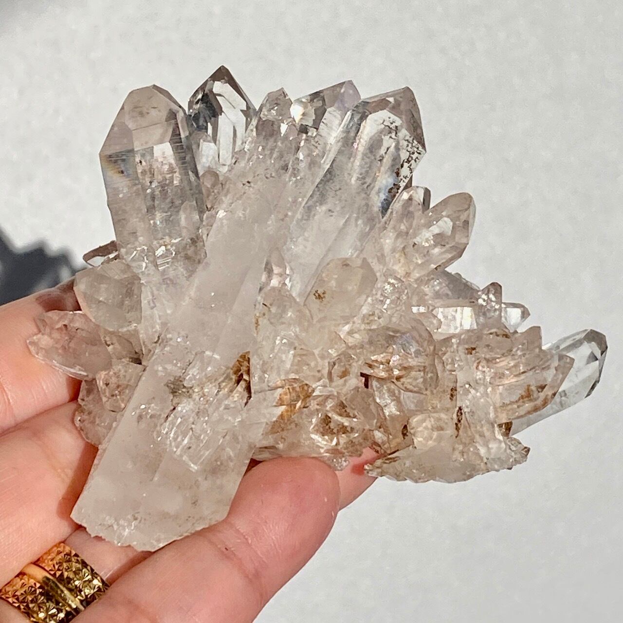 透明度は個体によって異なります。ピンクレムリアンに関しては、形状も一般的なクラスターに加え、沢山のポイントが折り重なっている形状や、非常にレアなタビュラー型のファーデンクォーツのフォーメンションから成ります。