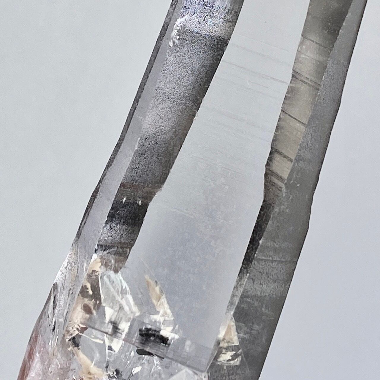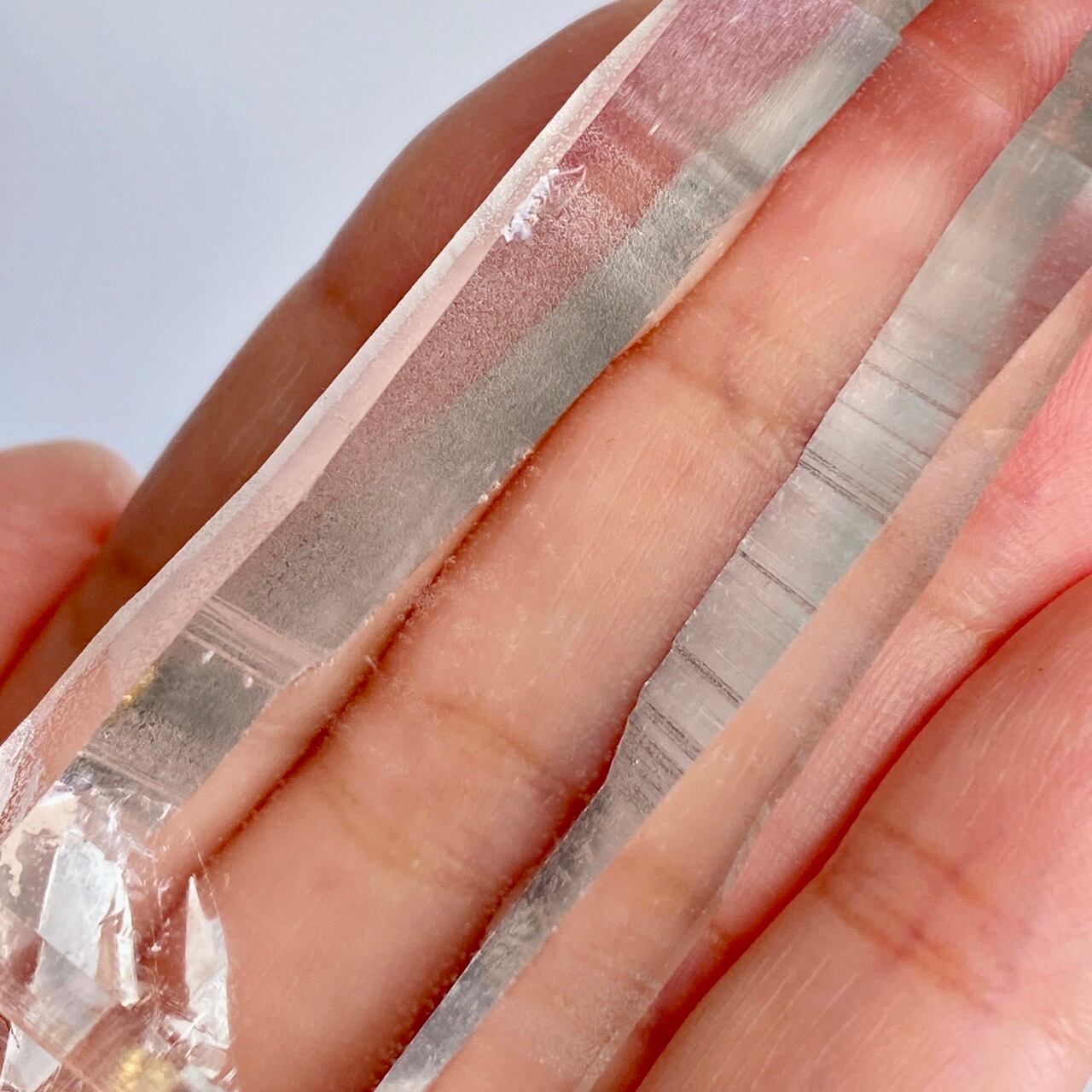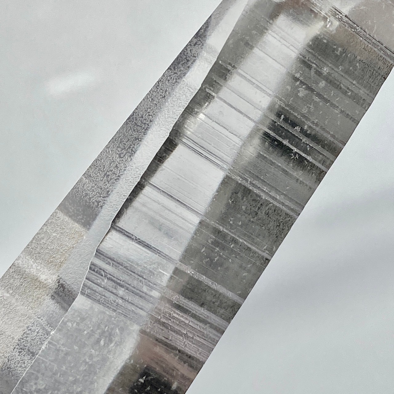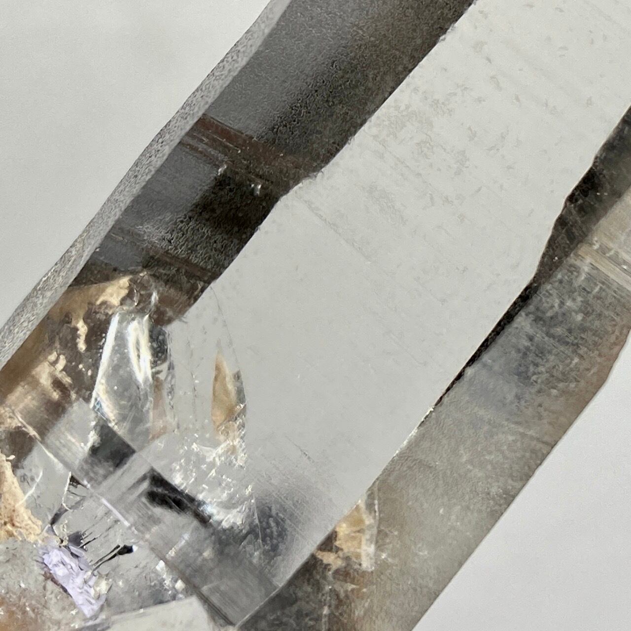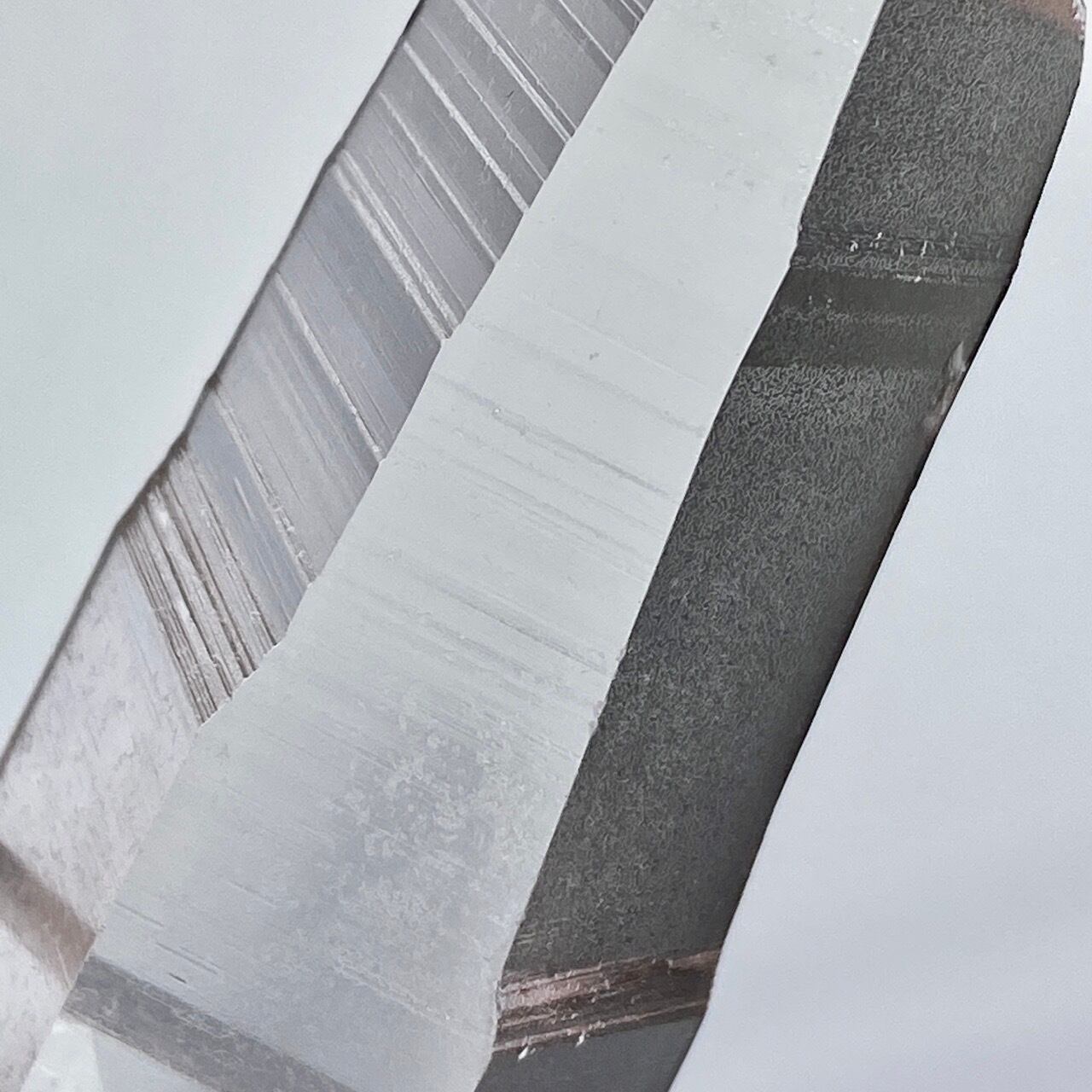 極めて透明度が高く、一番広い柱面から見えるサイドの柱面達がシルバーの鏡の様に輝き、レムリアンリッジ(条線)の美しさが際立ちます。