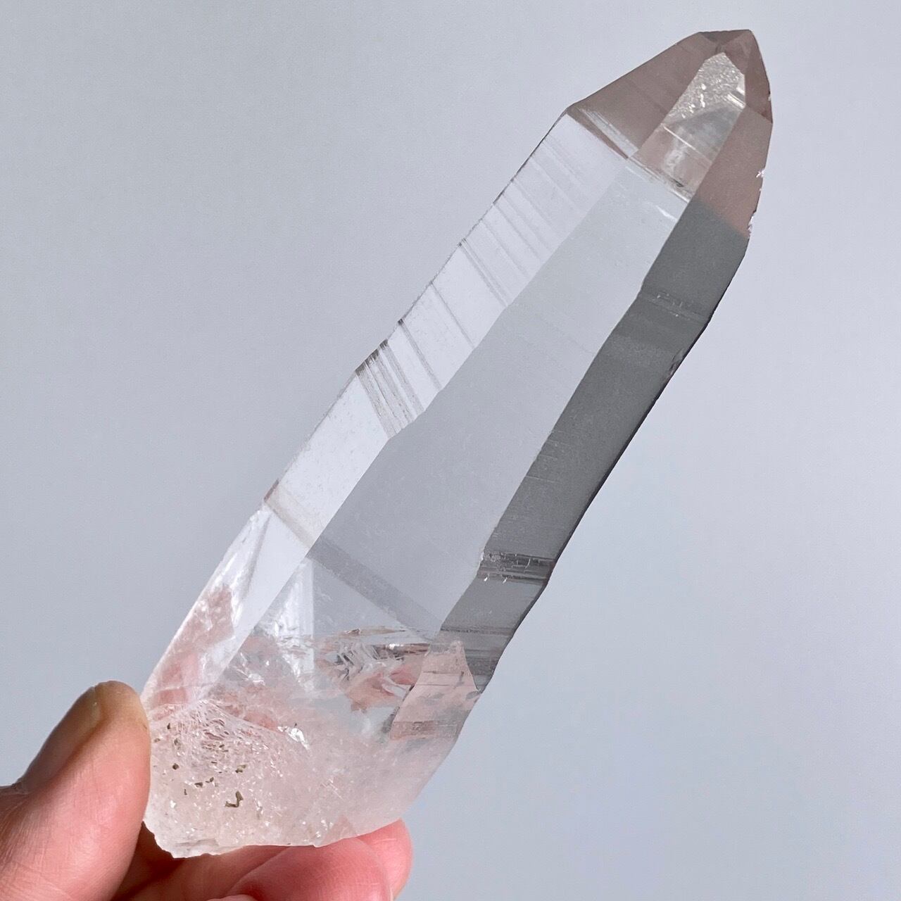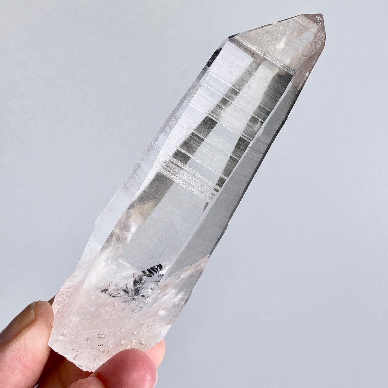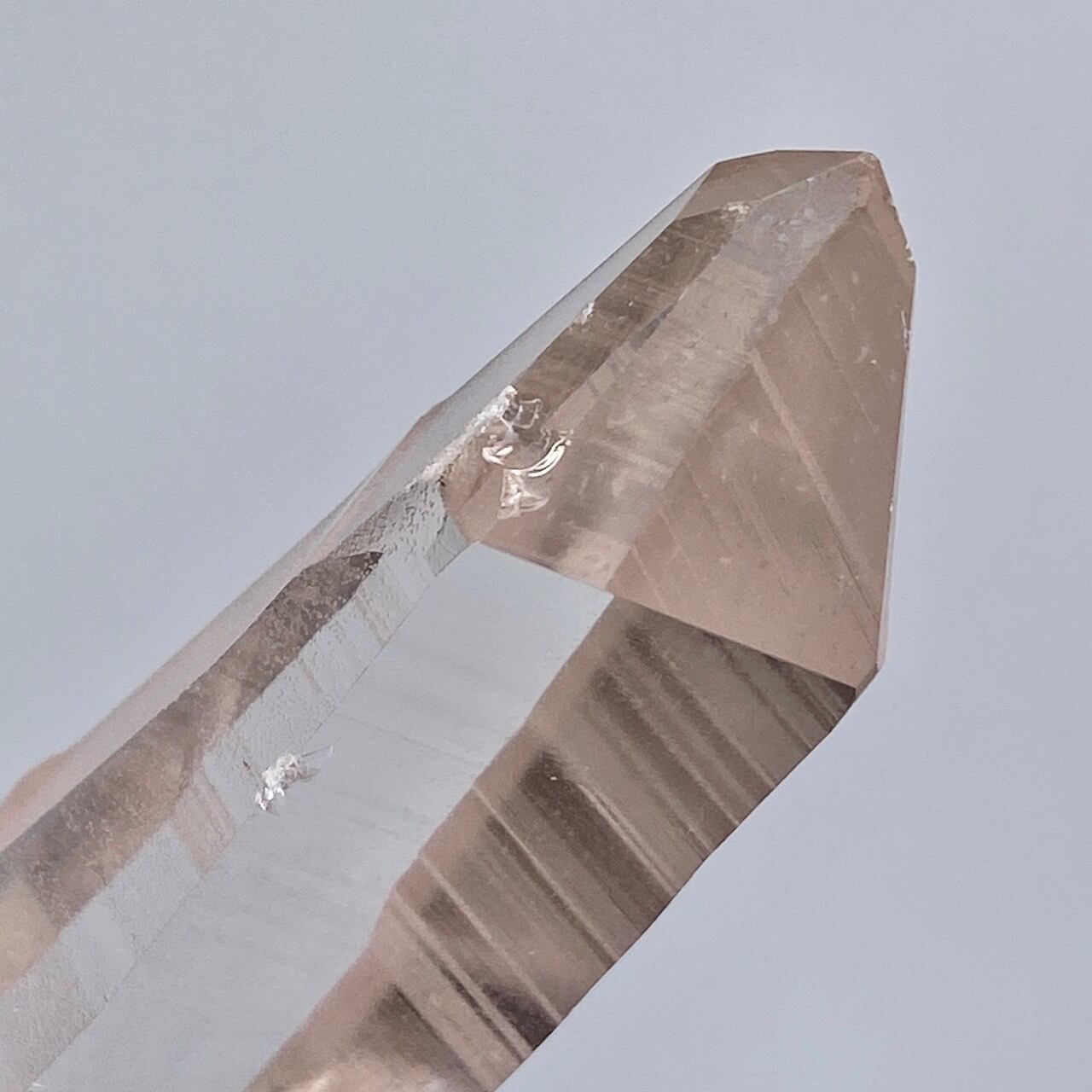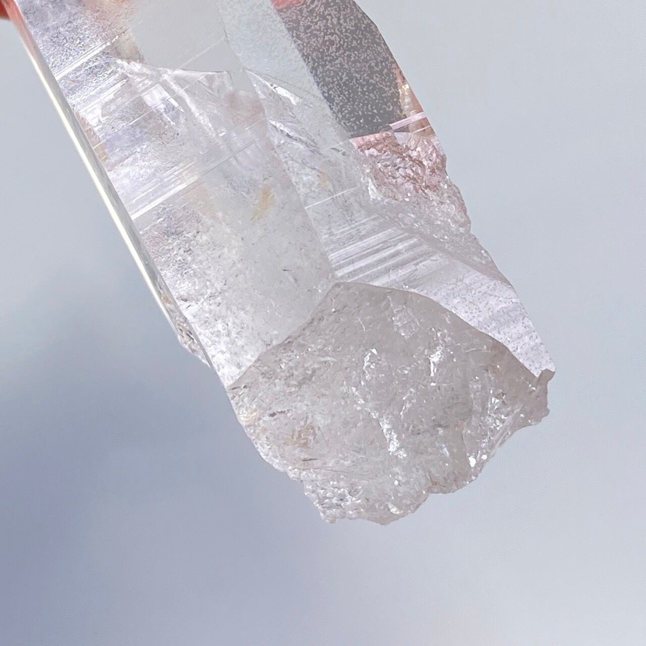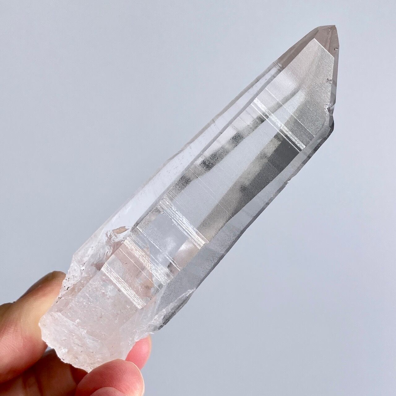 極めて透明度が高く、一番広い柱面から見えるサイドの柱面達がシルバーの鏡の様に輝き、レムリアンリッジ(条線)の美しさが際立ちます。