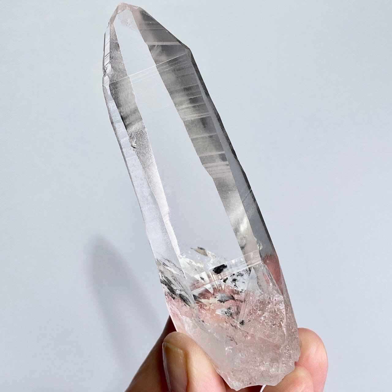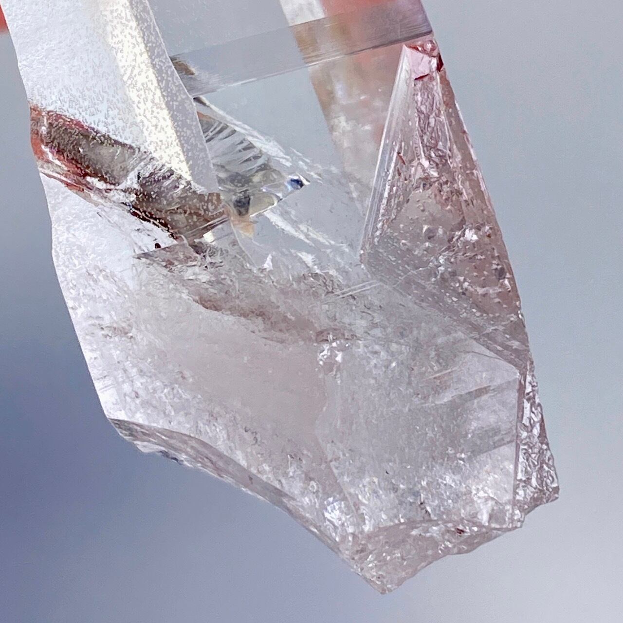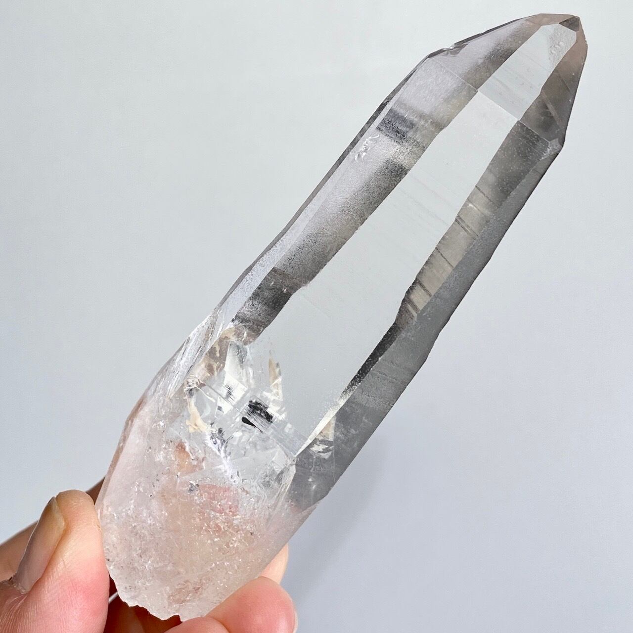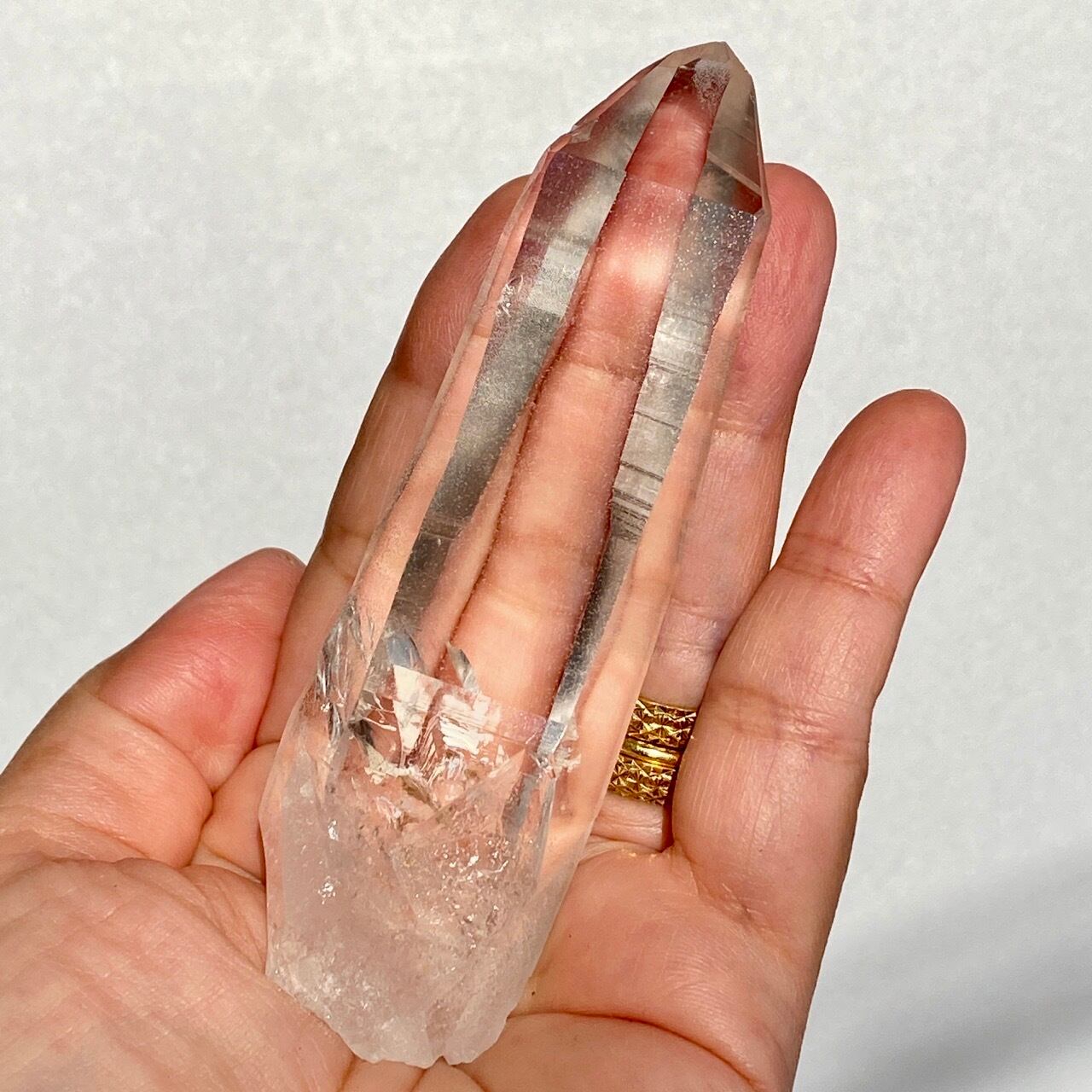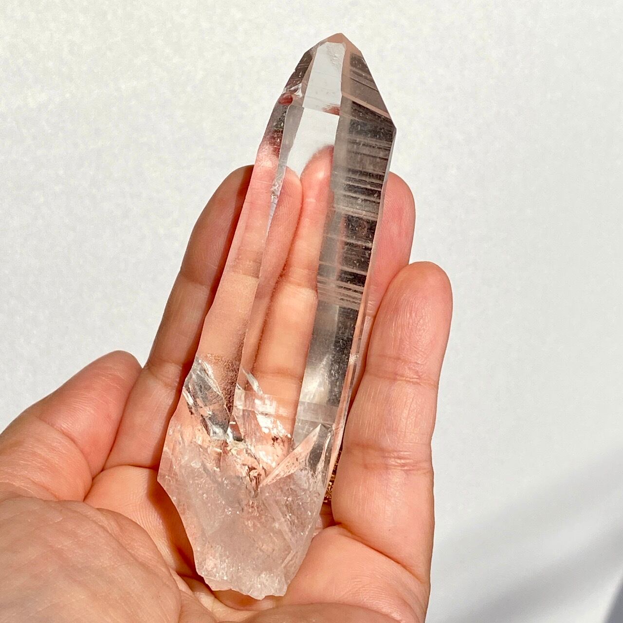 極めて透明度が高く、一番広い柱面から見えるサイドの柱面達がシルバーの鏡の様に輝き、レムリアンリッジ(条線)の美しさが際立ちます。