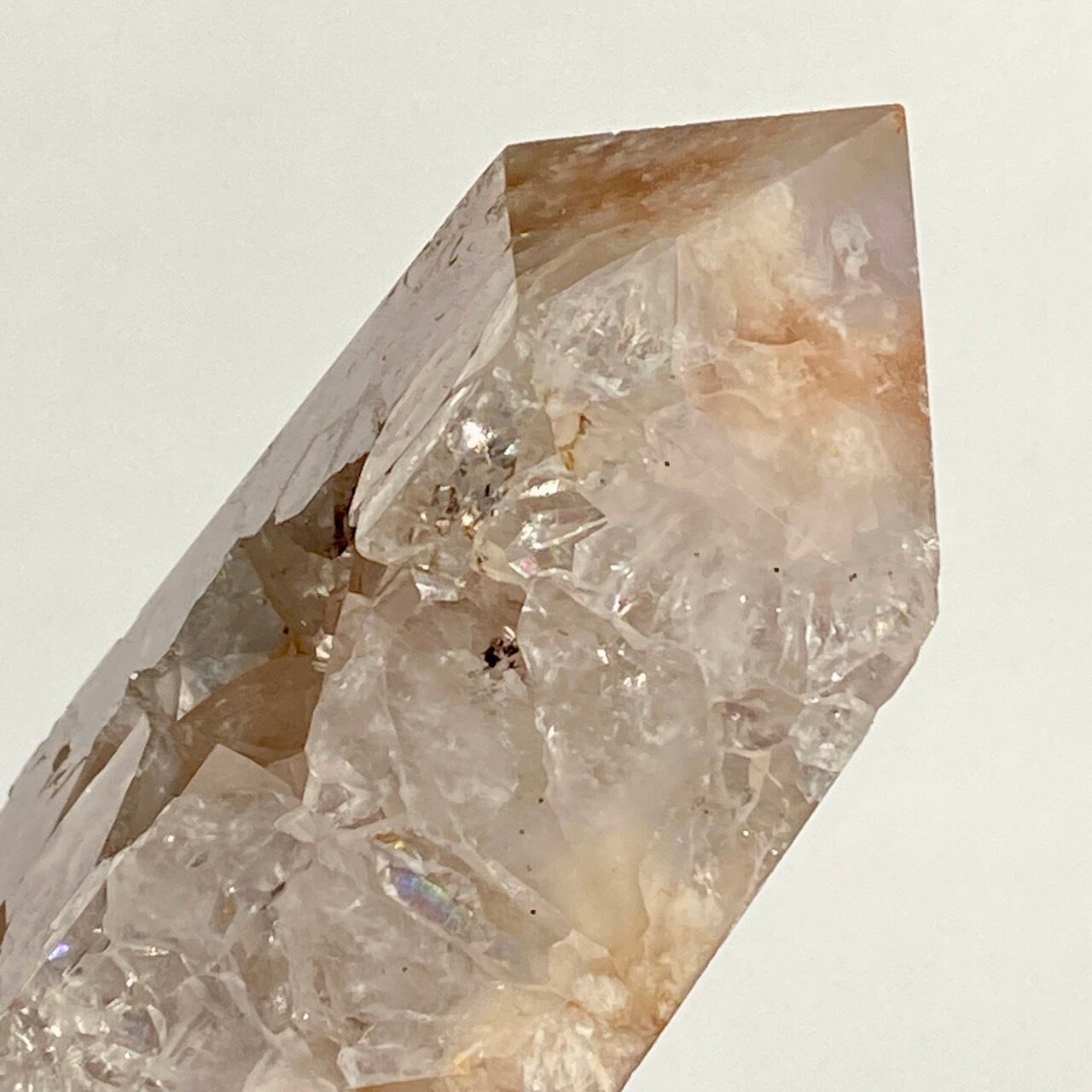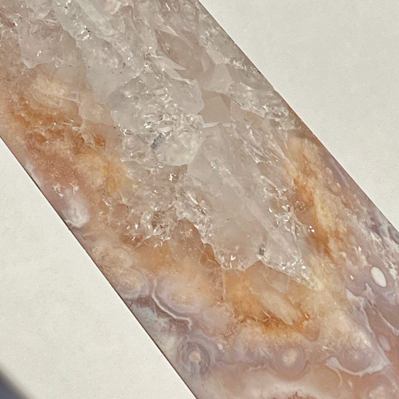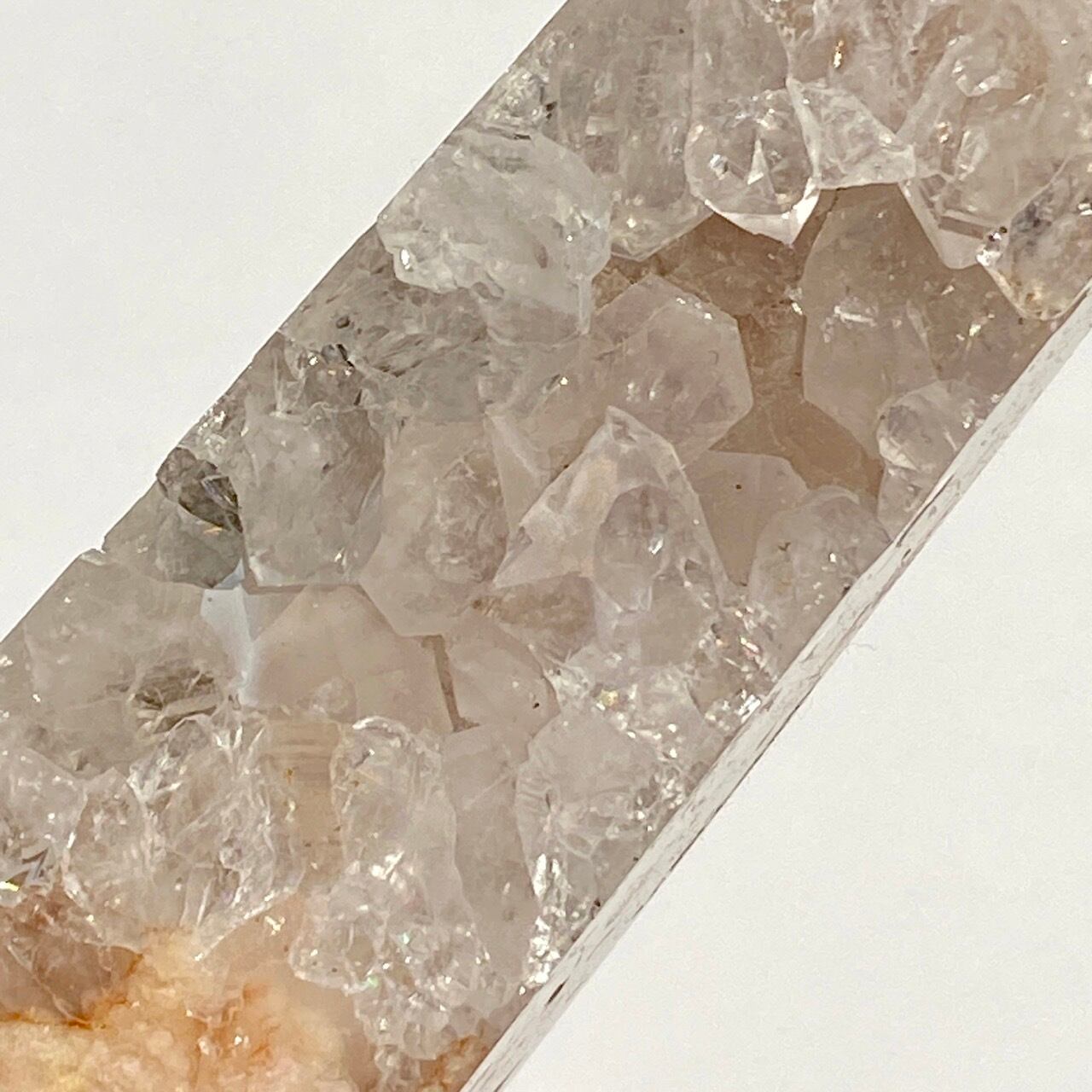 白にグレーがブレンドしたベイスカラーに淡いアプリコットの花やオーブ、そしてクォーツのドゥルージーが美しい子です。クォーツのコロコロザクザク感と鉱物ライトを当てたときのクォーツの表情と煌めきが魅力的です。