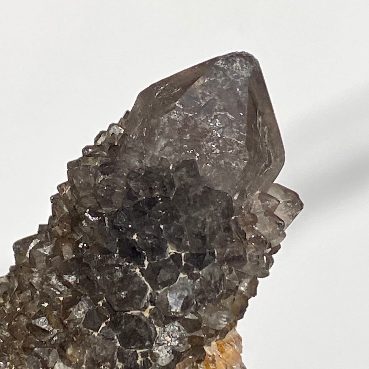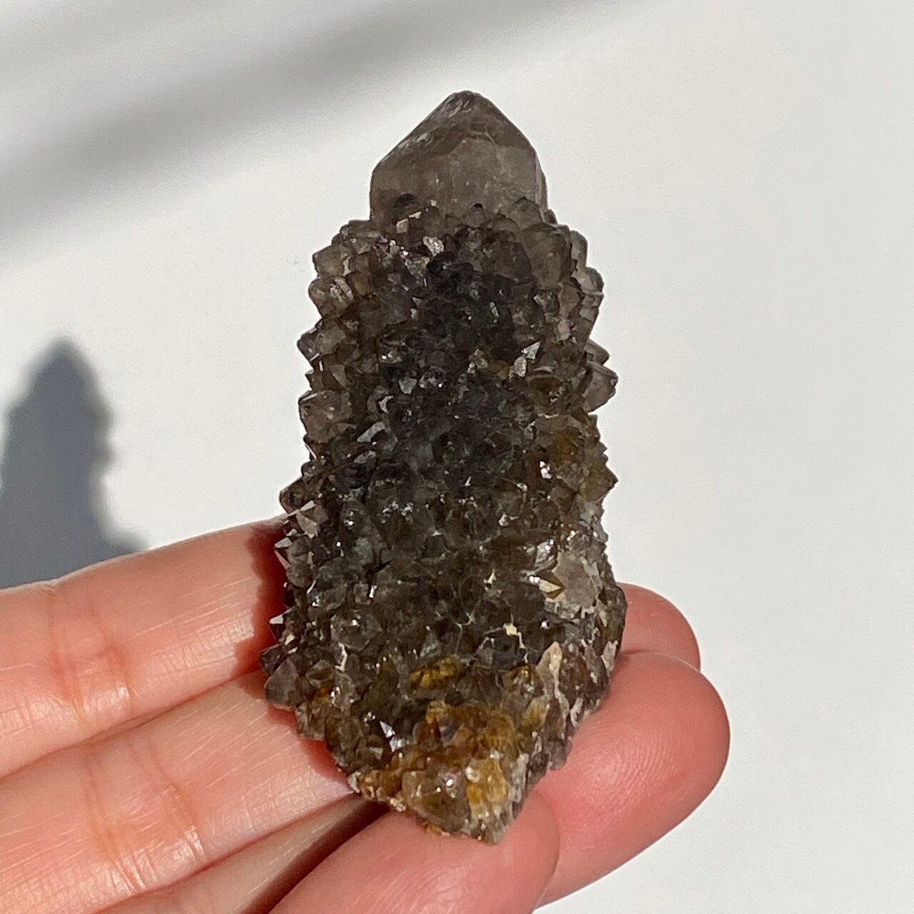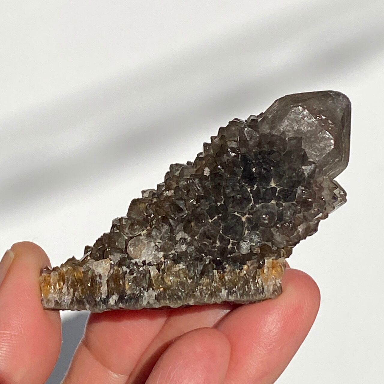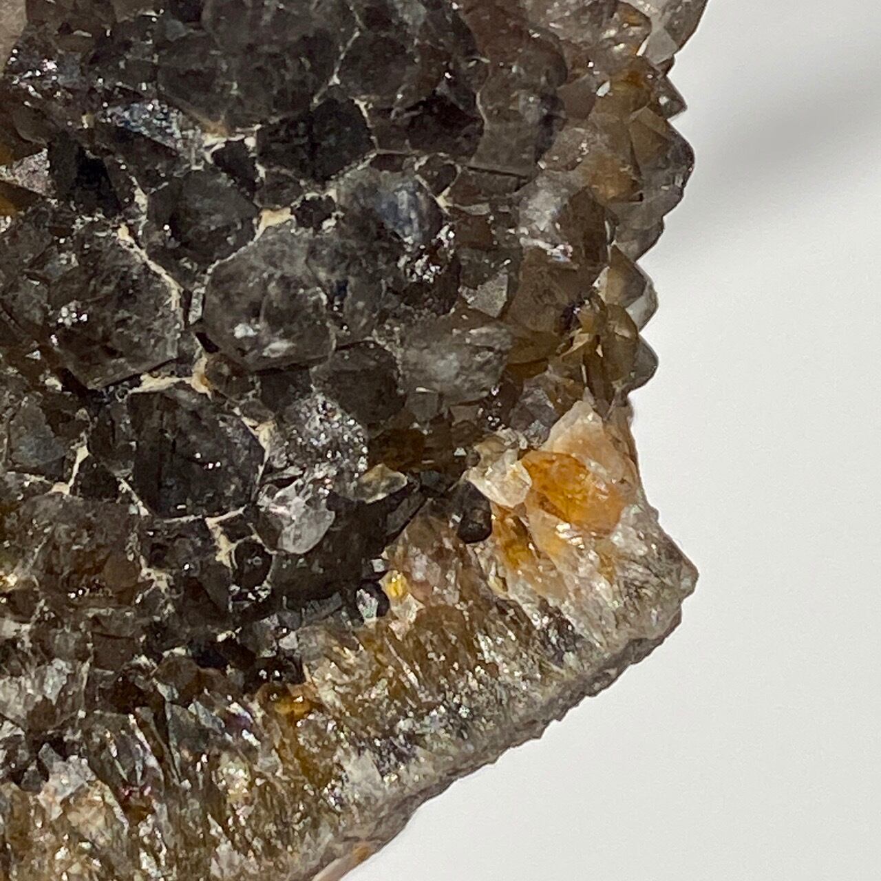 より黒っぽく写っている画像がありますが、実際はチャコールグレーにスモーキークォーツの茶色いがブレンドしたような色味です。下部にヘマタイトの影響かオレンジの色味も見られます。切断面で自立します。