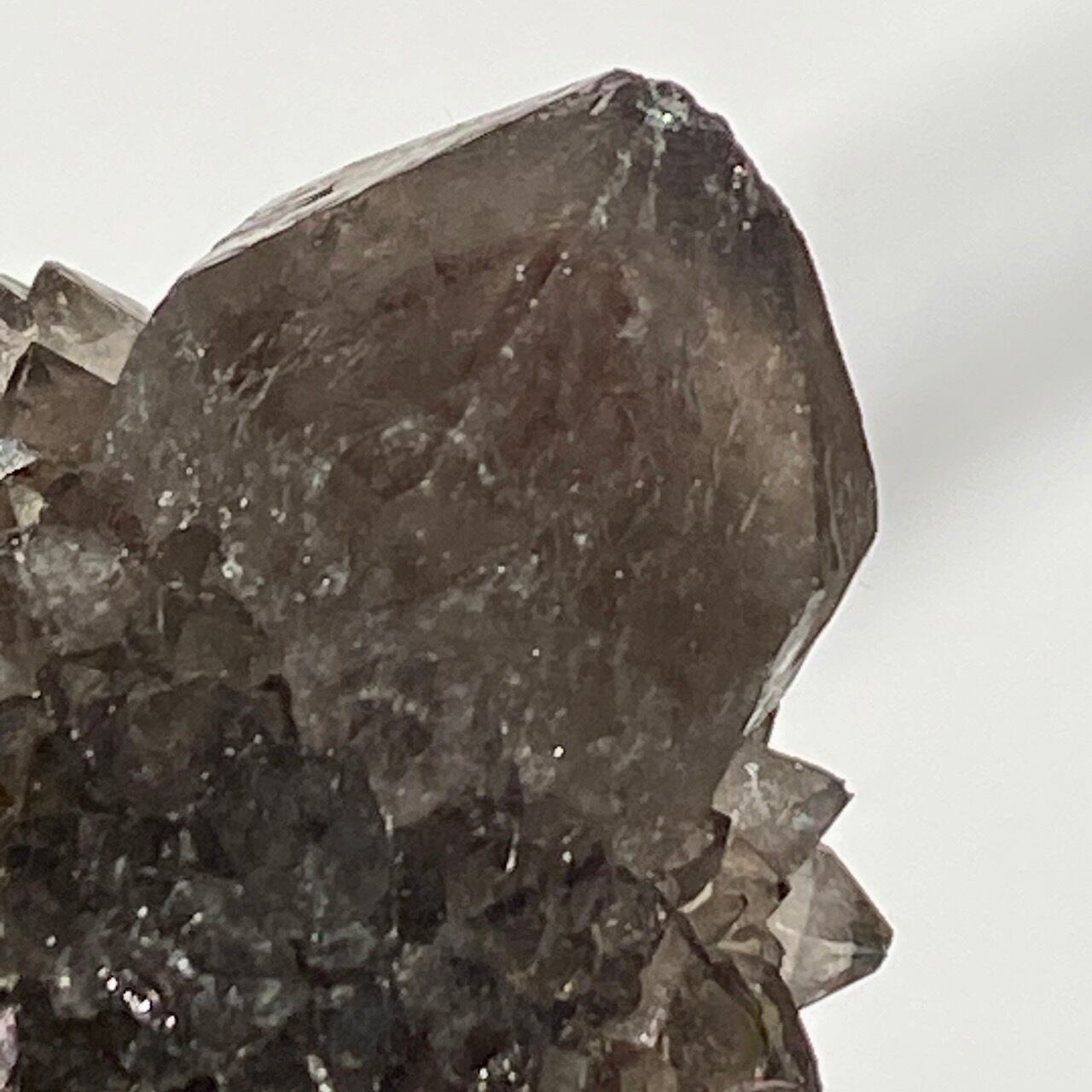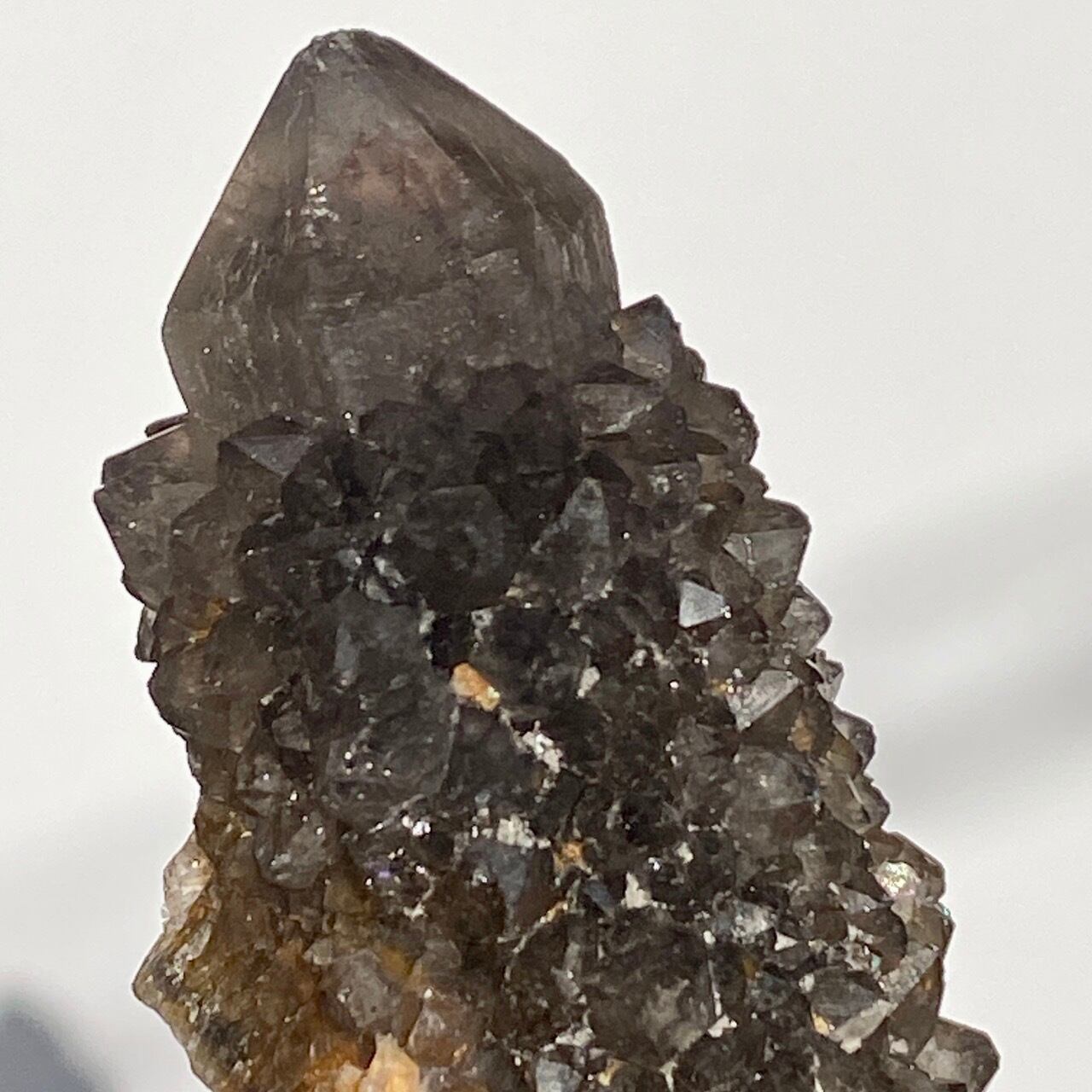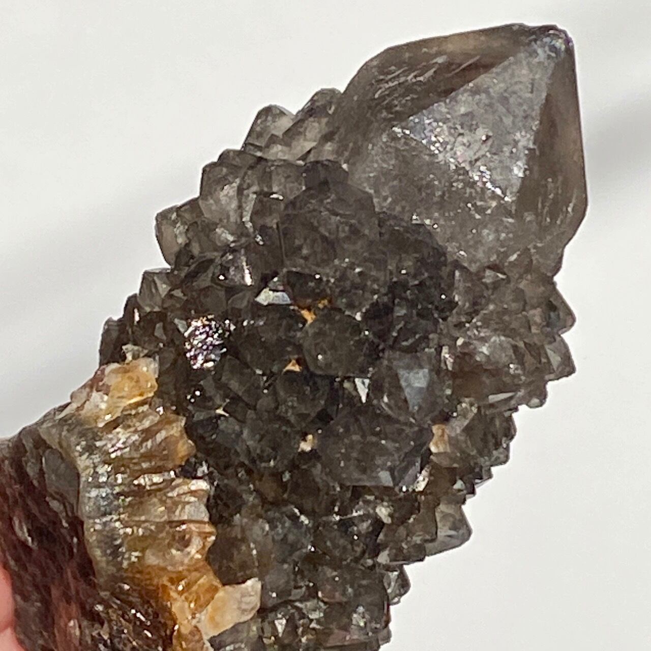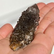 より黒っぽく写っている画像がありますが、実際はチャコールグレーにスモーキークォーツの茶色いがブレンドしたような色味です。下部にヘマタイトの影響かオレンジの色味も見られます。切断面で自立します。