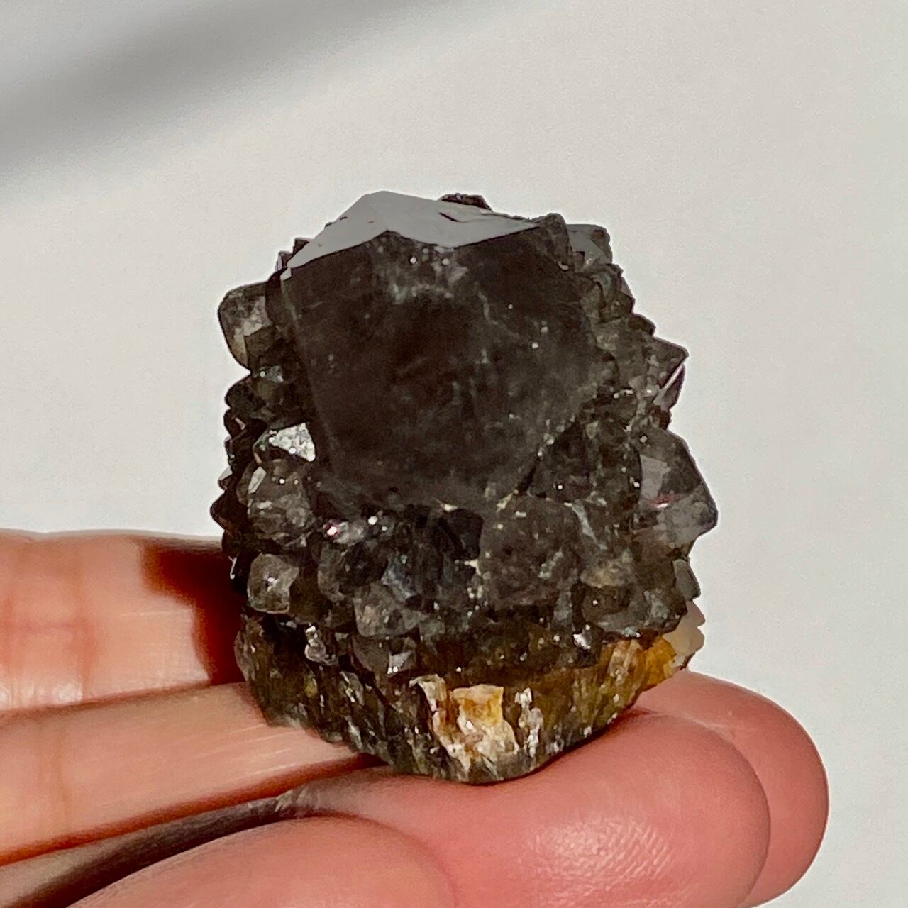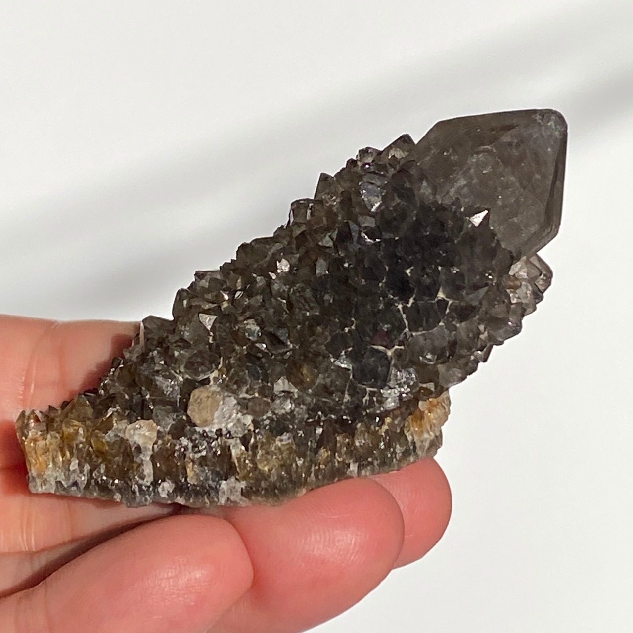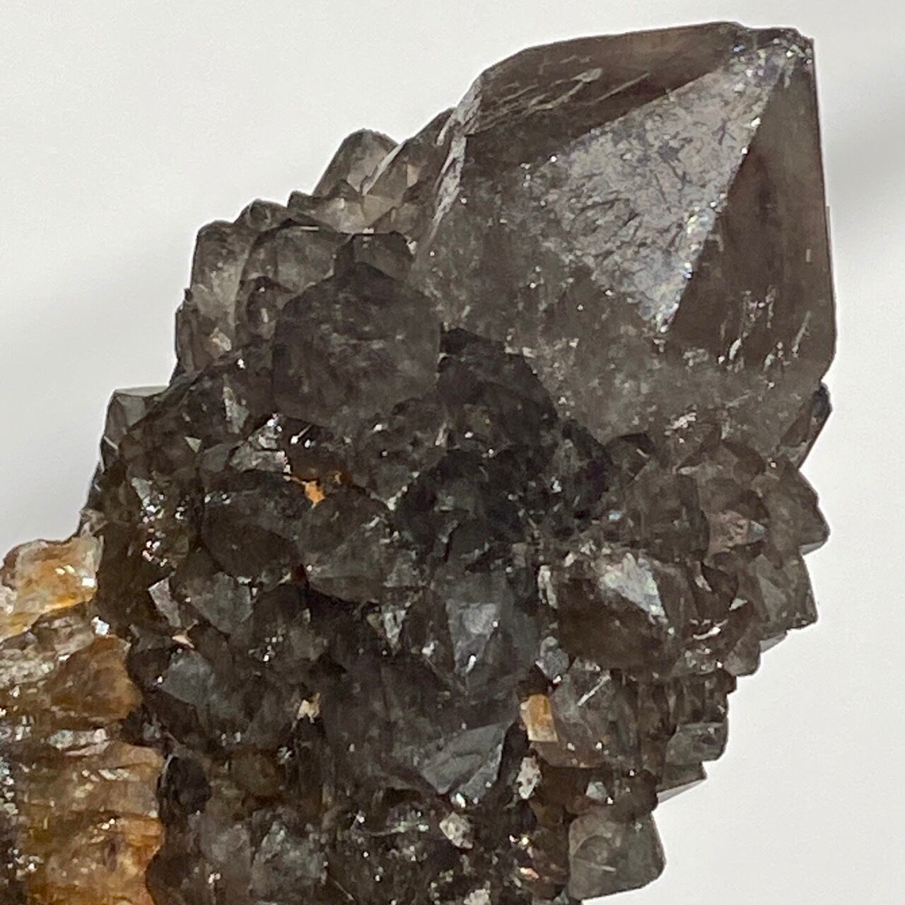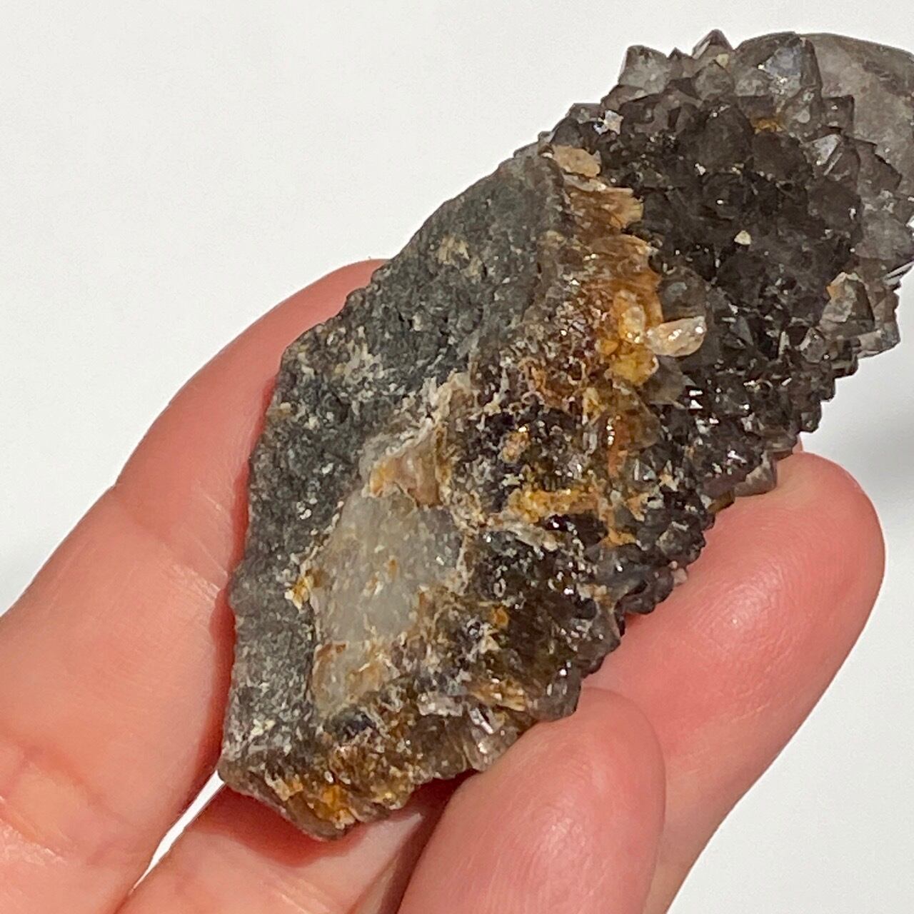 より黒っぽく写っている画像がありますが、実際はチャコールグレーにスモーキークォーツの茶色いがブレンドしたような色味です。下部にヘマタイトの影響かオレンジの色味も見られます。切断面で自立します。