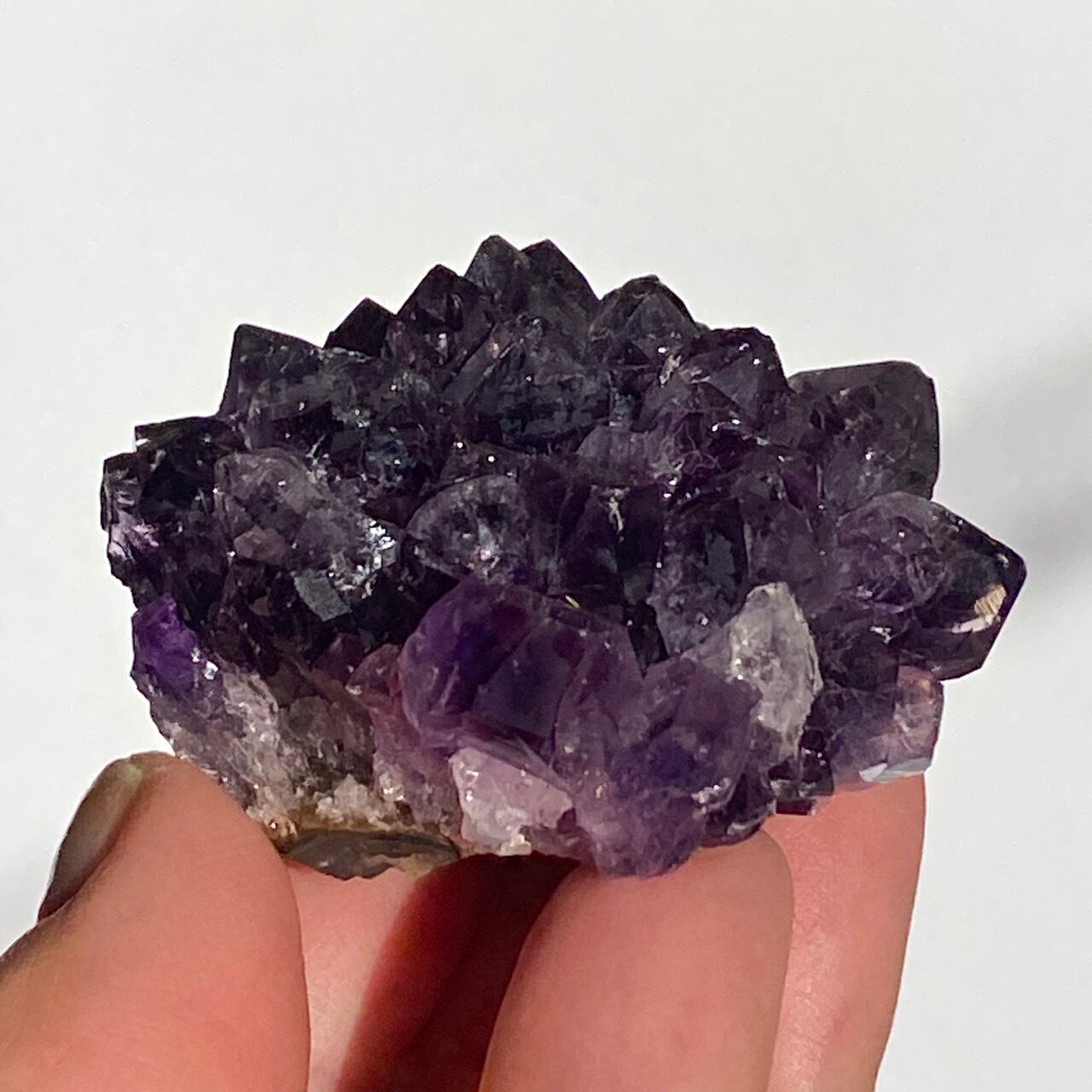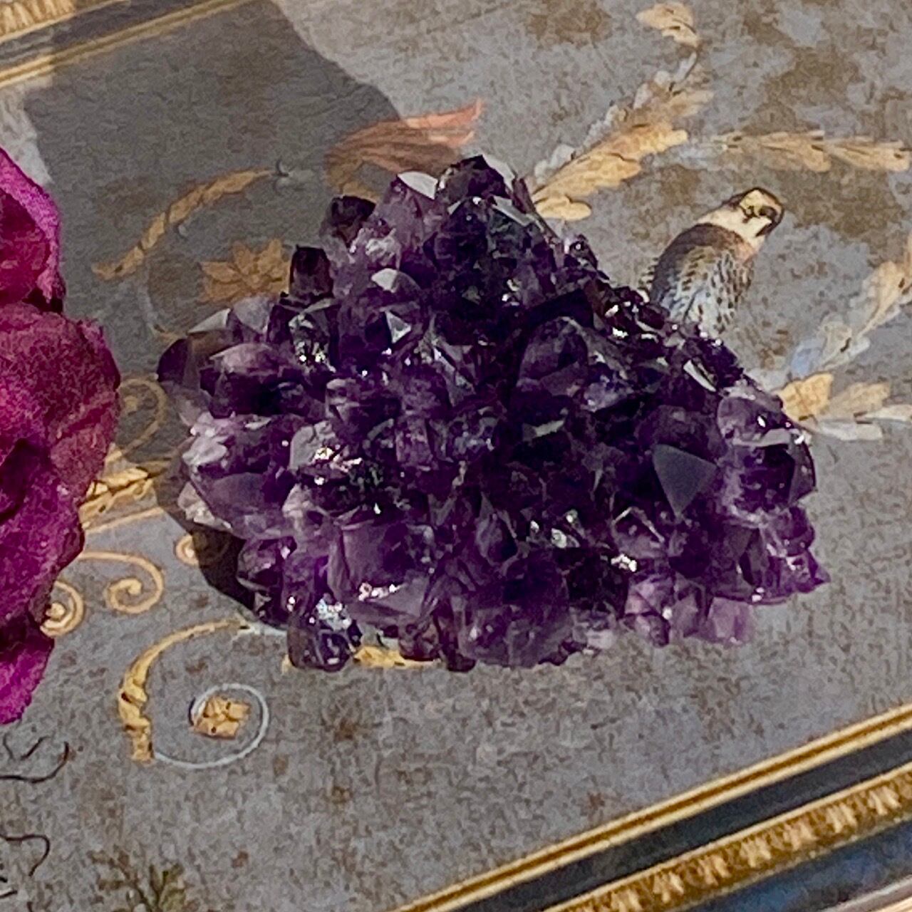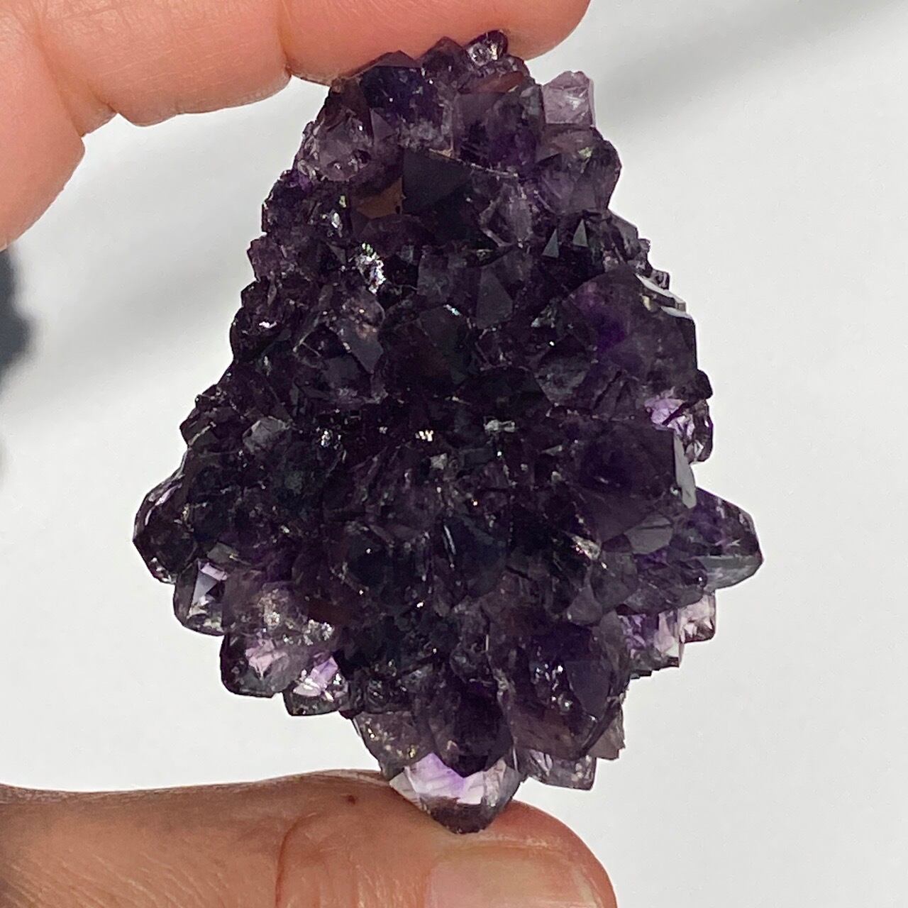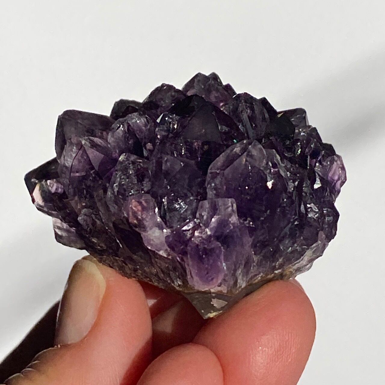 詳しくは、スタラクタイト(鍾乳石 *石灰岩の洞窟で形成されるつらら状の石)の先端部分で、市場で見かけるスライスとは違い先端部分は限られた数量である事、またこのバラの花が開いた様な美しい形状である事から、このな小さなクラスターは通常のアメジストより高値で取引されています。