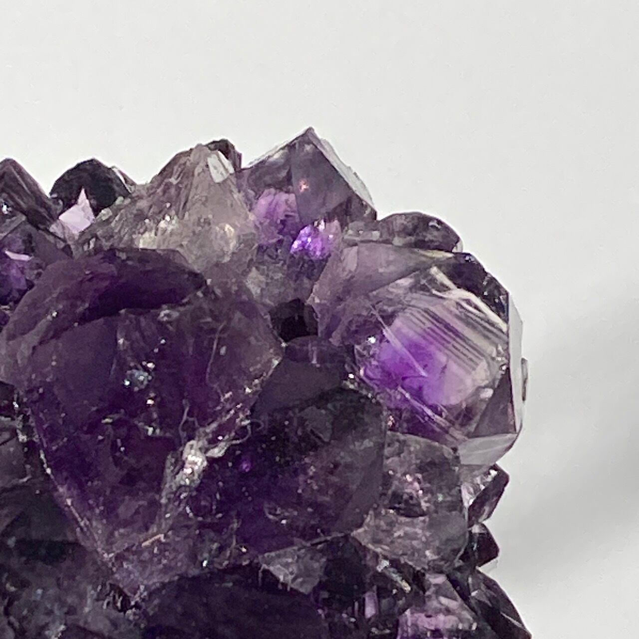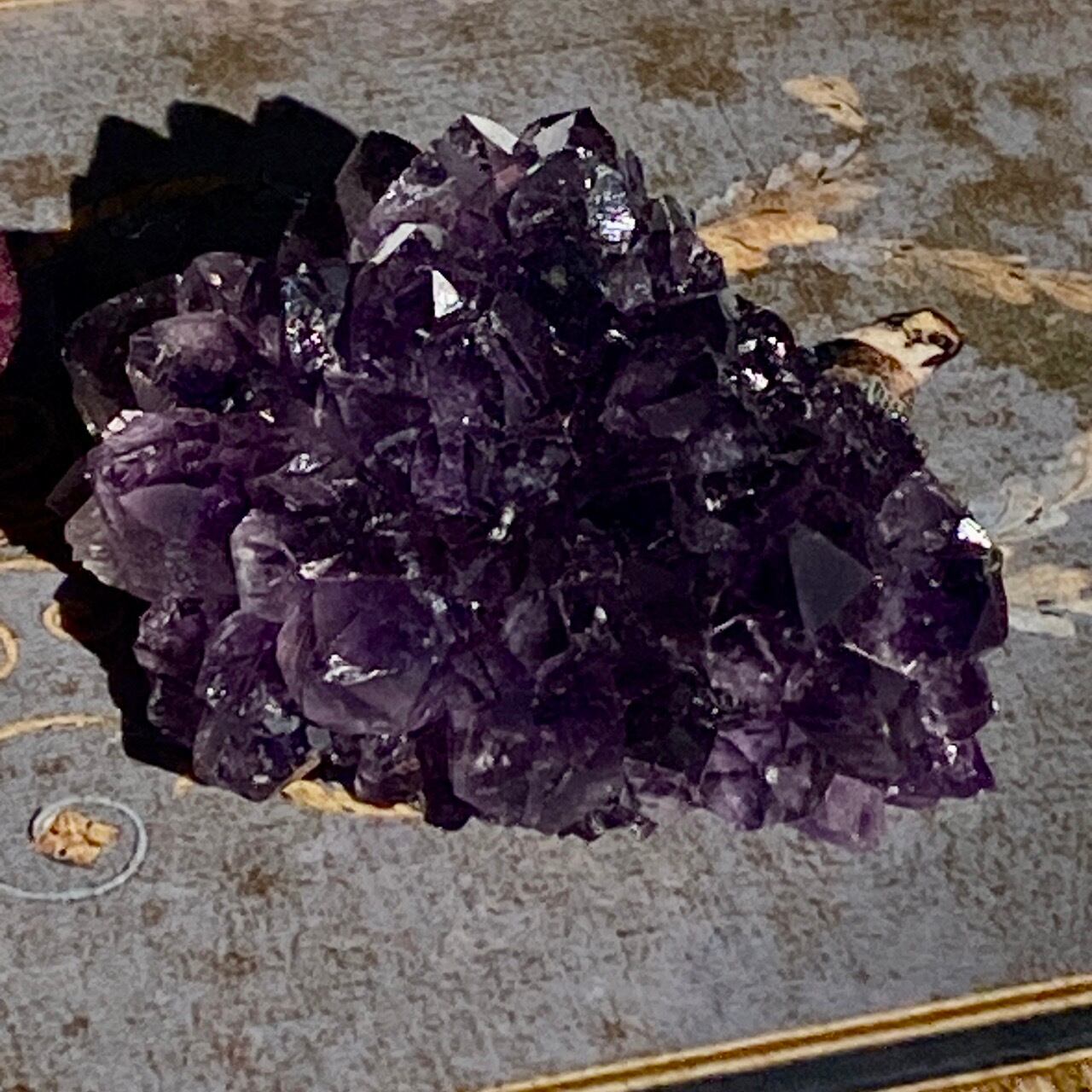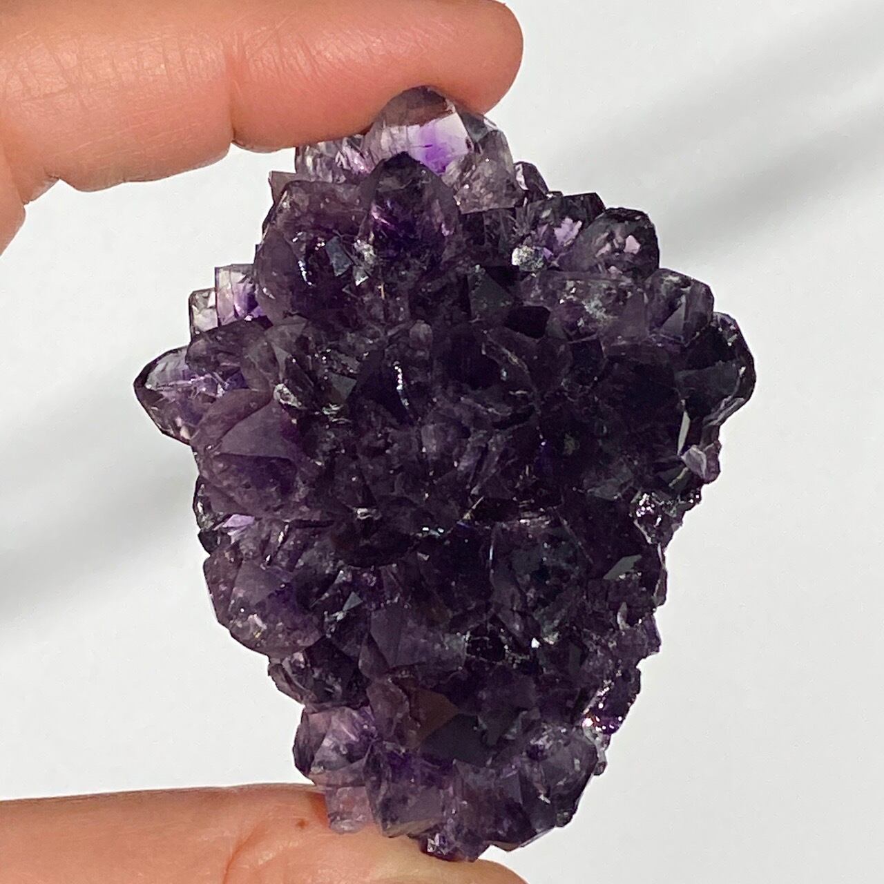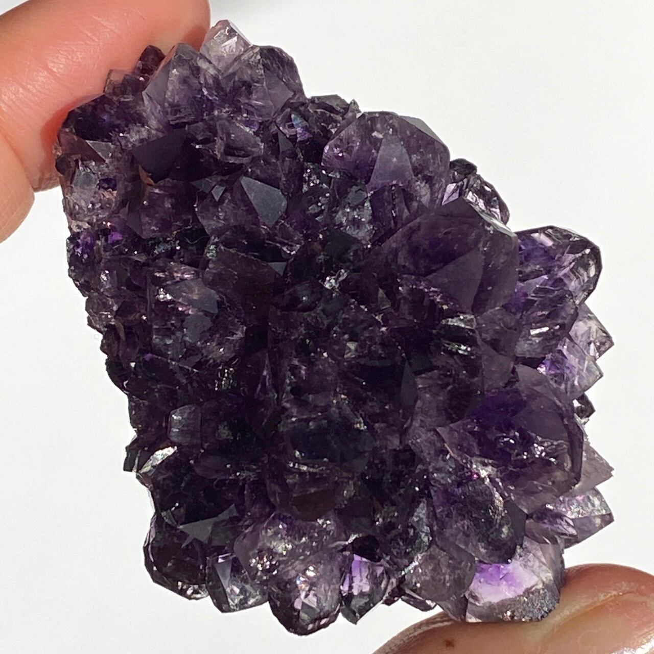 詳しくは、スタラクタイト(鍾乳石 *石灰岩の洞窟で形成されるつらら状の石)の先端部分で、市場で見かけるスライスとは違い先端部分は限られた数量である事、またこのバラの花が開いた様な美しい形状である事から、このな小さなクラスターは通常のアメジストより高値で取引されています。