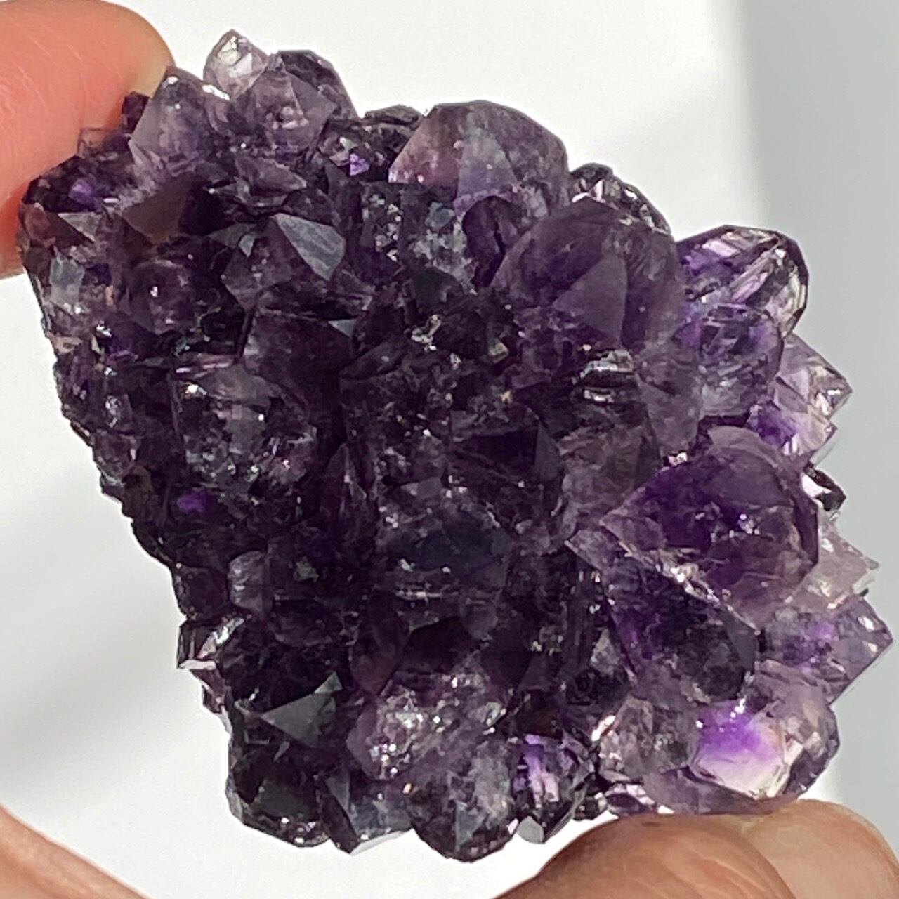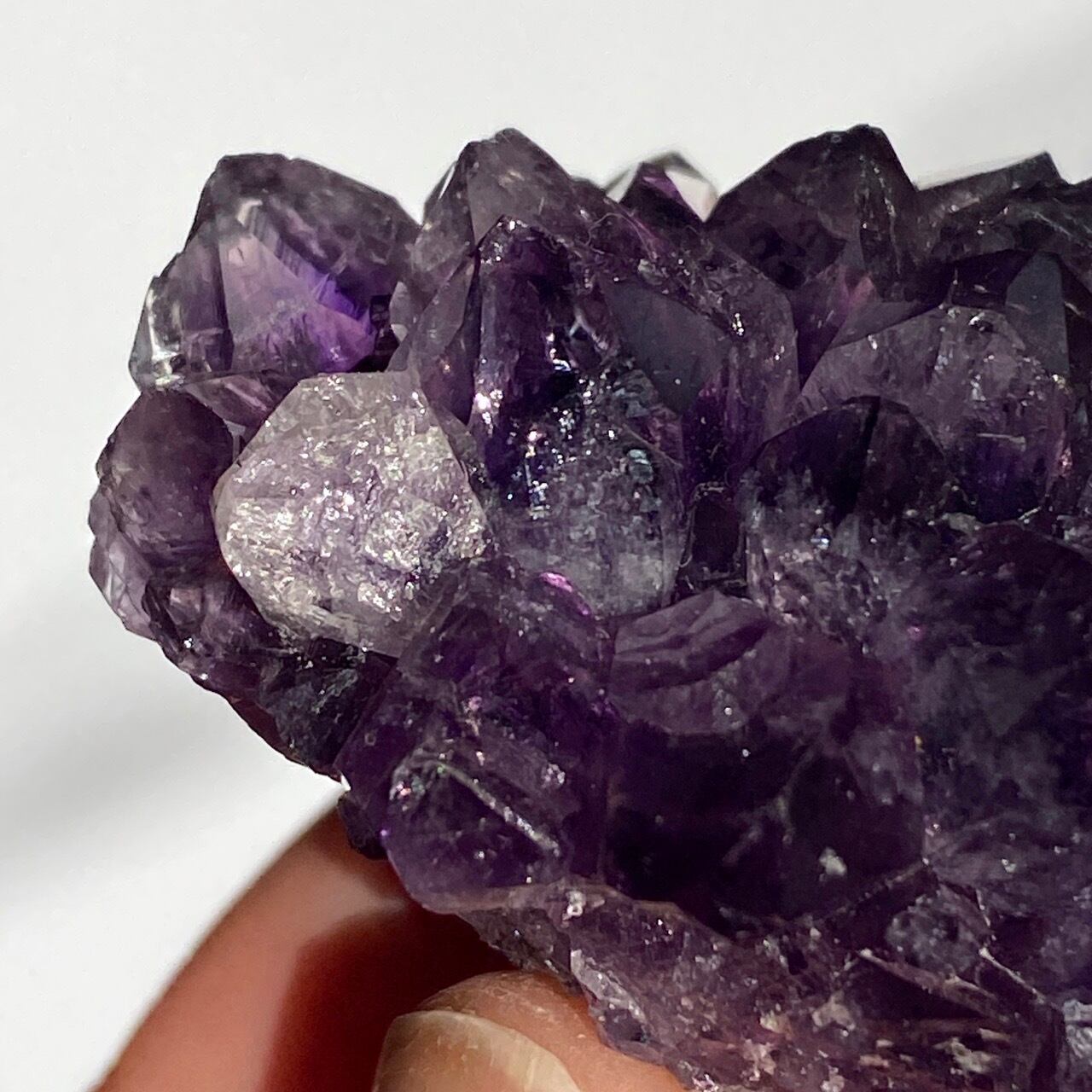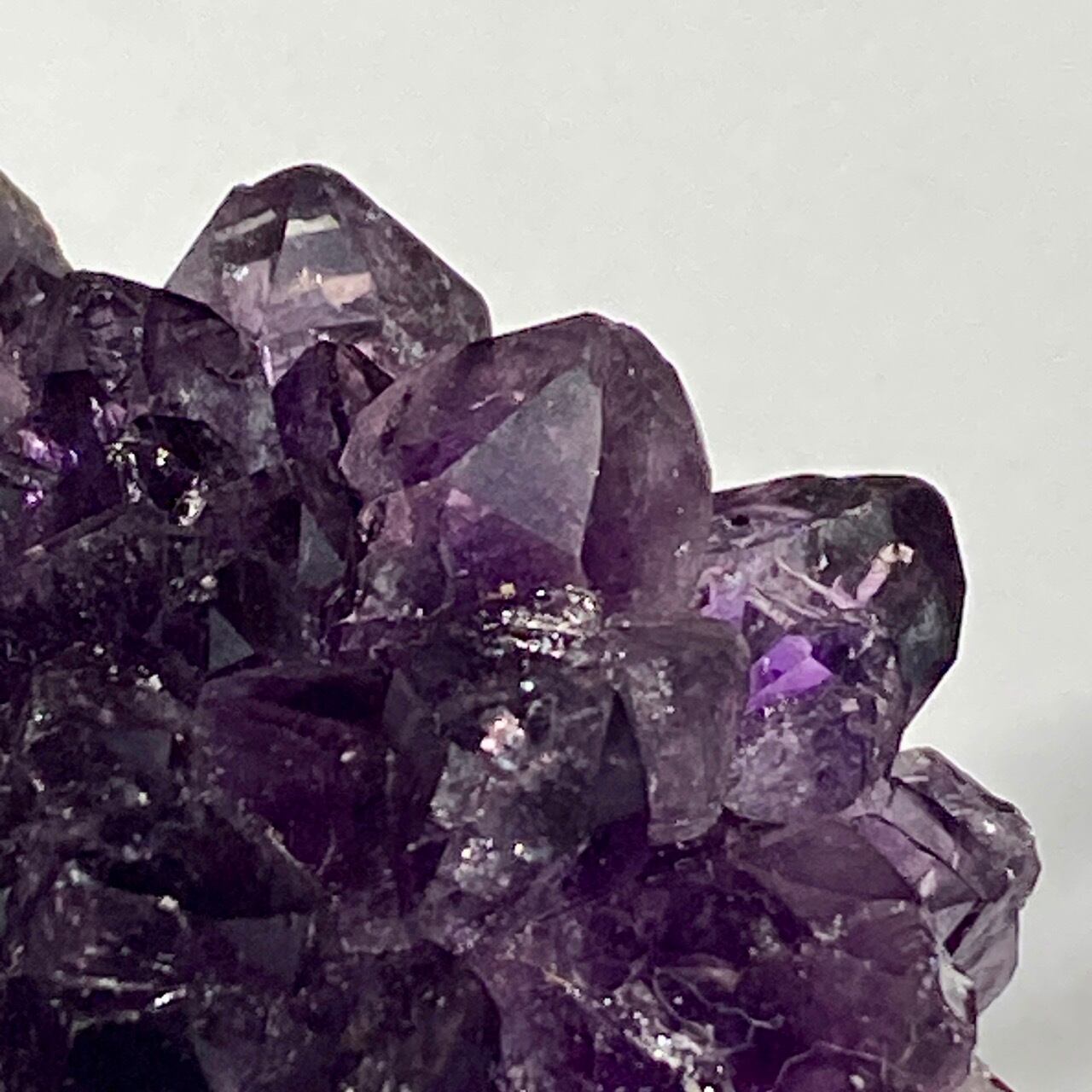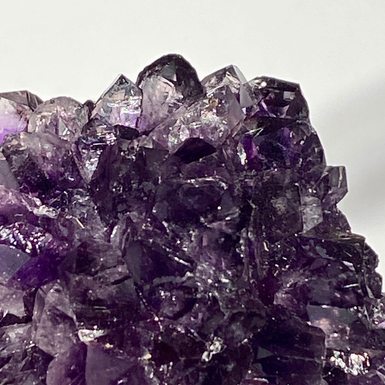 詳しくは、スタラクタイト(鍾乳石 *石灰岩の洞窟で形成されるつらら状の石)の先端部分で、市場で見かけるスライスとは違い先端部分は限られた数量である事、またこのバラの花が開いた様な美しい形状である事から、このな小さなクラスターは通常のアメジストより高値で取引されています。