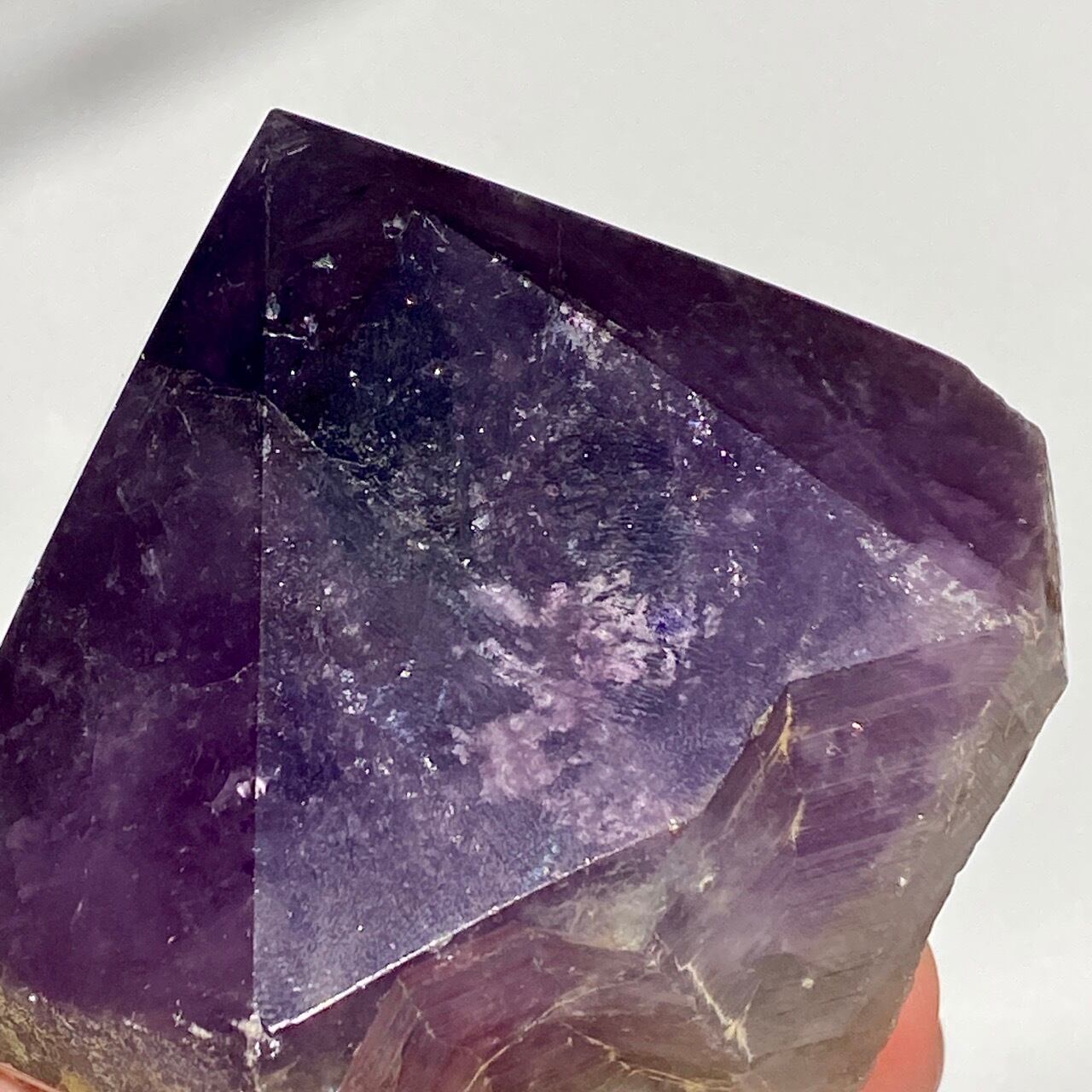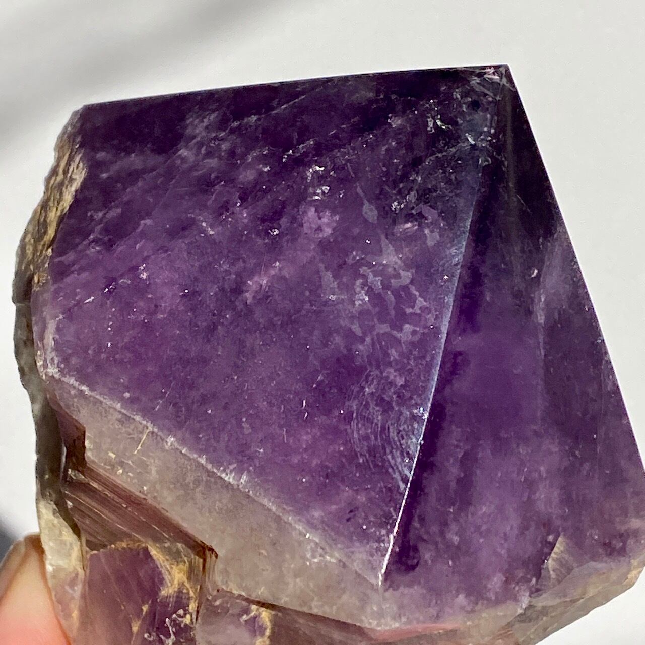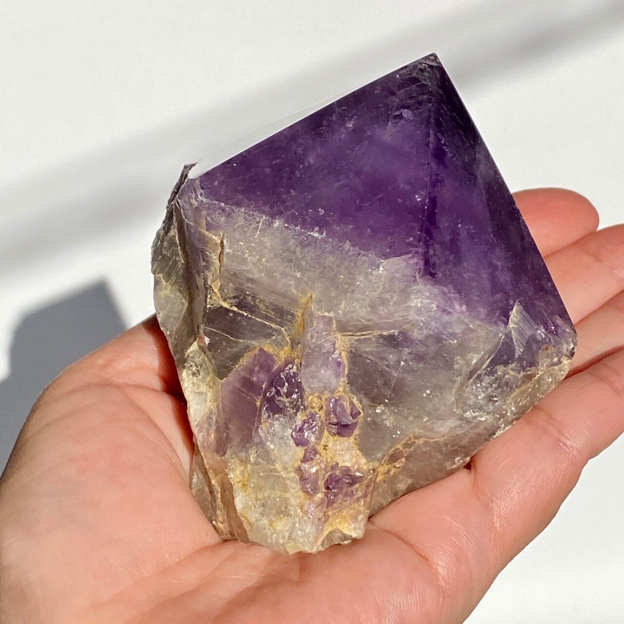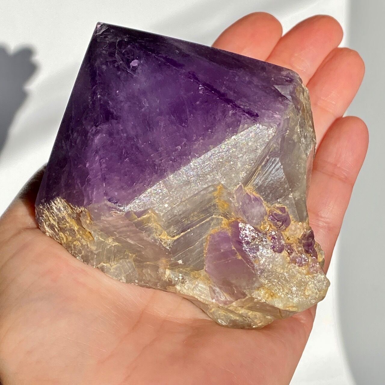 ラフ(原石)としてお迎えしましたが、ファセットの部分が超スムースなので、この部分のみ研磨されている可能性がございます。アメジストの採掘の際に、通常クラスターとは別に単体で採れるものもありますのでそのような子達のうちの1つなのかもしれません。