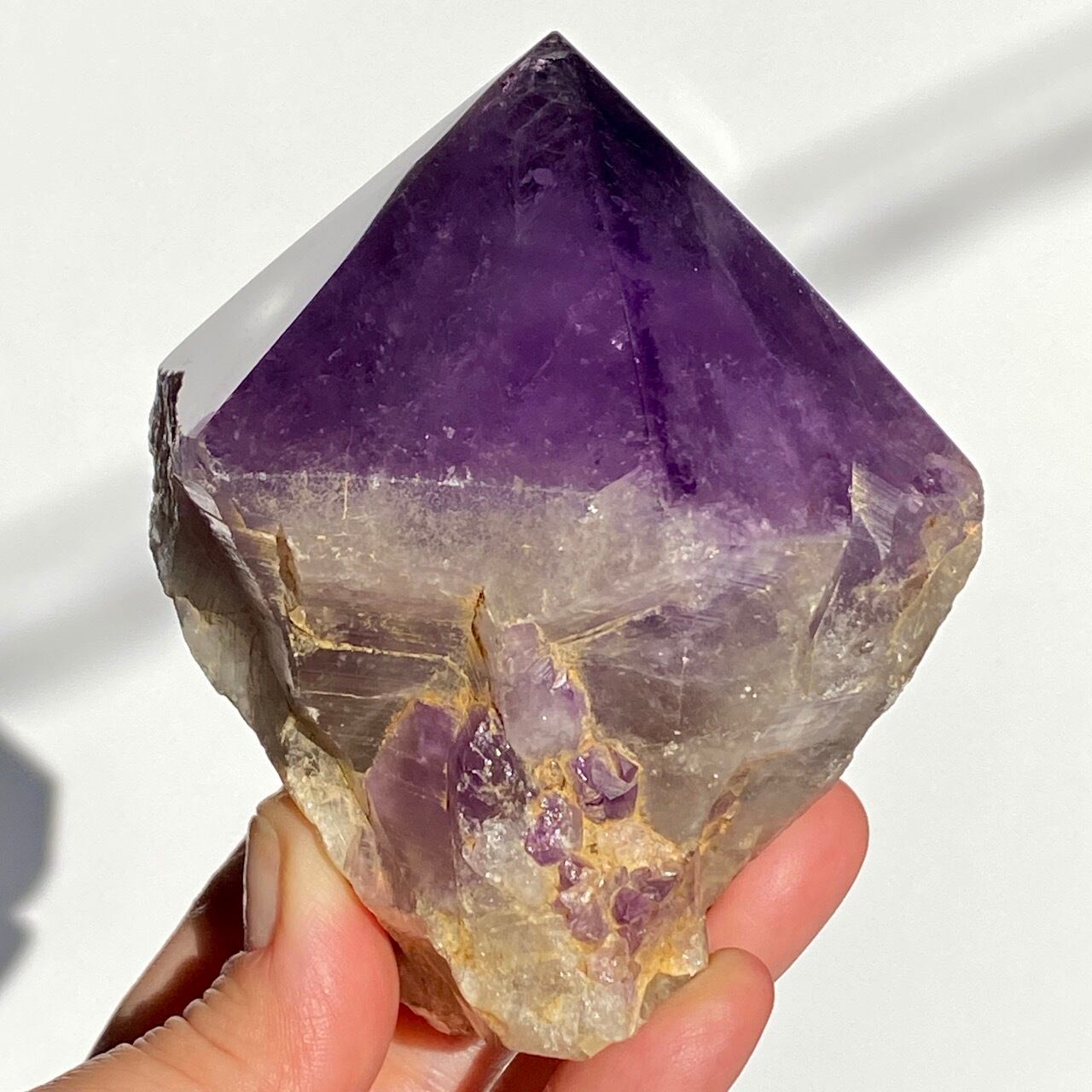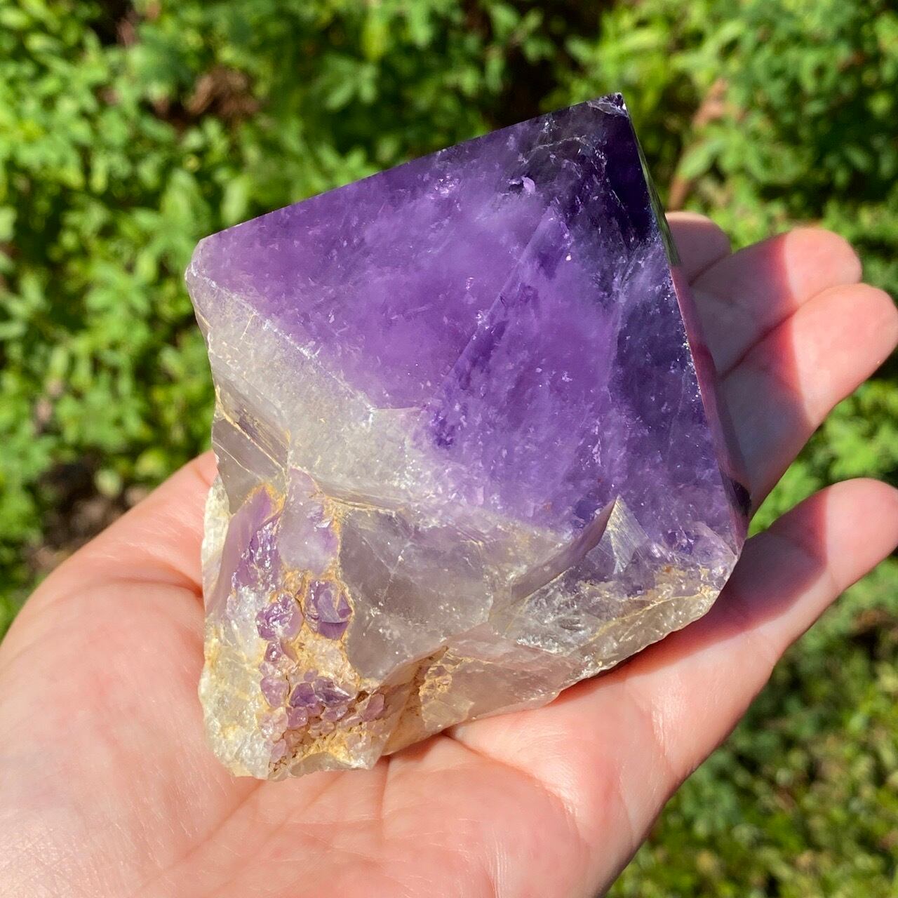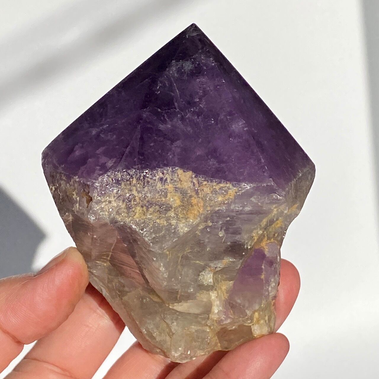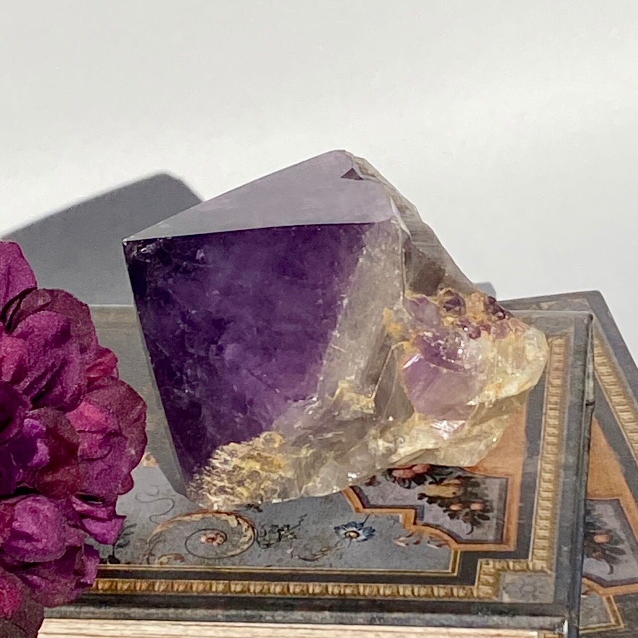ラフ(原石)としてお迎えしましたが、ファセットの部分が超スムースなので、この部分のみ研磨されている可能性がございます。アメジストの採掘の際に、通常クラスターとは別に単体で採れるものもありますのでそのような子達のうちの1つなのかもしれません。