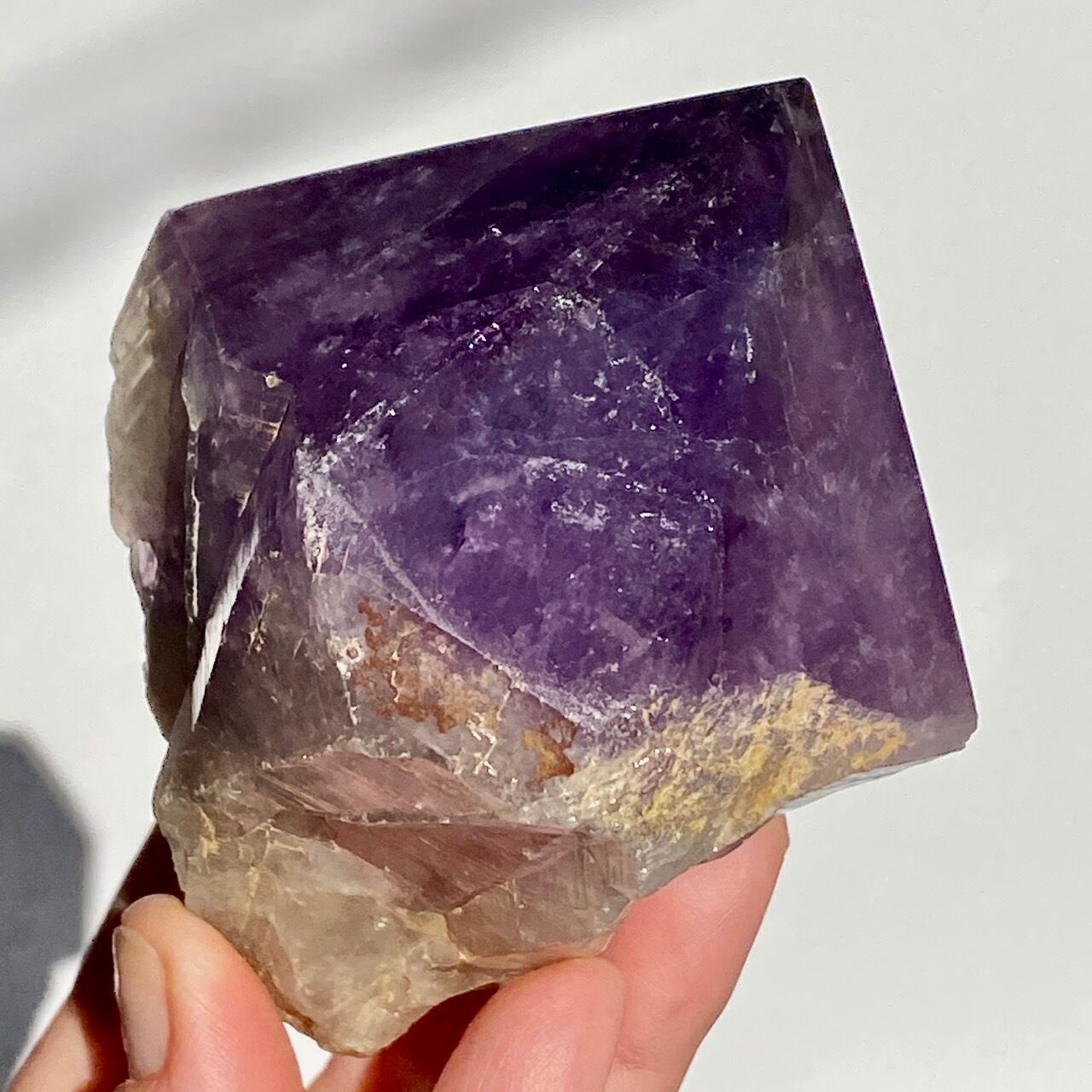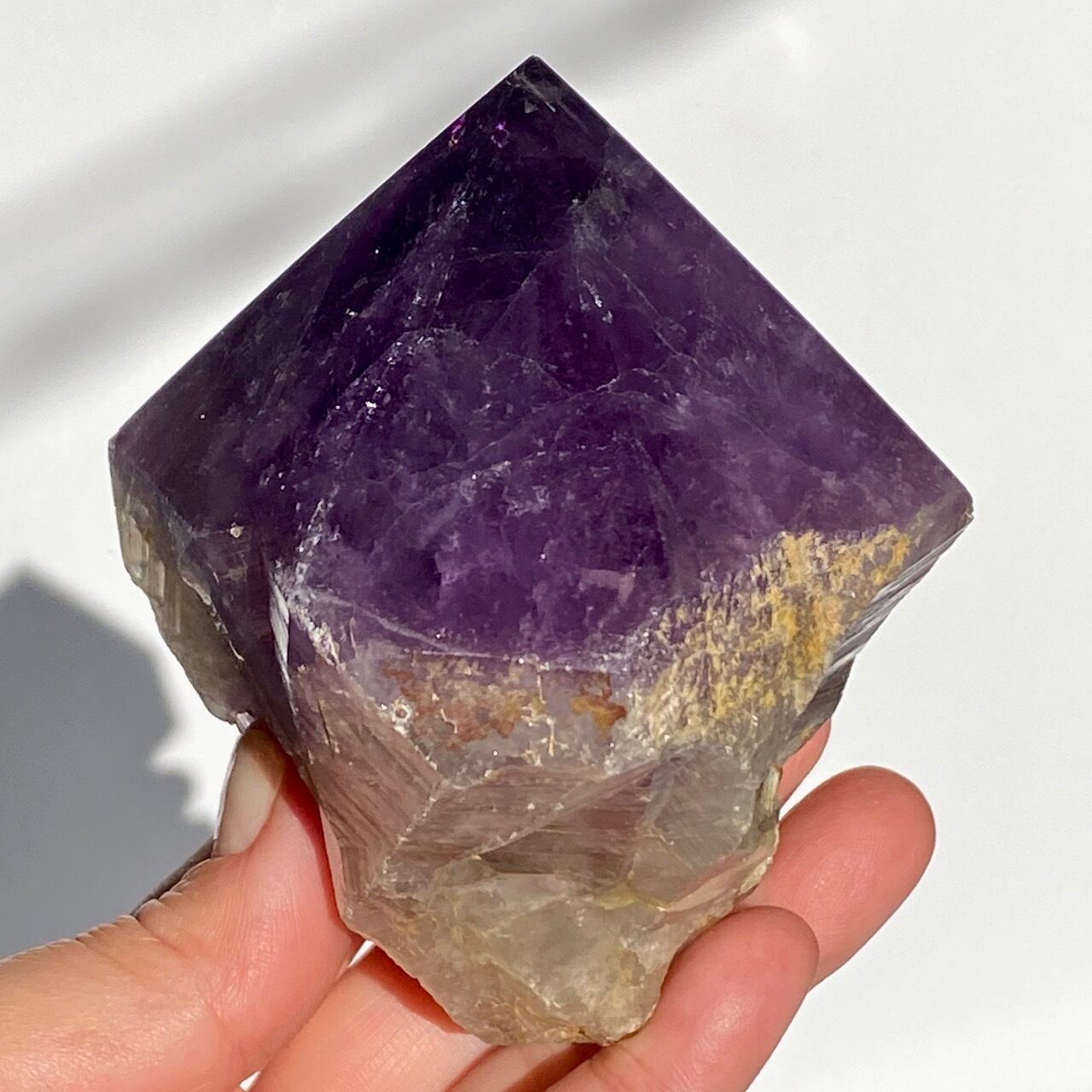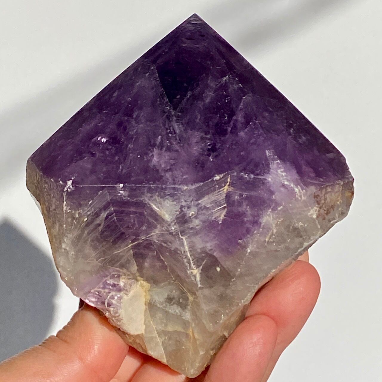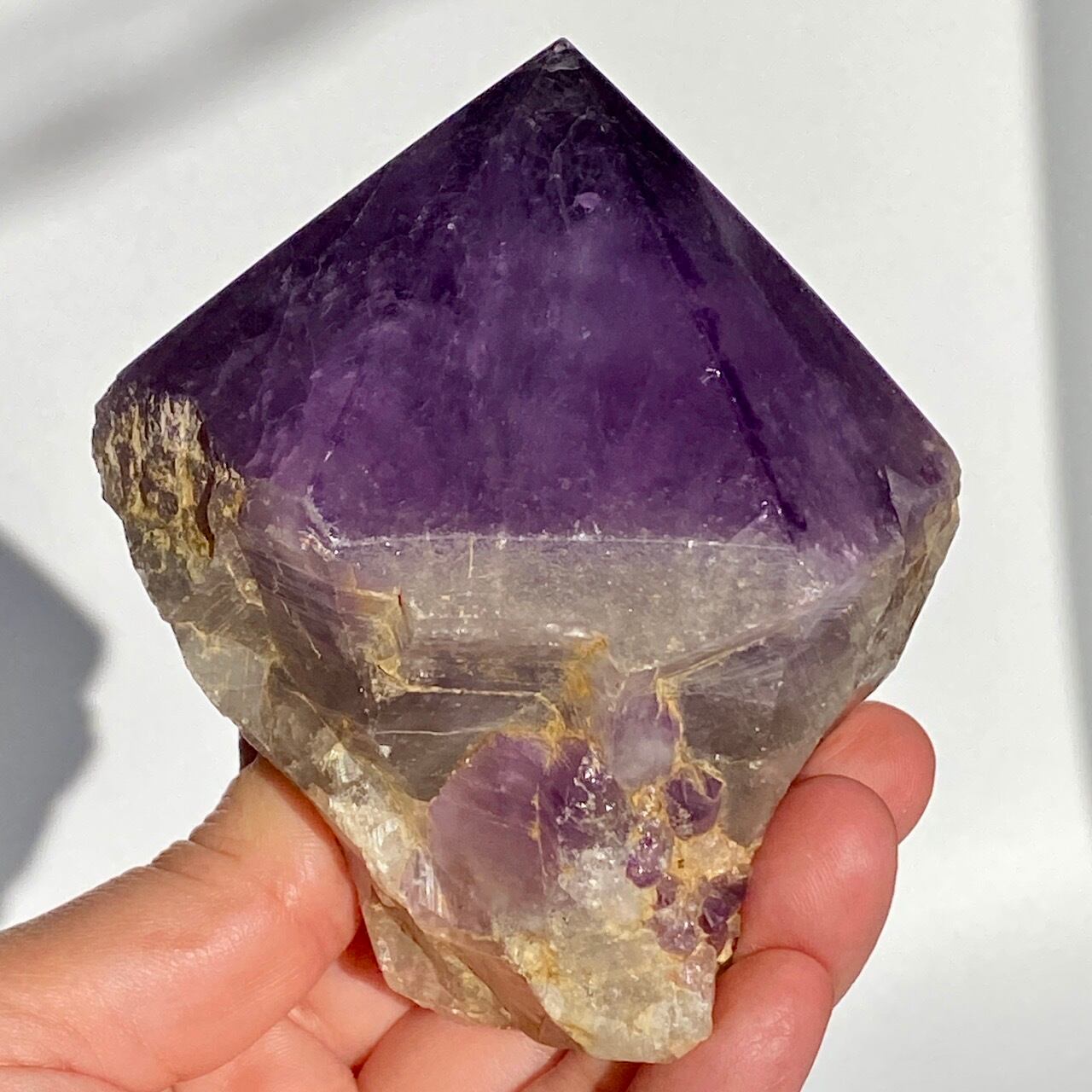 ラフ(原石)としてお迎えしましたが、ファセットの部分が超スムースなので、この部分のみ研磨されている可能性がございます。アメジストの採掘の際に、通常クラスターとは別に単体で採れるものもありますのでそのような子達のうちの1つなのかもしれません。