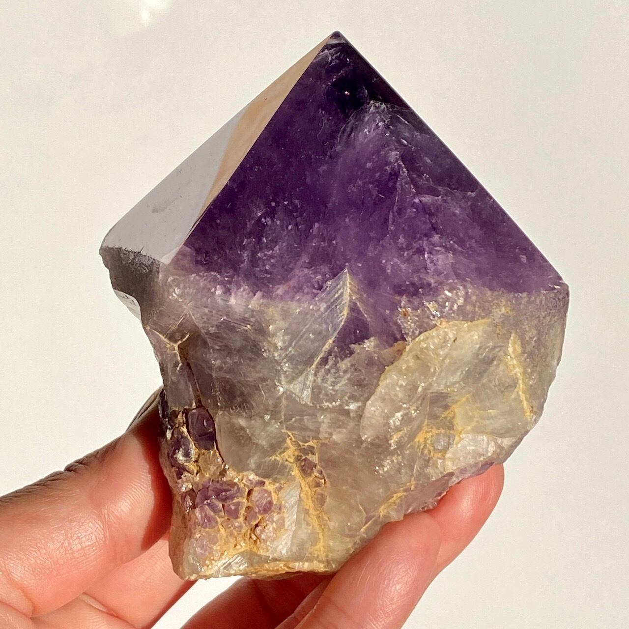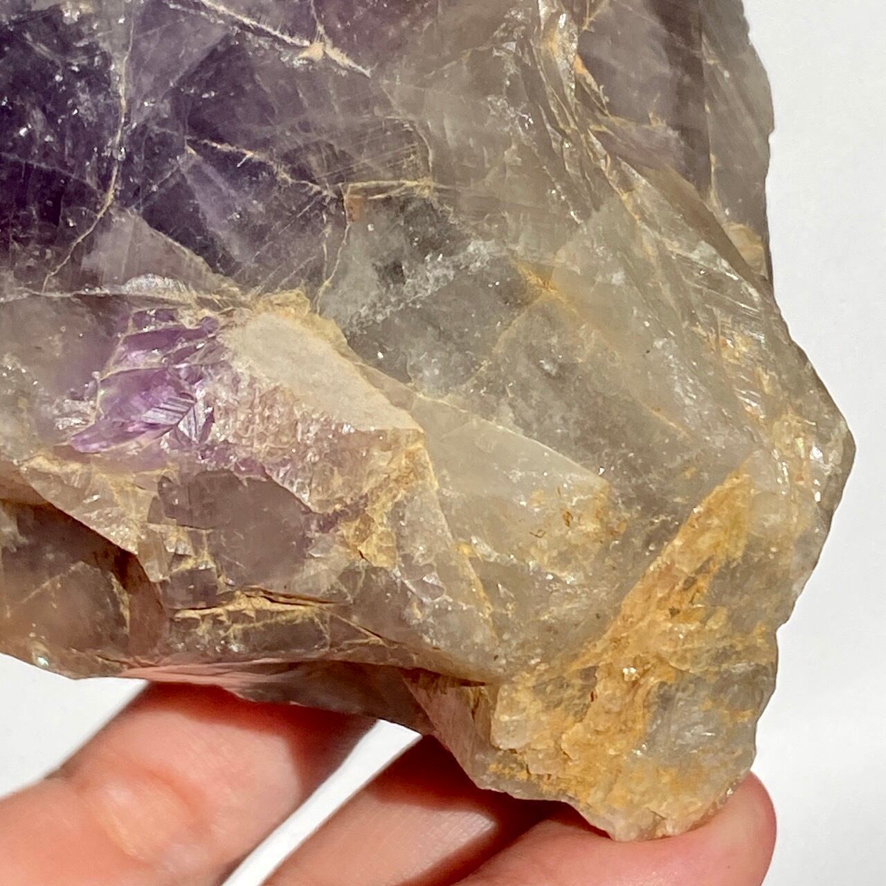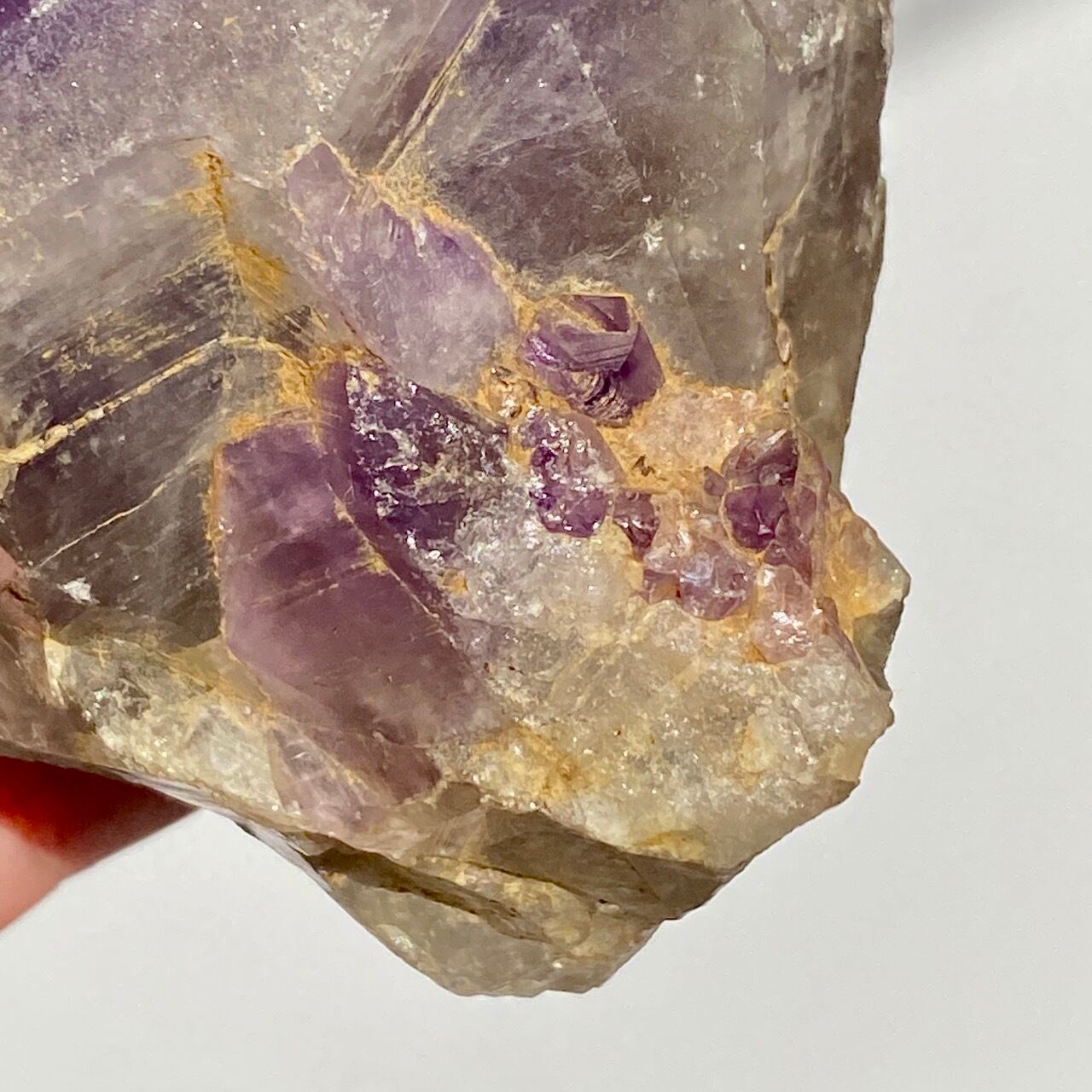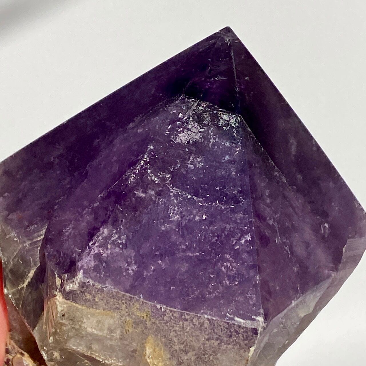 ラフ(原石)としてお迎えしましたが、ファセットの部分が超スムースなので、この部分のみ研磨されている可能性がございます。アメジストの採掘の際に、通常クラスターとは別に単体で採れるものもありますのでそのような子達のうちの1つなのかもしれません。
