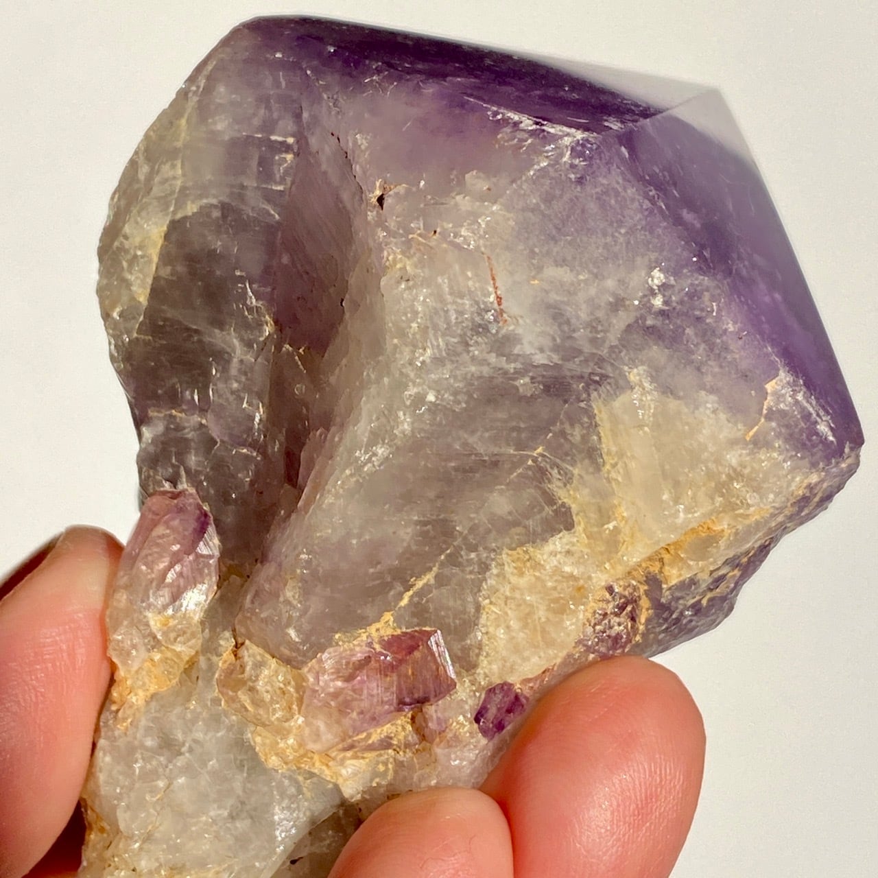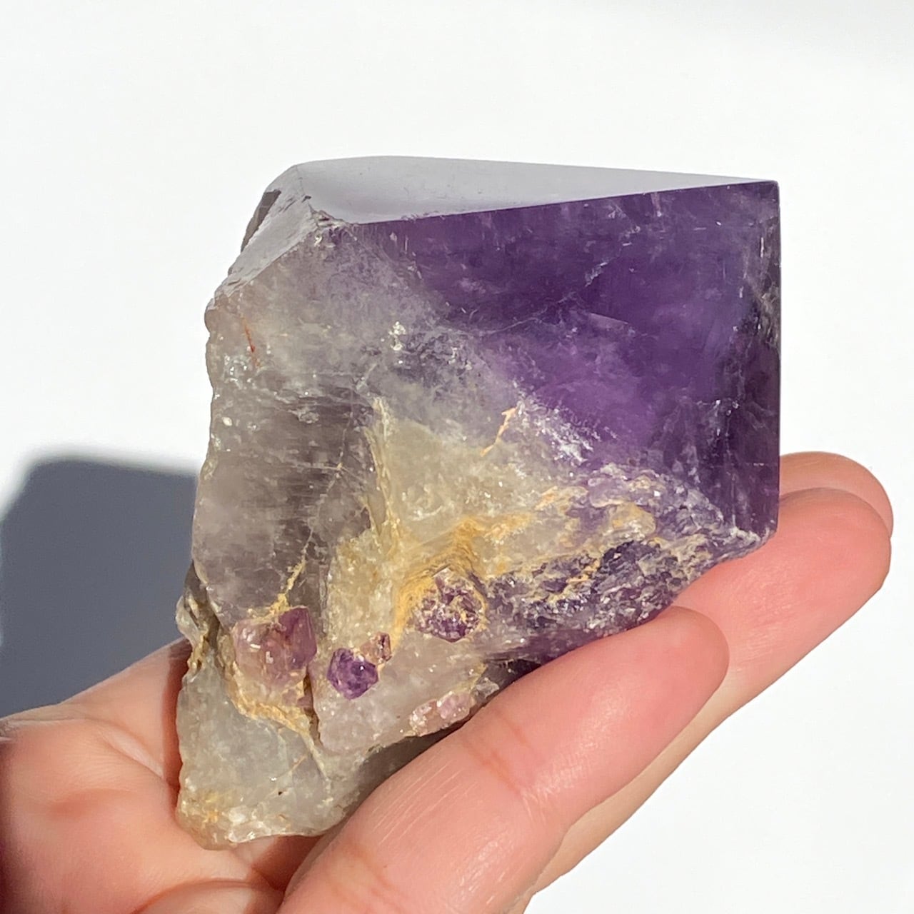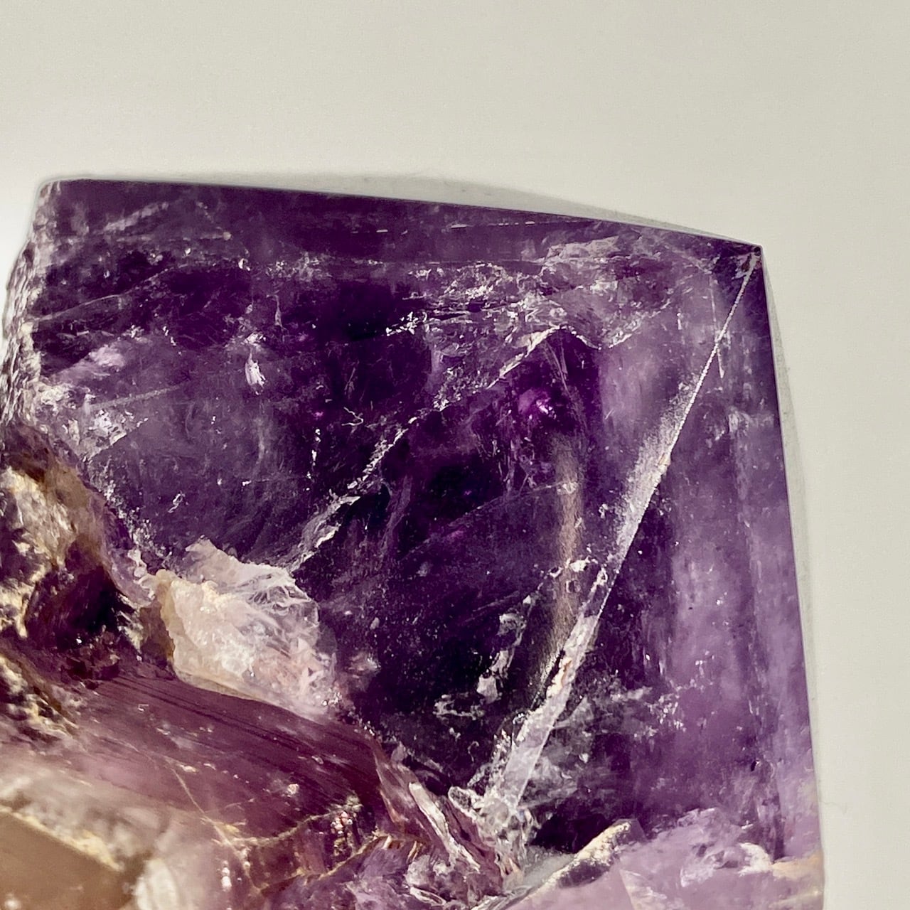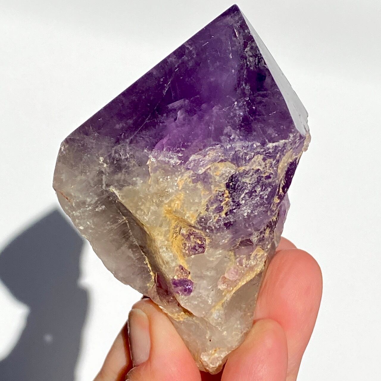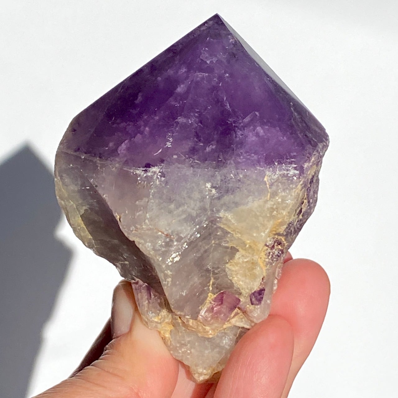 アメジストの単結晶のポイントです。ファセットだけでは無く、下側にもところどころアメジストの紫の結晶が付着している美しい子です。