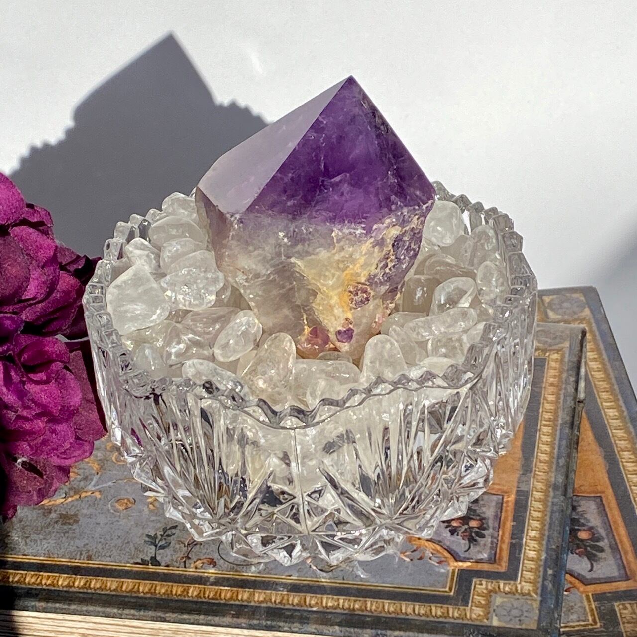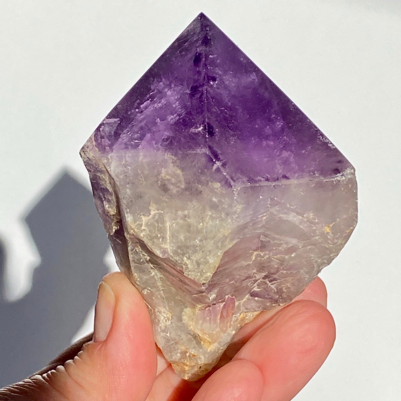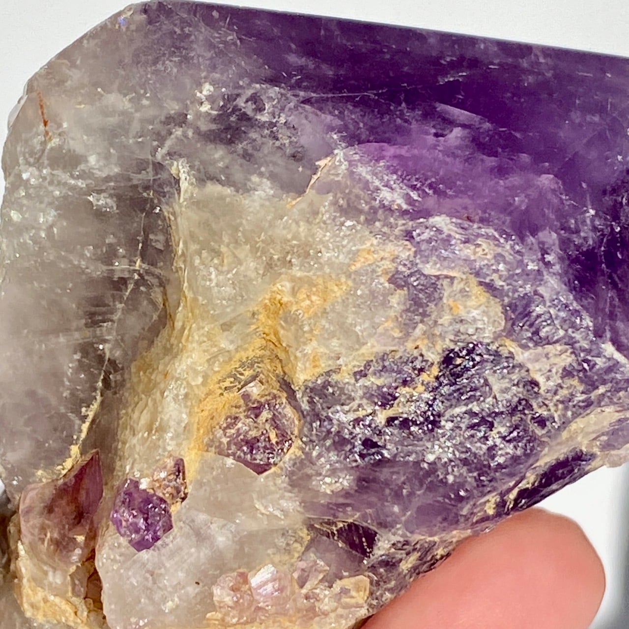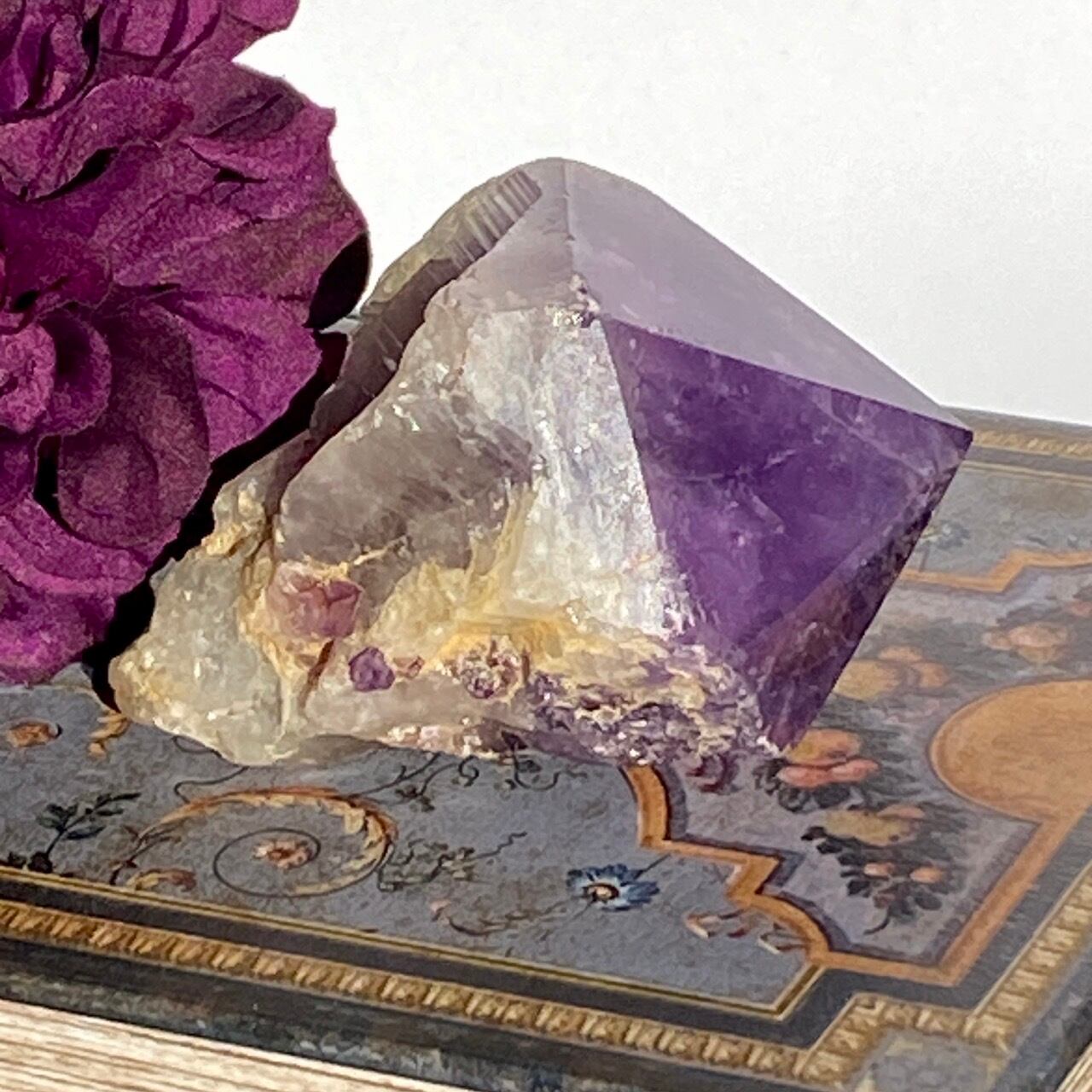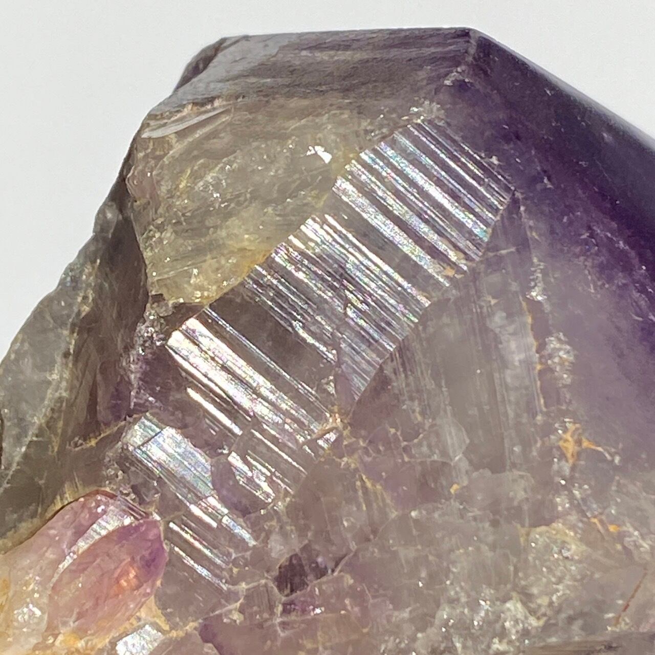 アメジストの単結晶のポイントです。ファセットだけでは無く、下側にもところどころアメジストの紫の結晶が付着している美しい子です。