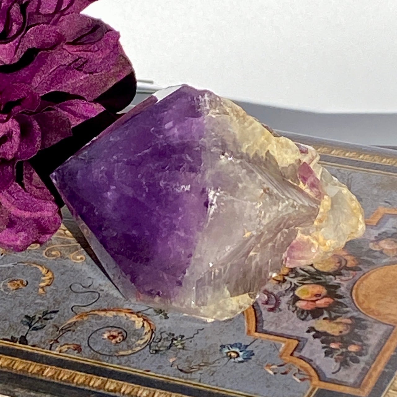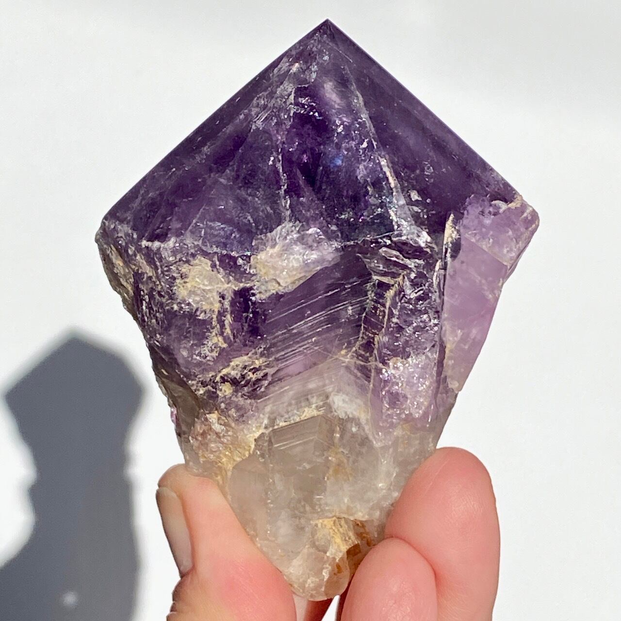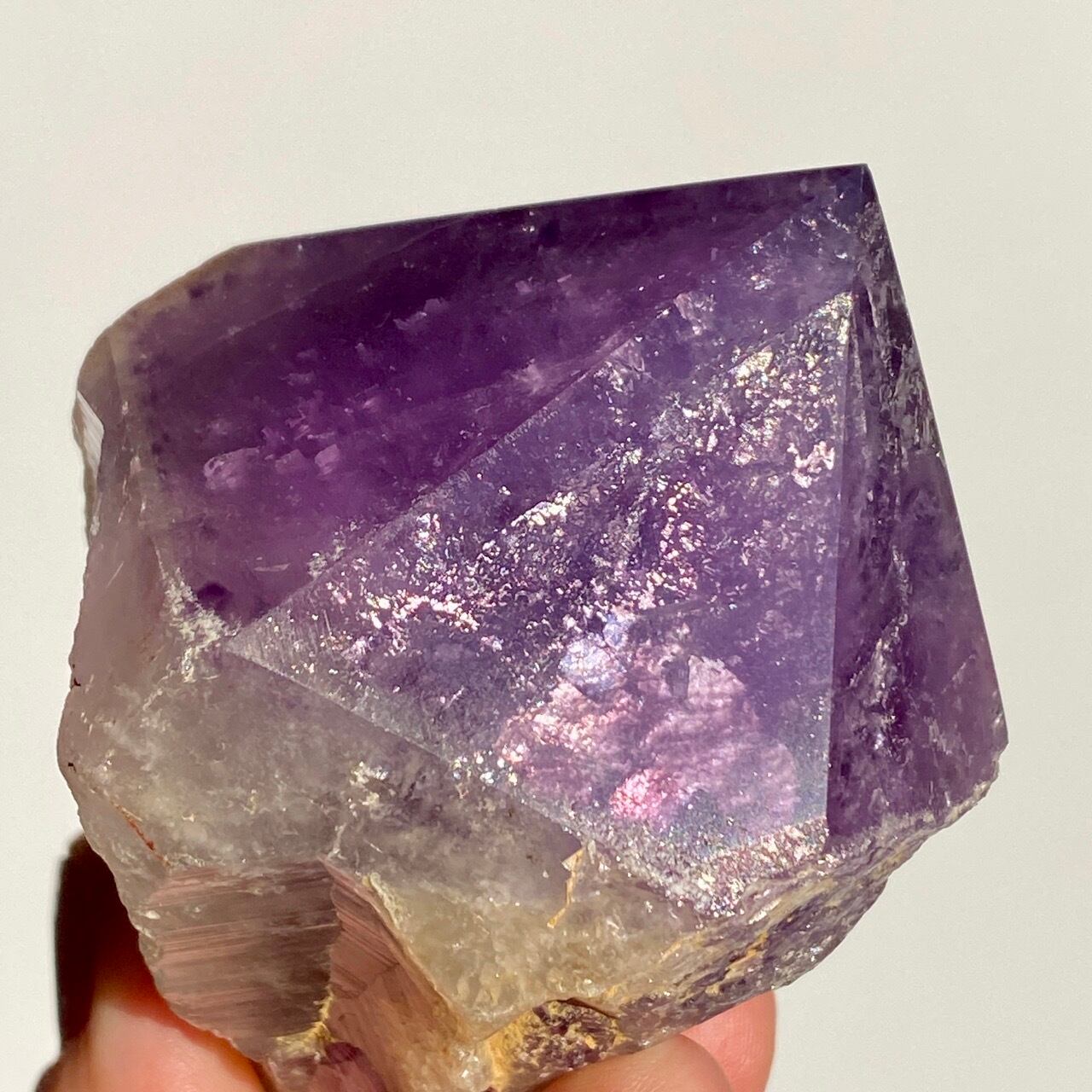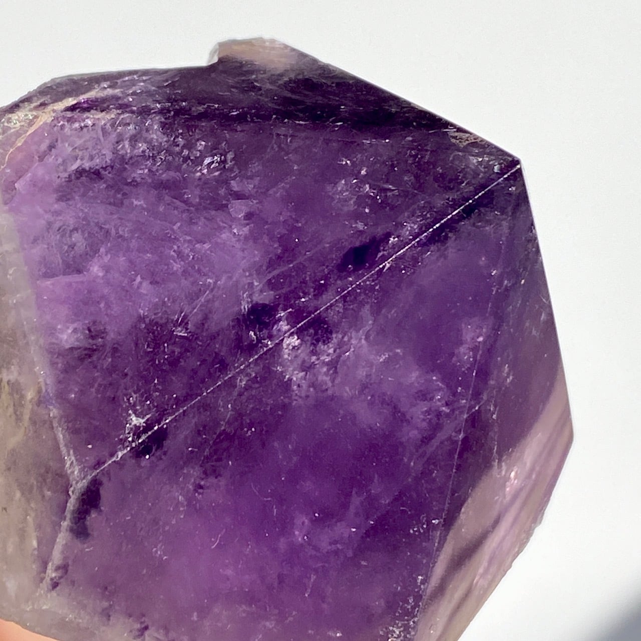 ラフ(原石)としてお迎えしましたが、ファセットの部分が超スムースなので、この部分のみ研磨されている可能性がございます。アメジストの採掘の際に、通常クラスターとは別に単体で採れるものもありますのでそのような子達のうちの1つなのかもしれません。