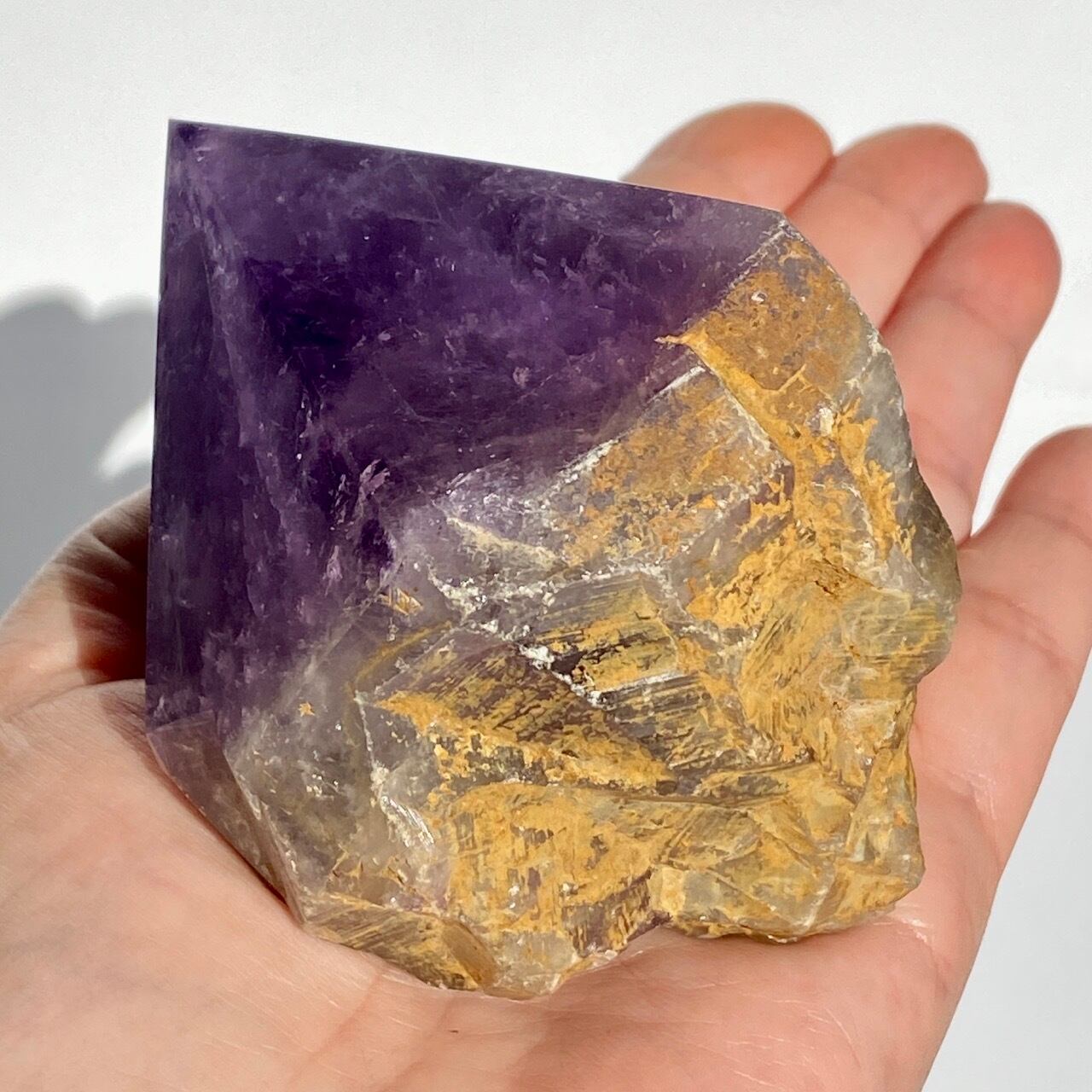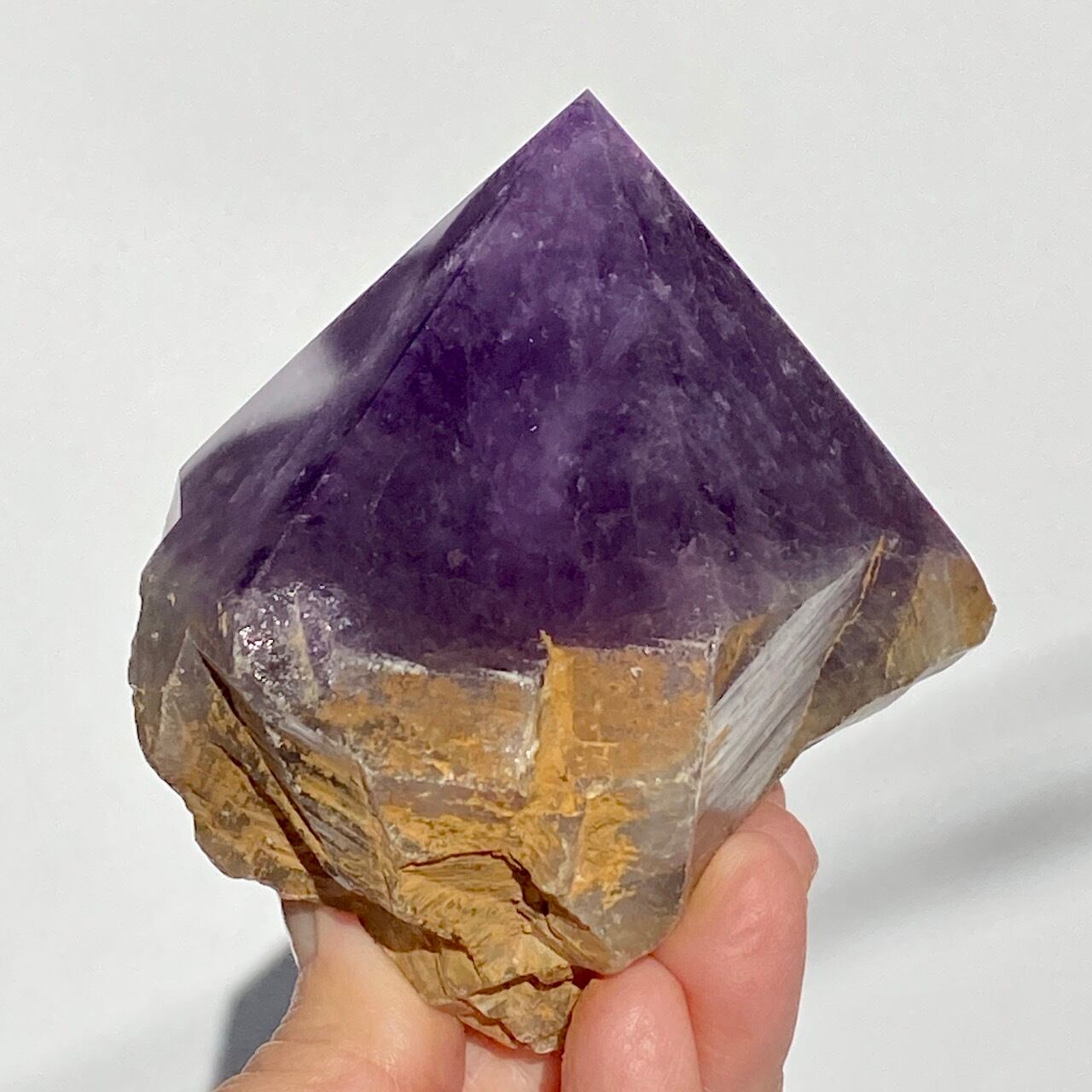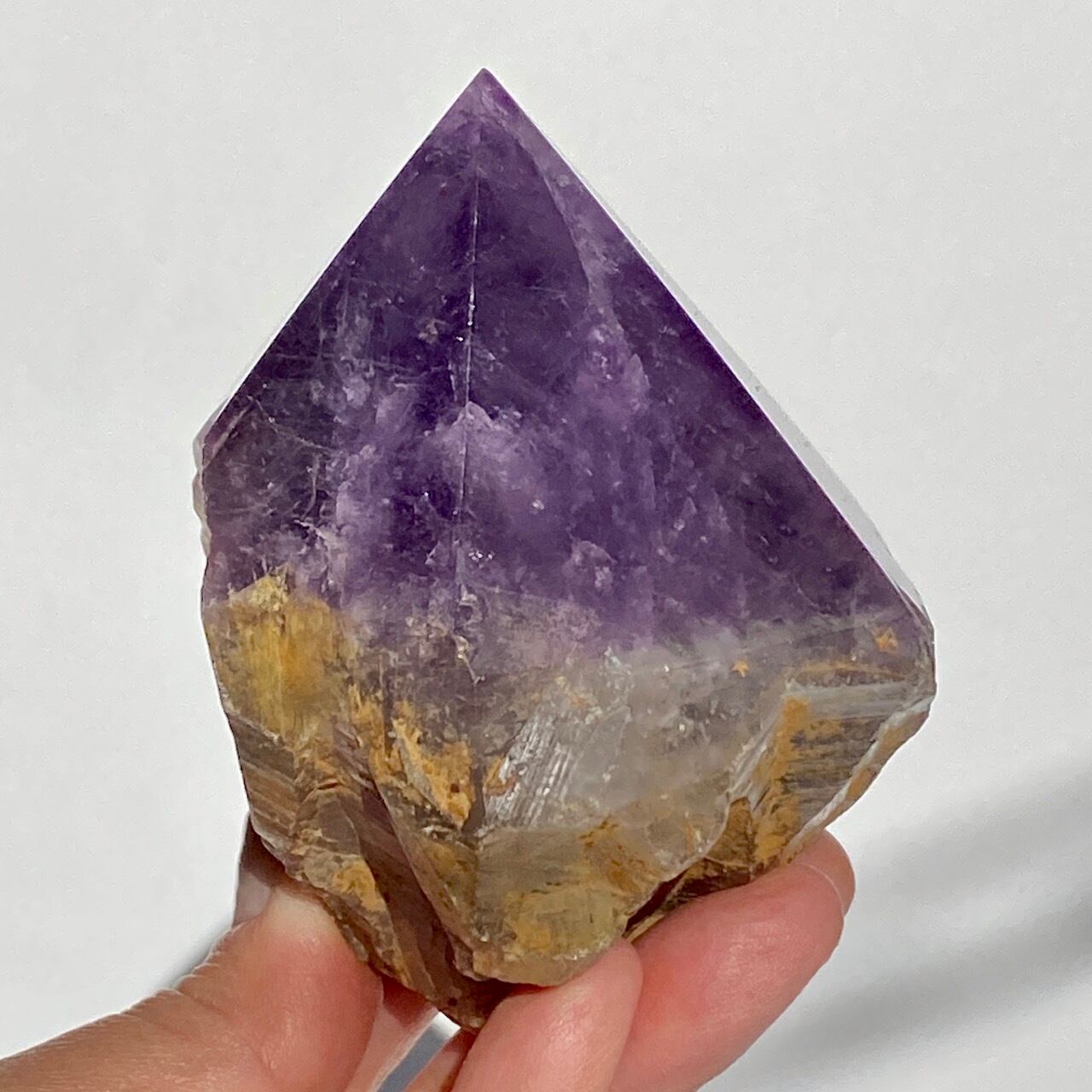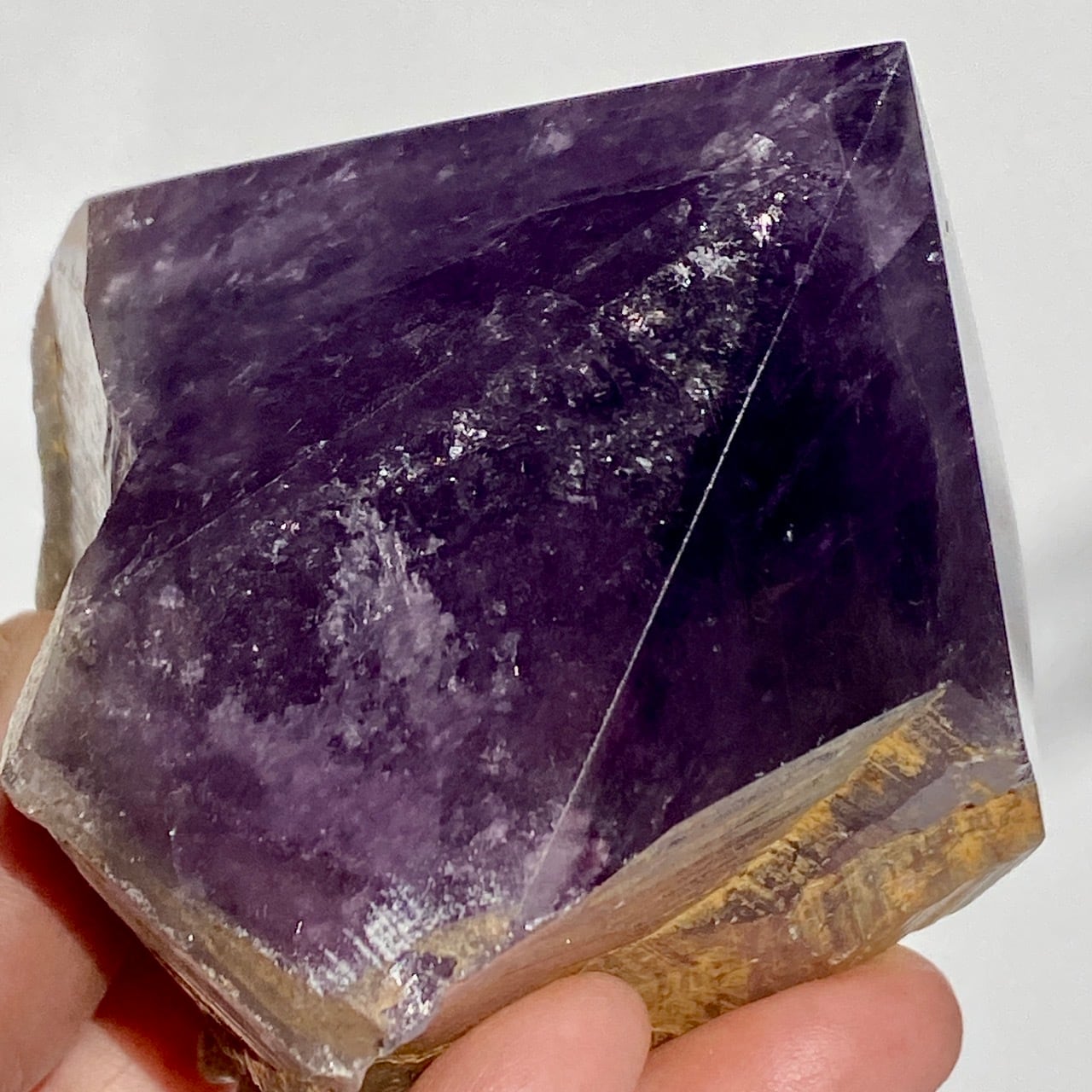ラフ(原石)としてお迎えしましたが、ファセットの部分が超スムースなので、この部分のみ研磨されている可能性がございます。アメジストの採掘の際に、通常クラスターとは別に単体で採れるものもありますのでそのような子達のうちの1つなのかもしれません。