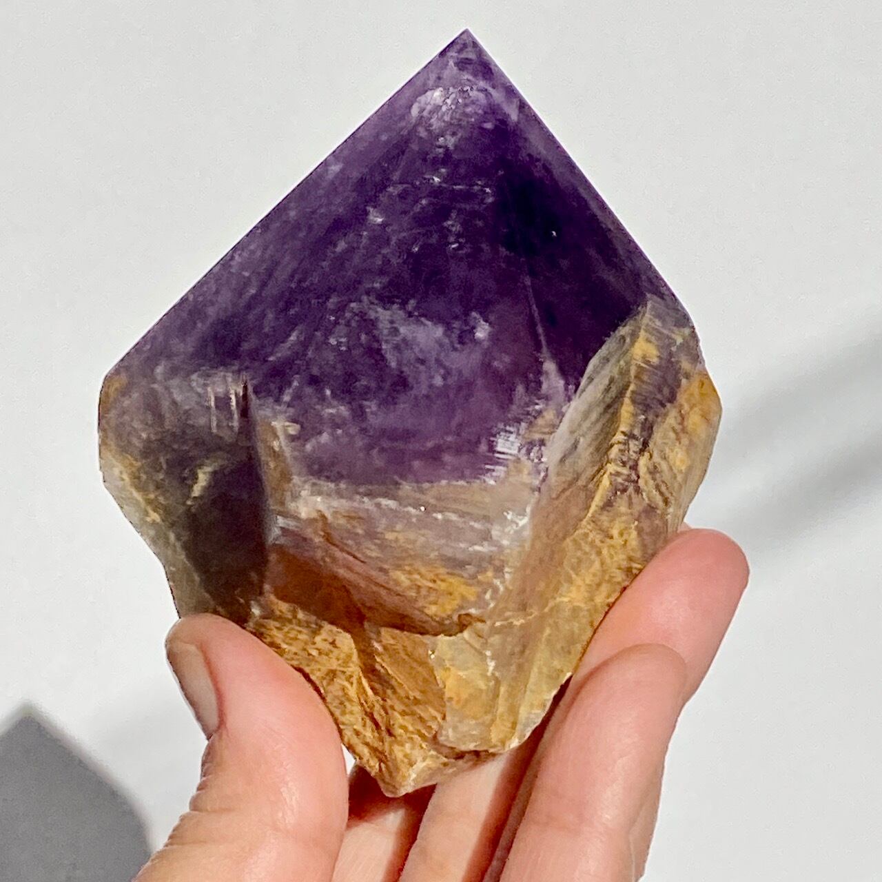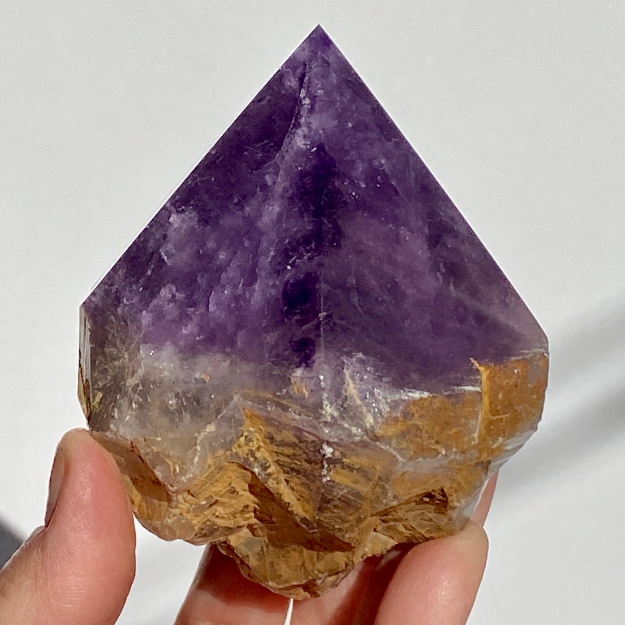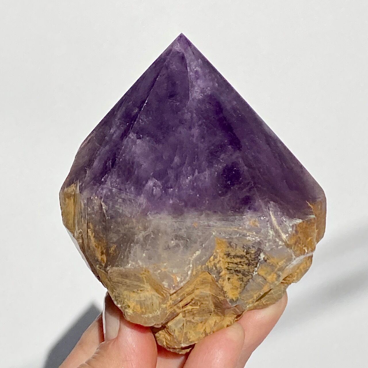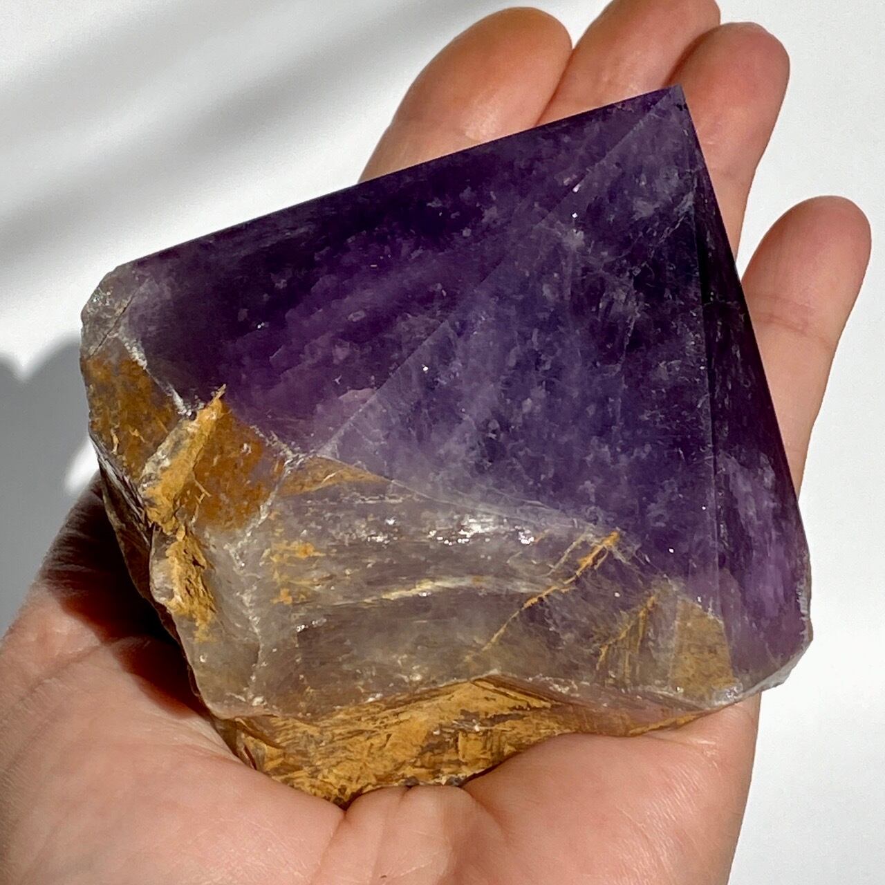 ラフ(原石)としてお迎えしましたが、ファセットの部分が超スムースなので、この部分のみ研磨されている可能性がございます。アメジストの採掘の際に、通常クラスターとは別に単体で採れるものもありますのでそのような子達のうちの1つなのかもしれません。