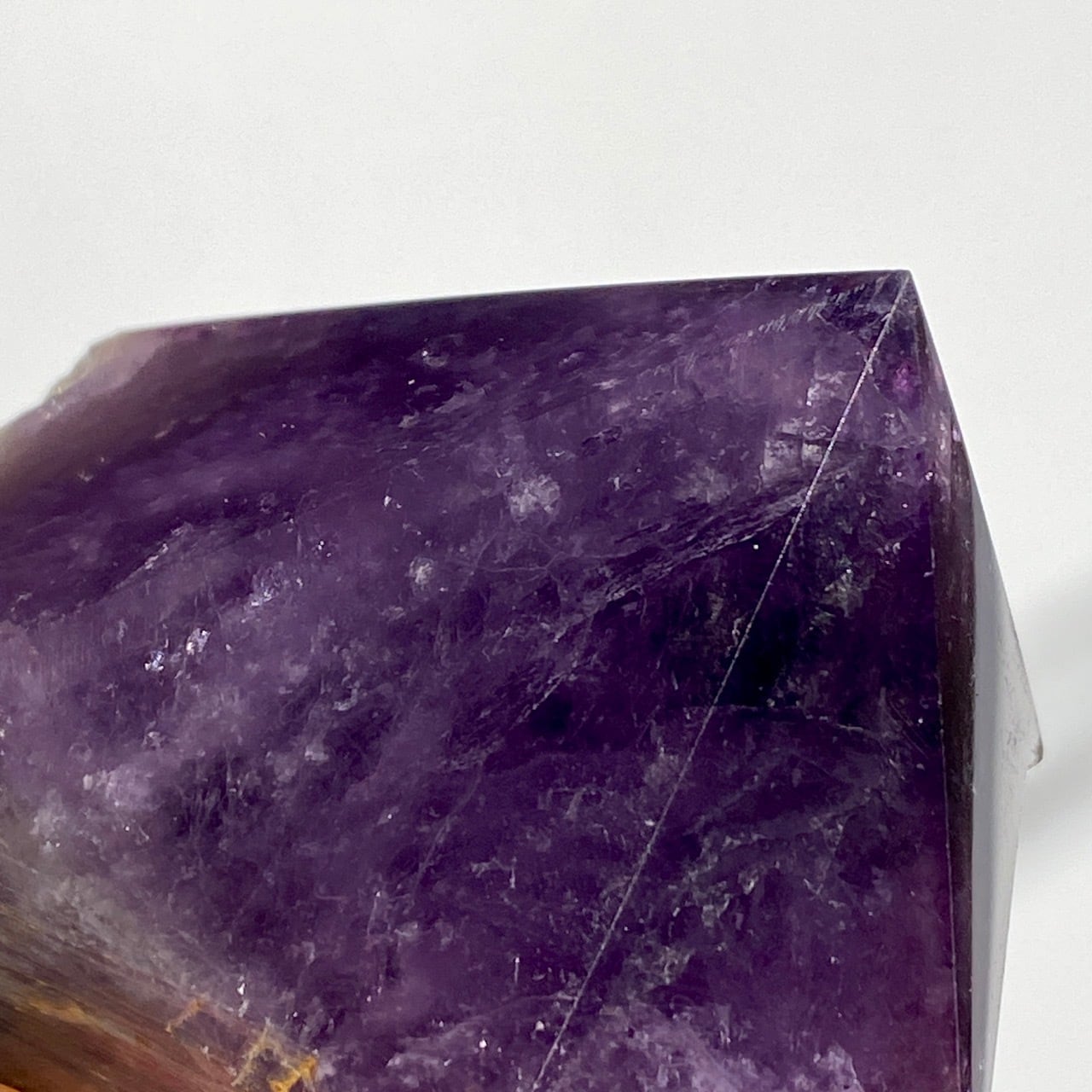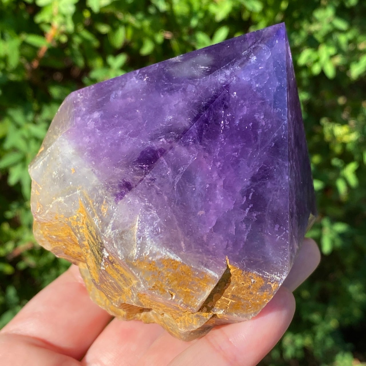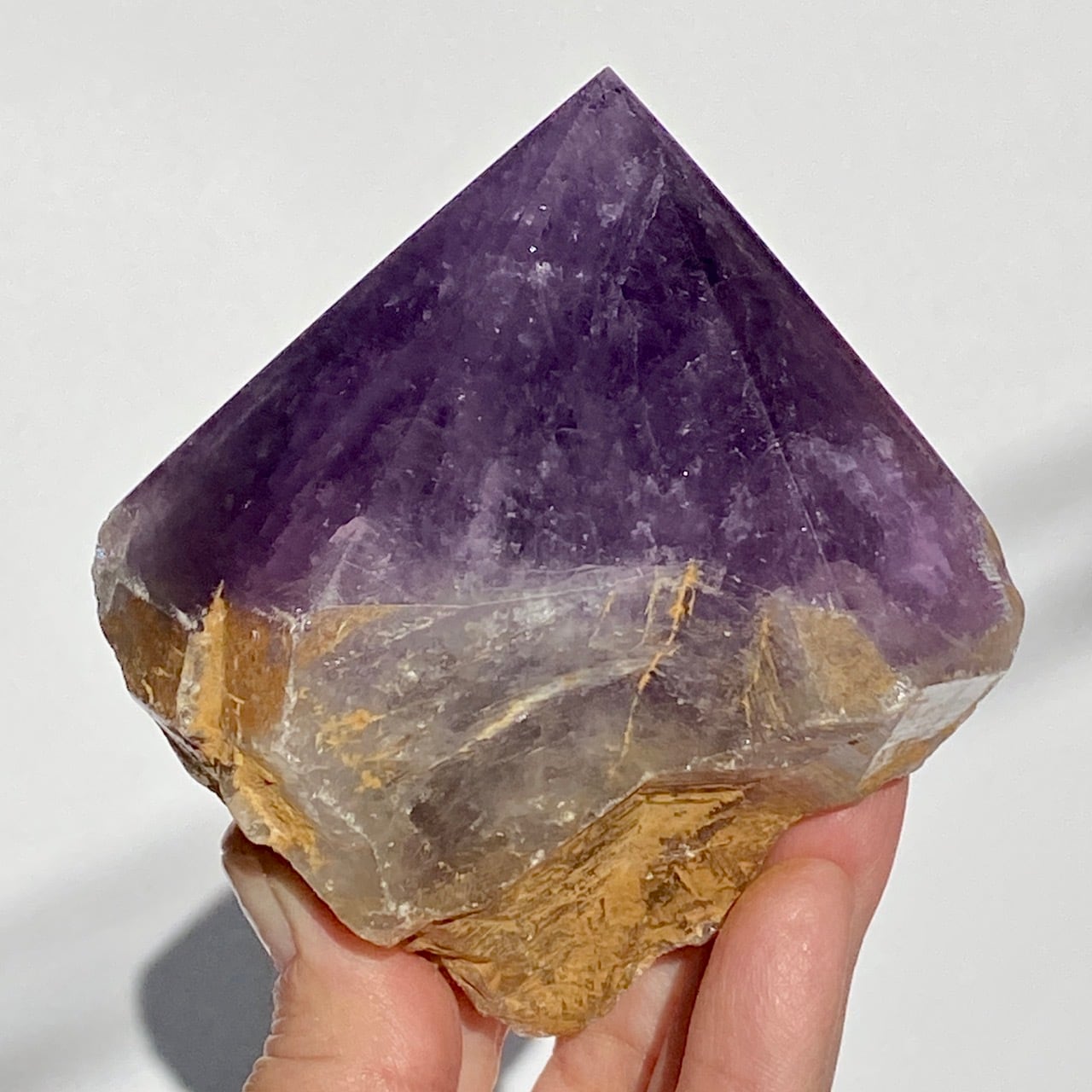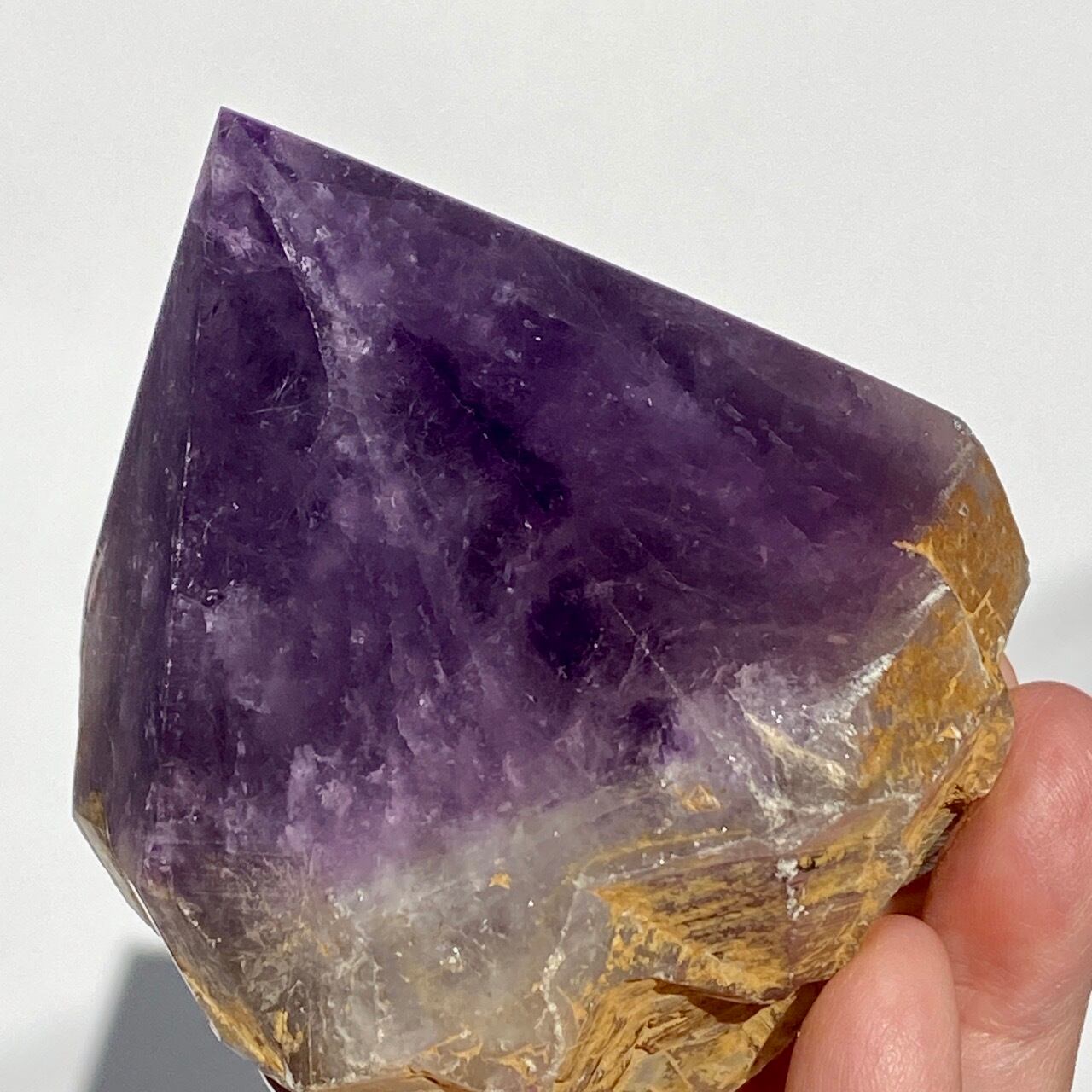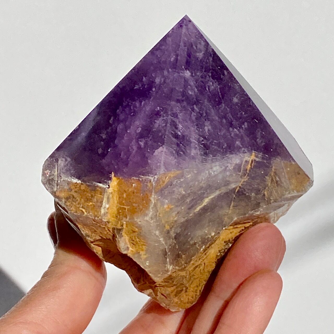ラフ(原石)としてお迎えしましたが、ファセットの部分が超スムースなので、この部分のみ研磨されている可能性がございます。アメジストの採掘の際に、通常クラスターとは別に単体で採れるものもありますのでそのような子達のうちの1つなのかもしれません。