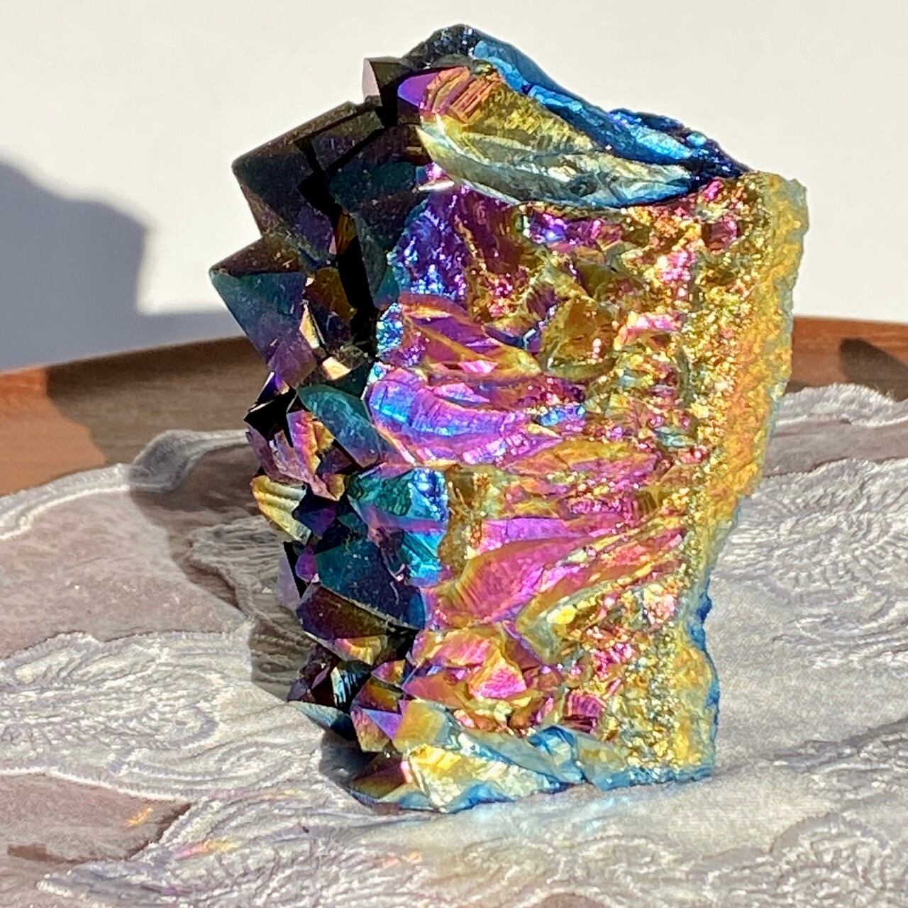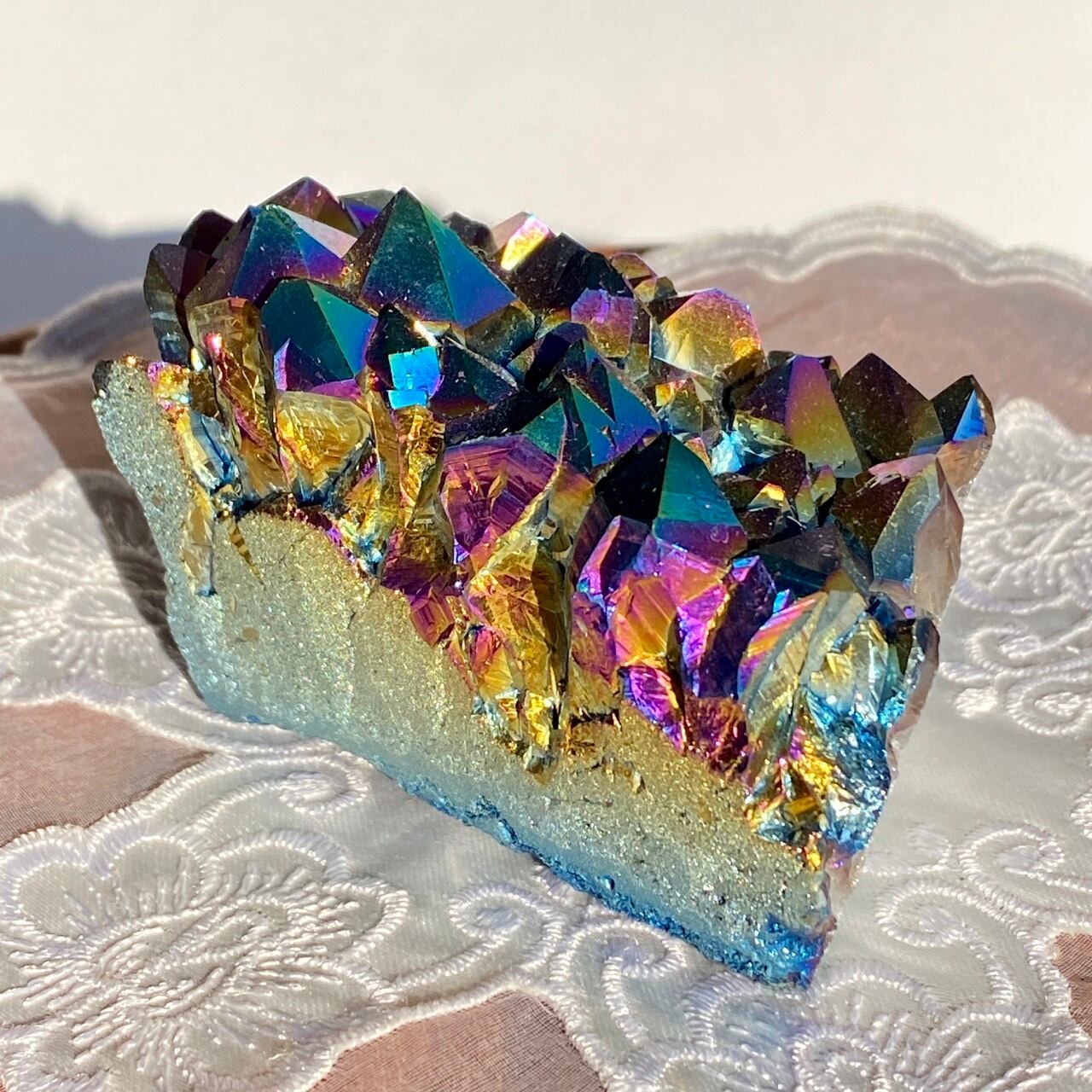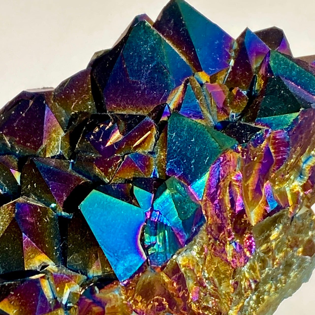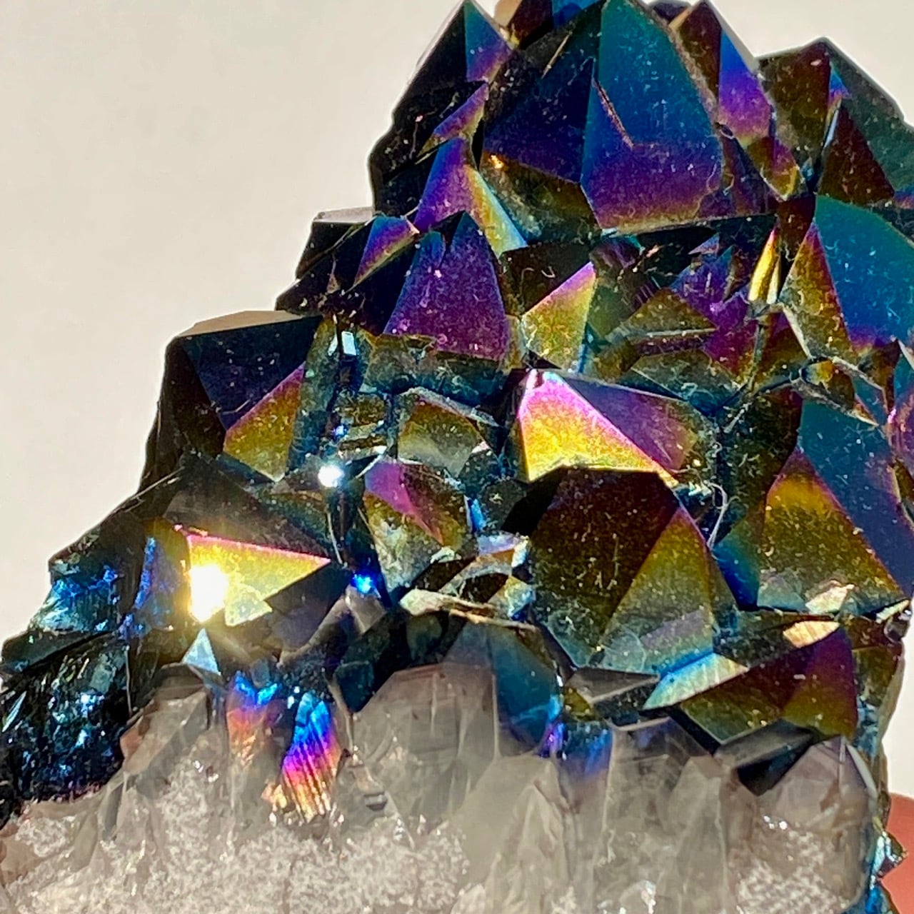 天然のアメジストクラスター(底部分を平らにカットして立たせる事を可能にしたカットベース仕様)の表面に酸化チタンを蒸着させています。
