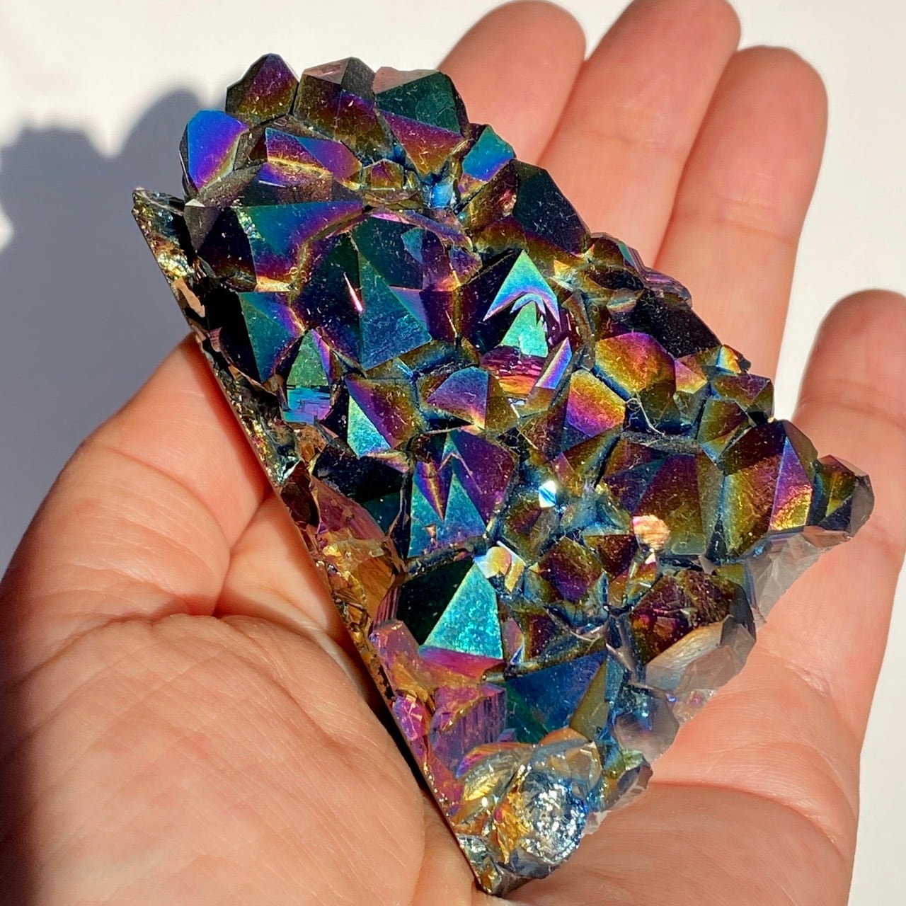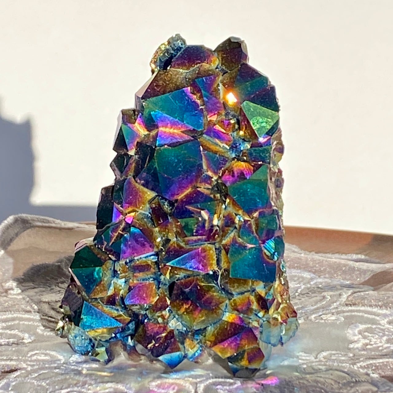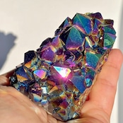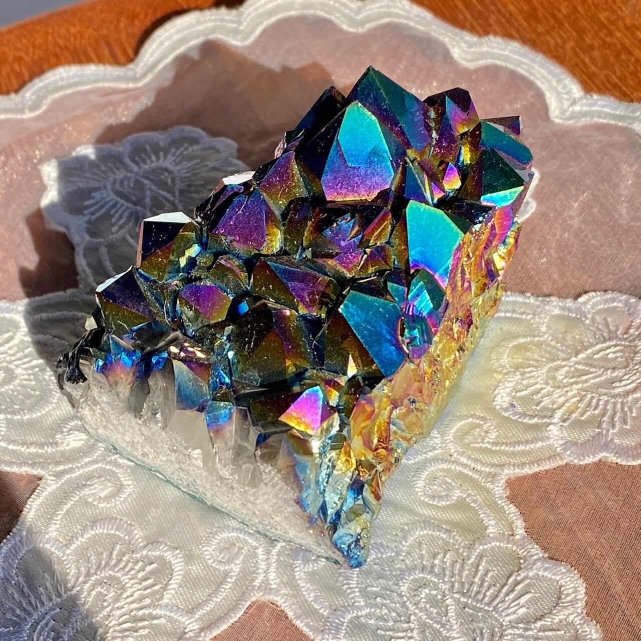 天然のアメジストクラスター(底部分を平らにカットして立たせる事を可能にしたカットベース仕様)の表面に酸化チタンを蒸着させています。