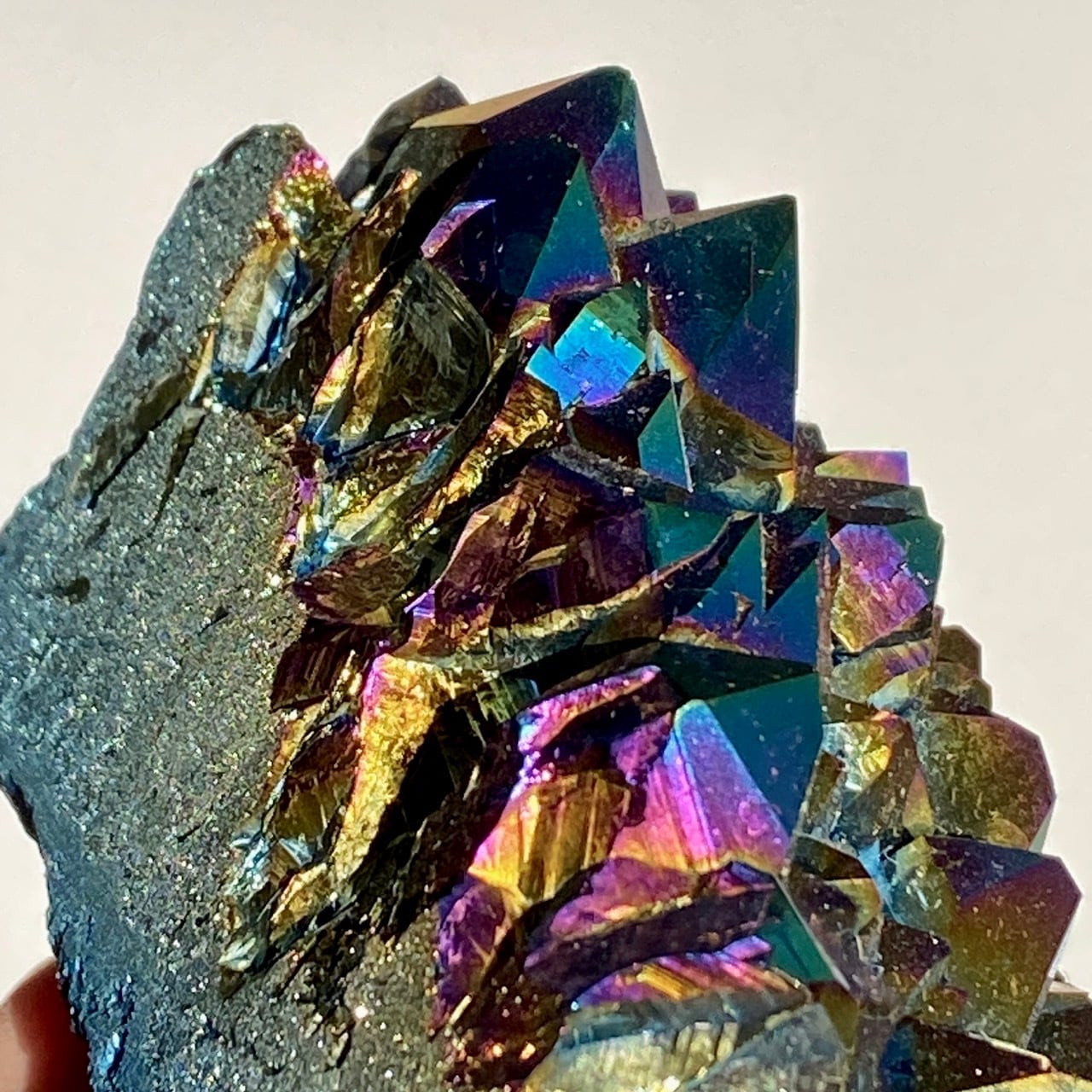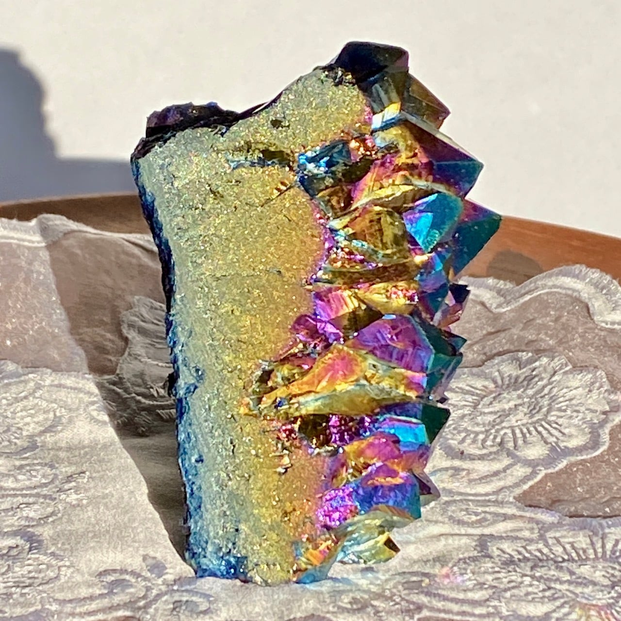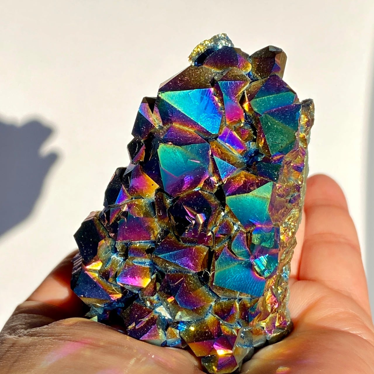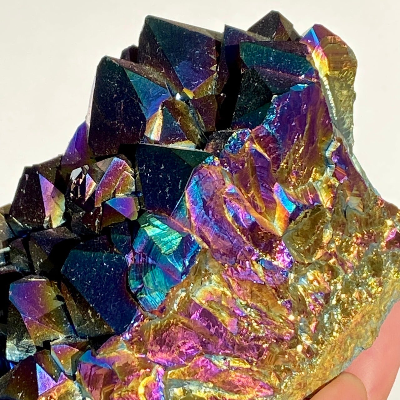 天然のアメジストクラスター(底部分を平らにカットして立たせる事を可能にしたカットベース仕様)の表面に酸化チタンを蒸着させています。