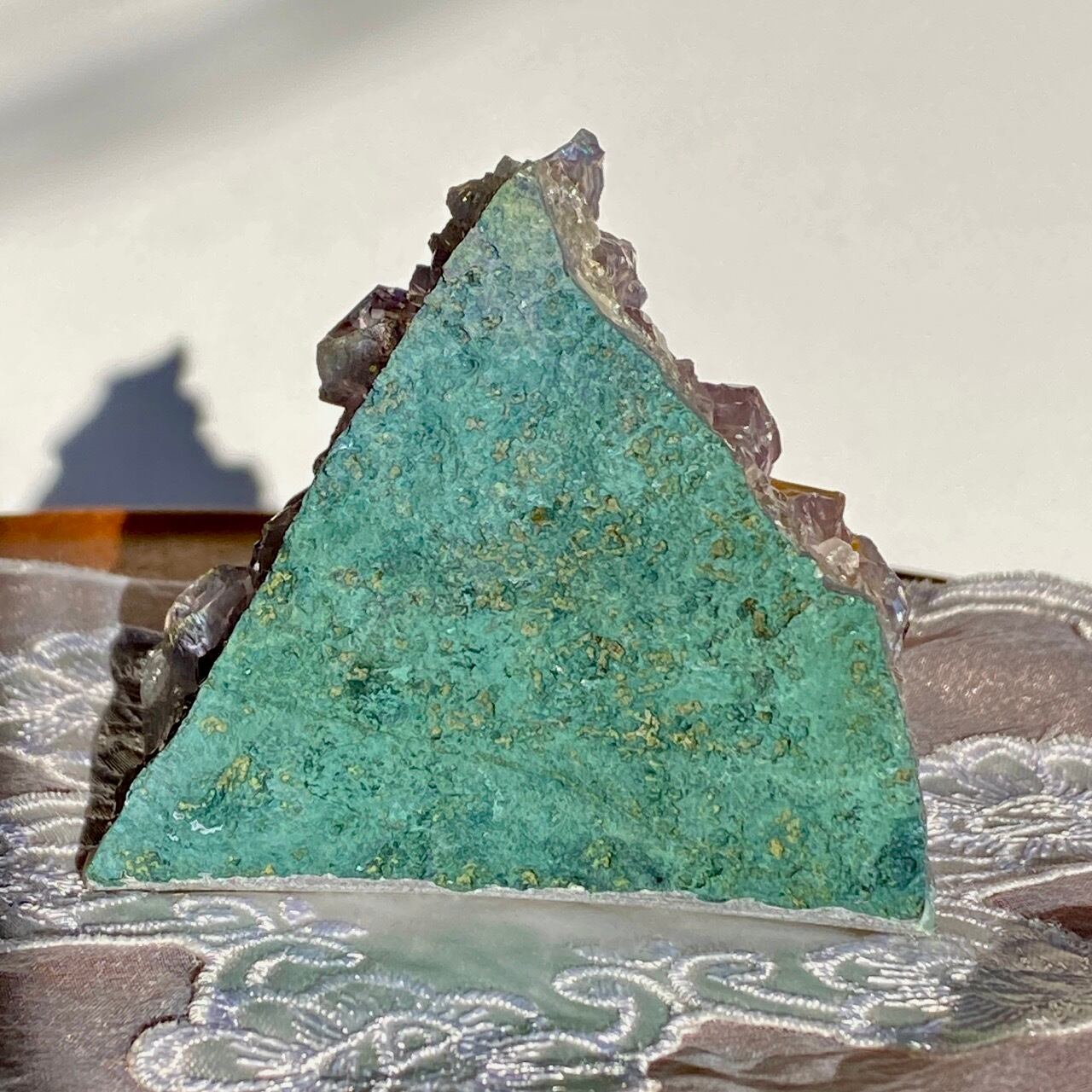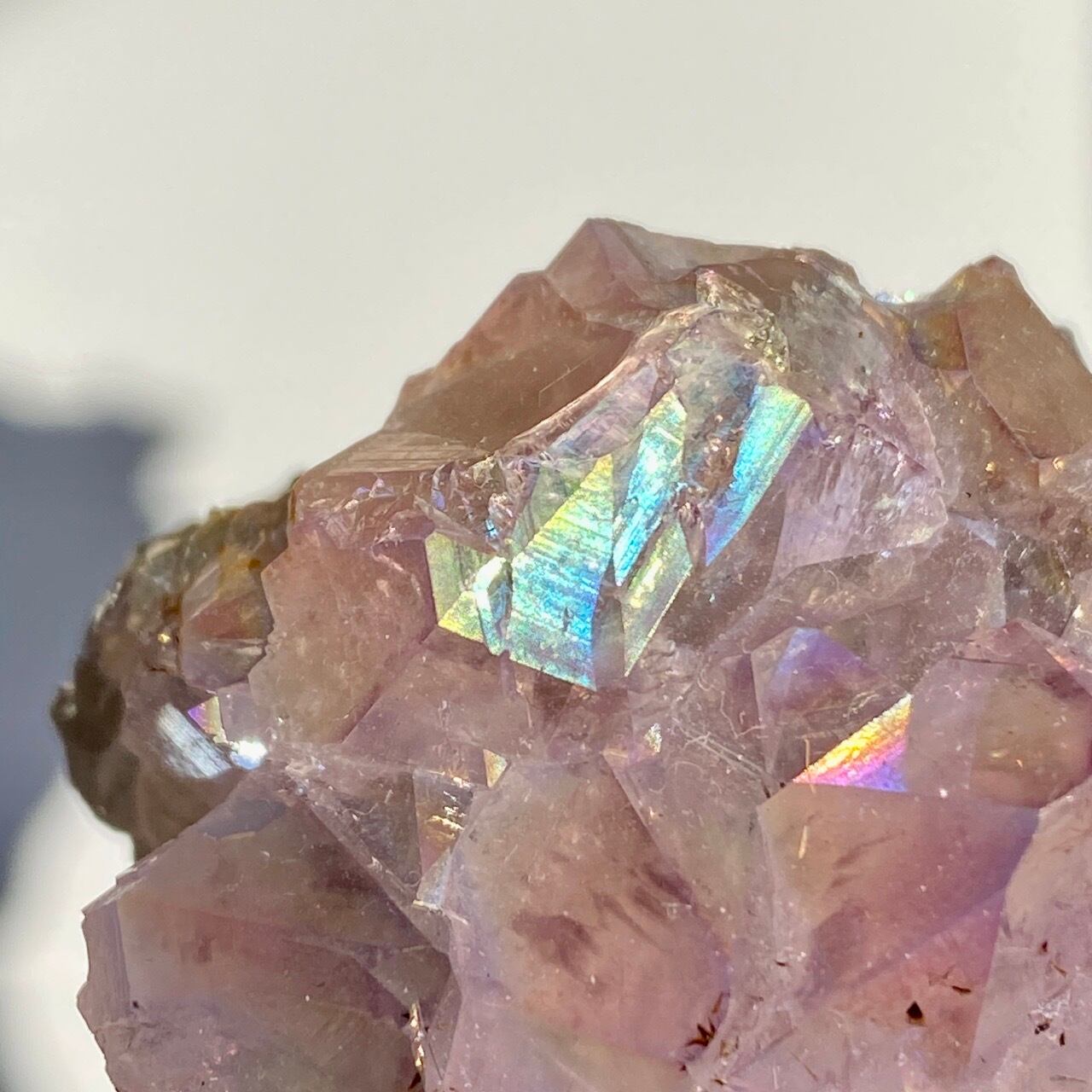 色味は艶々ぷるぷるの淡いラベンダーで形状はおむすびのような可愛さ。画像では表せていませんが、きらきらとしていて、ロマネサイトのようなインクルージョンも見られます。天使や妖精、ユニコーンと飾っても神々しい可愛さですし、結晶が龍の鱗の様にも見えるので、ドラゴンも可愛いパートナーになると思います。