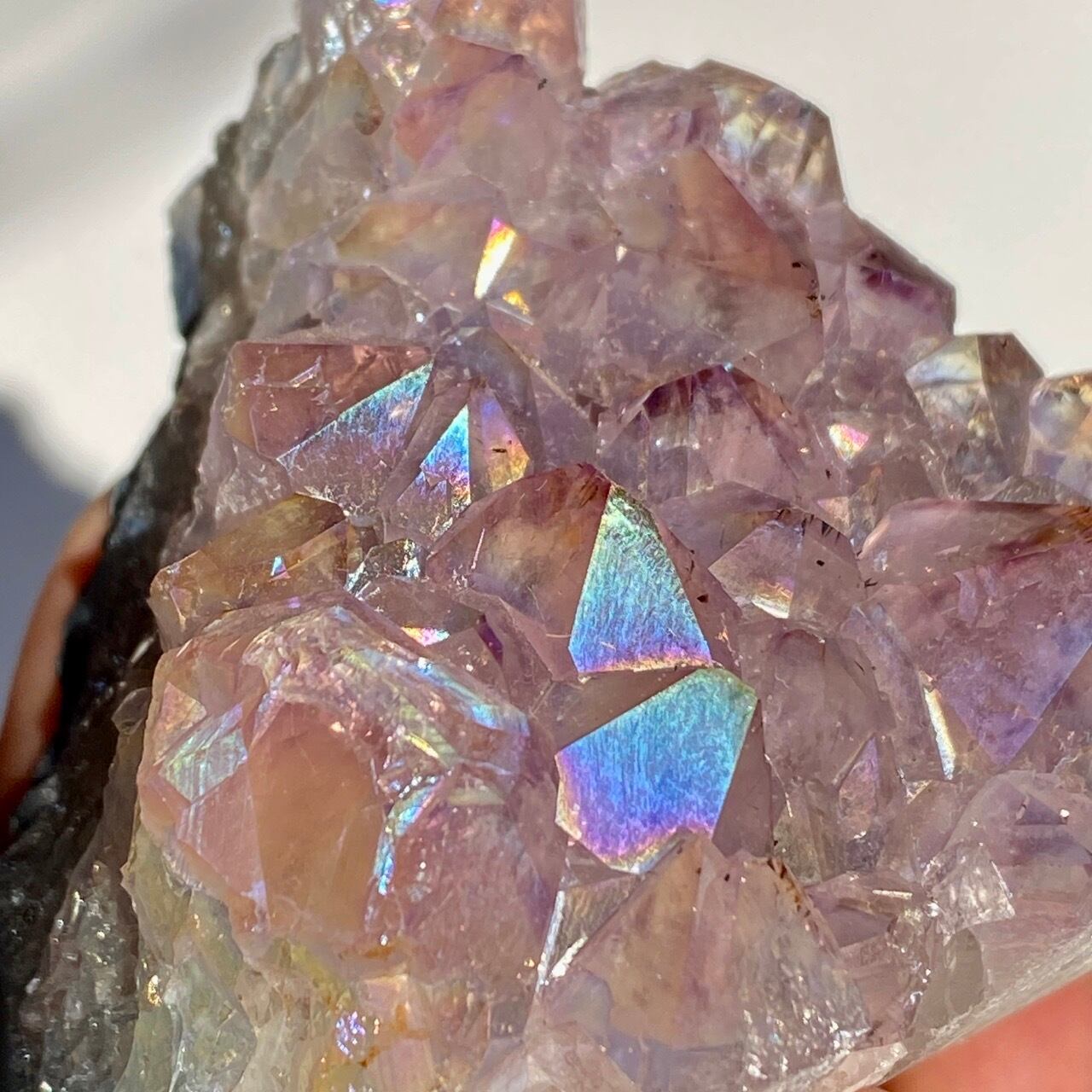天然のアメジストクラスター(底部分を平らにカットして立たせる事を可能にしたカットベース仕様)の表面にチタンの蒸着と酸素の放射により金属コーティングが施されています。