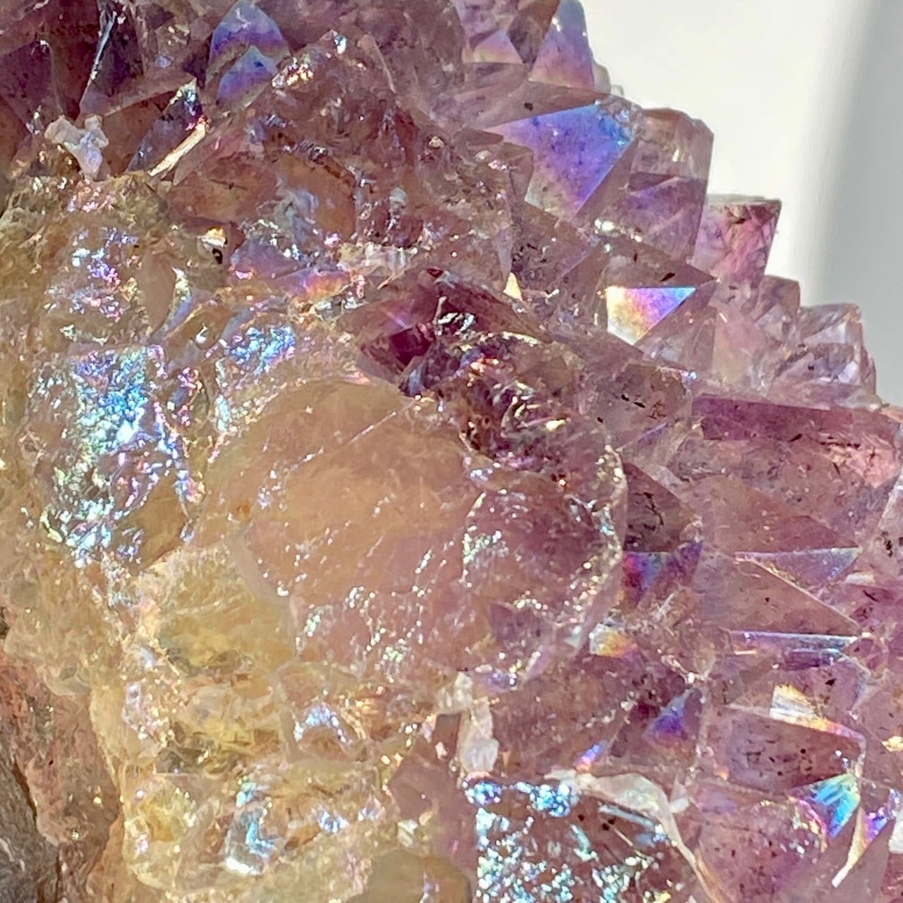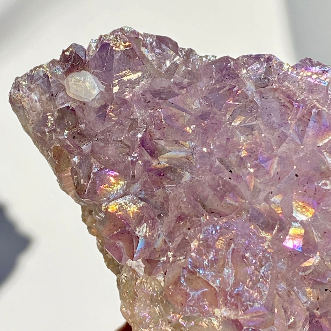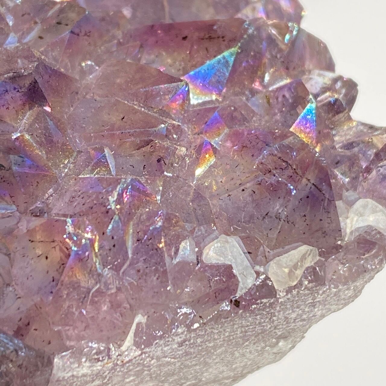 天然のアメジストクラスター(底部分を平らにカットして立たせる事を可能にしたカットベース仕様)の表面にチタンの蒸着と酸素の放射により金属コーティングが施されています。