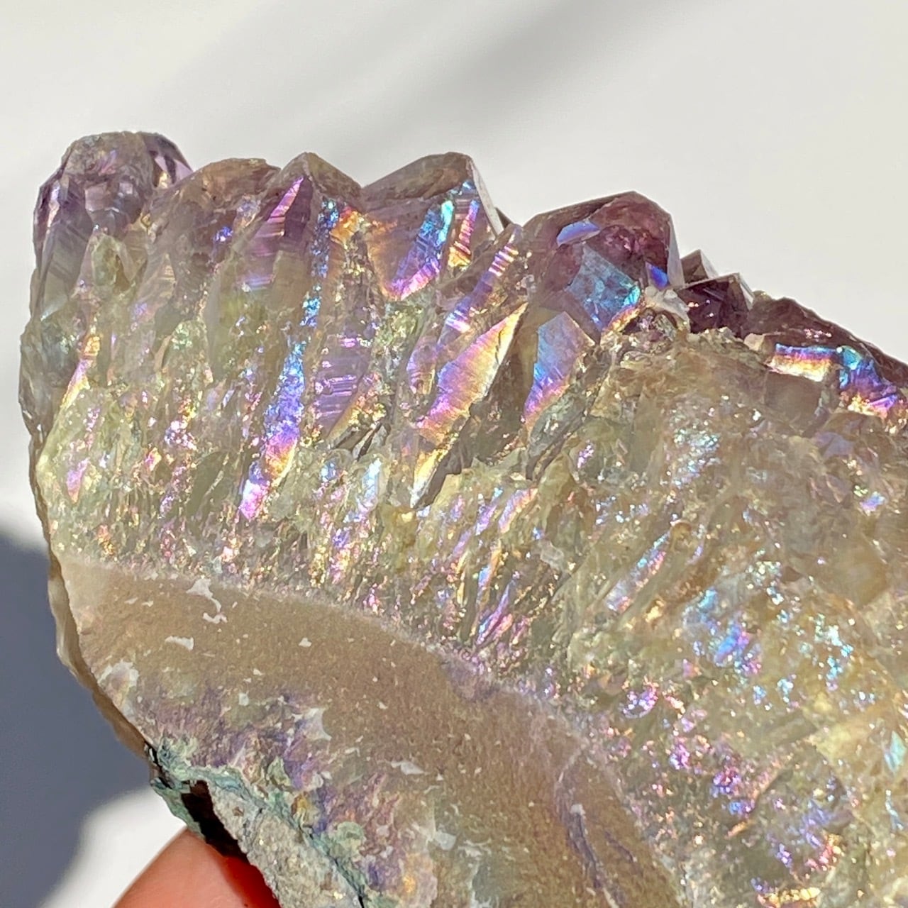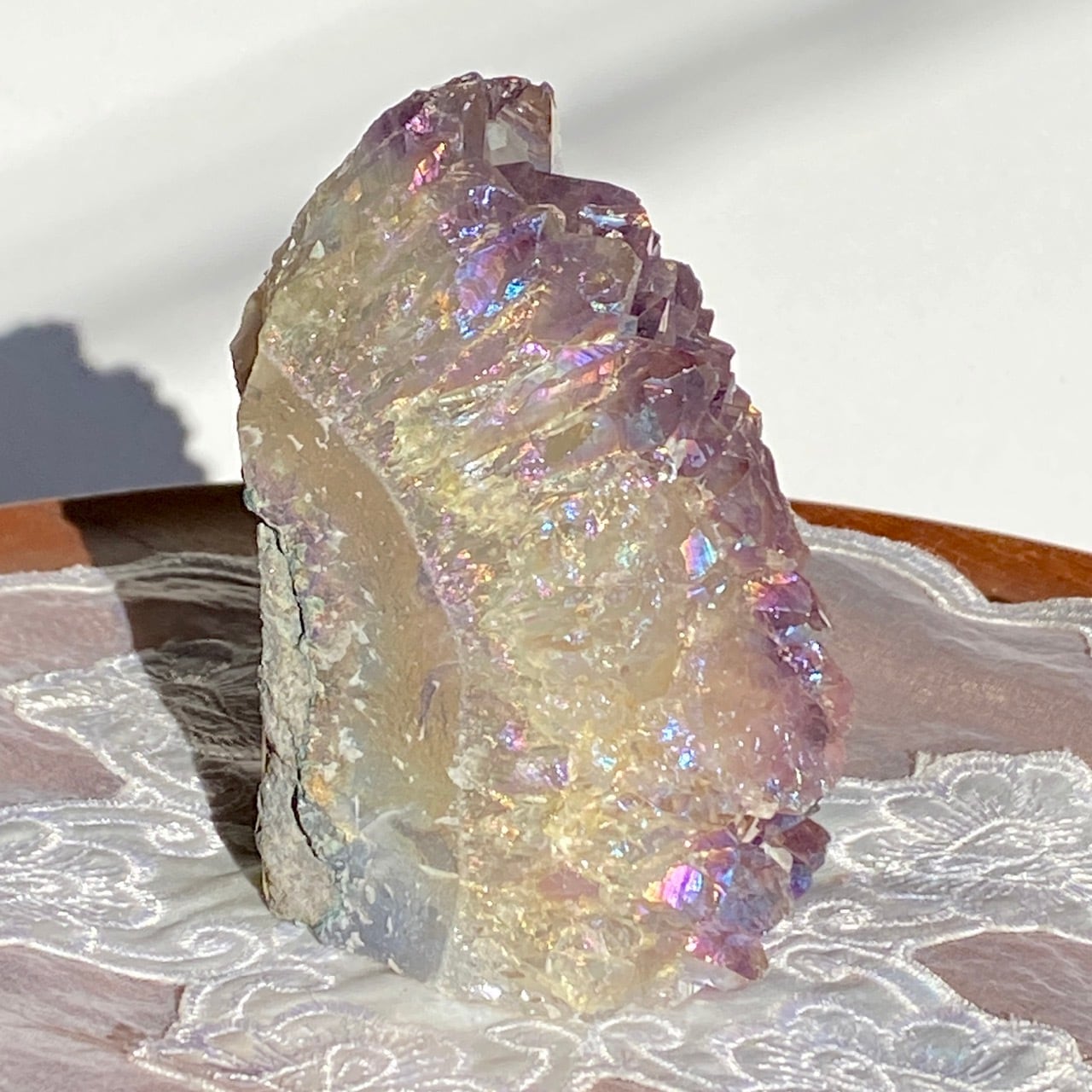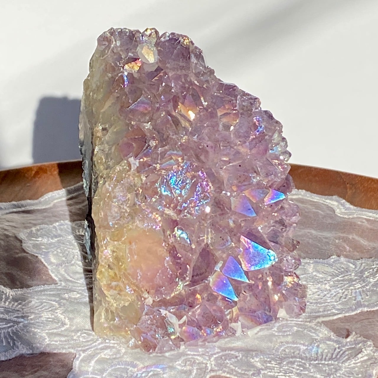 天然のアメジストクラスター(底部分を平らにカットして立たせる事を可能にしたカットベース仕様)の表面にチタンの蒸着と酸素の放射により金属コーティングが施されています。