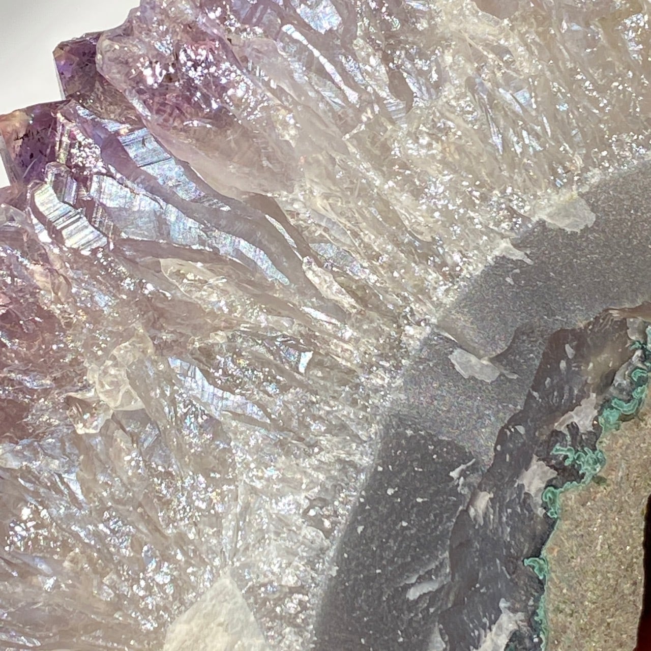 色味は艶々ぷるぷるラベンダー。画像では表せていませんが、きらきらとオーラが輝き、結晶の剥離痕のオーラまでもが紋様のように愛らしい子です。上部と下部にカルサイトが共生しています。天使や妖精、ユニコーンと飾っても神々しい可愛さですし、結晶が龍の鱗の様にも見えるので、ドラゴンも可愛いパートナーになると思います。