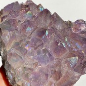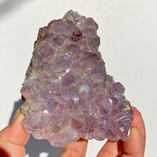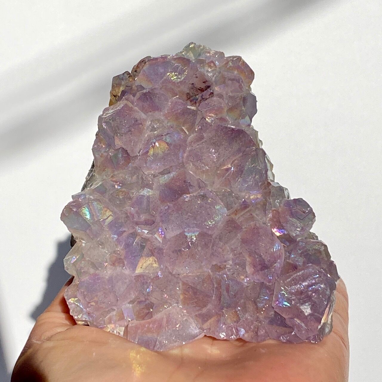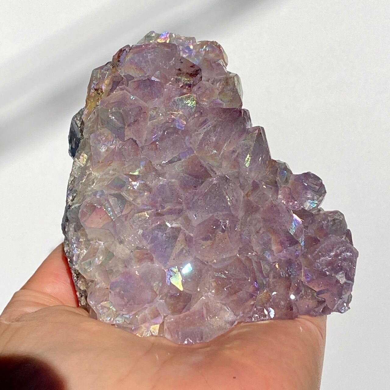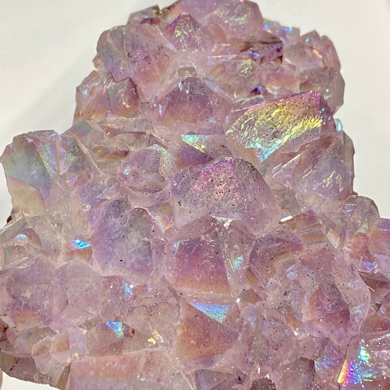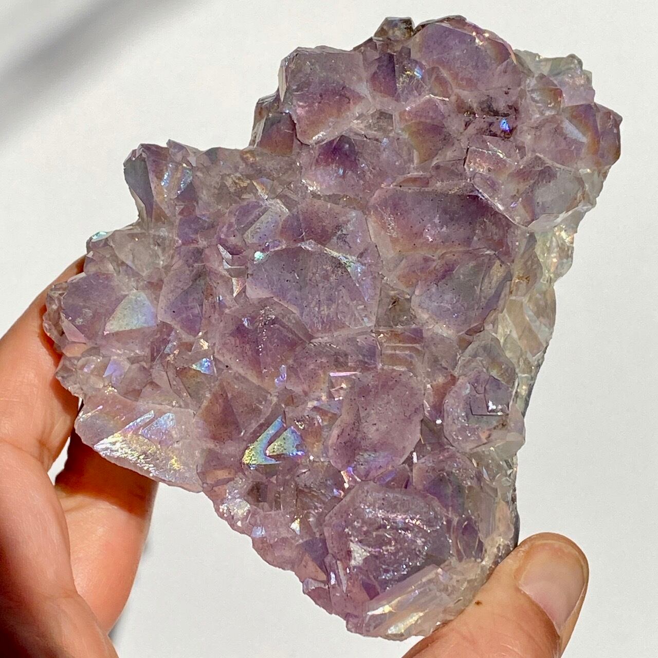 色味は艶々ぷるぷるゼリーのようなラベンダー。画像では表せていませんが、きらきらです。ロマネサイトのようなインクルージョンも見られますし、形状が直線でカットされたものとは違いアーティスティックです。天使や妖精、ユニコーンと飾っても神々しい可愛さですし、結晶が龍の鱗の様にも見えるので、ドラゴンも可愛いパートナーになると思います。