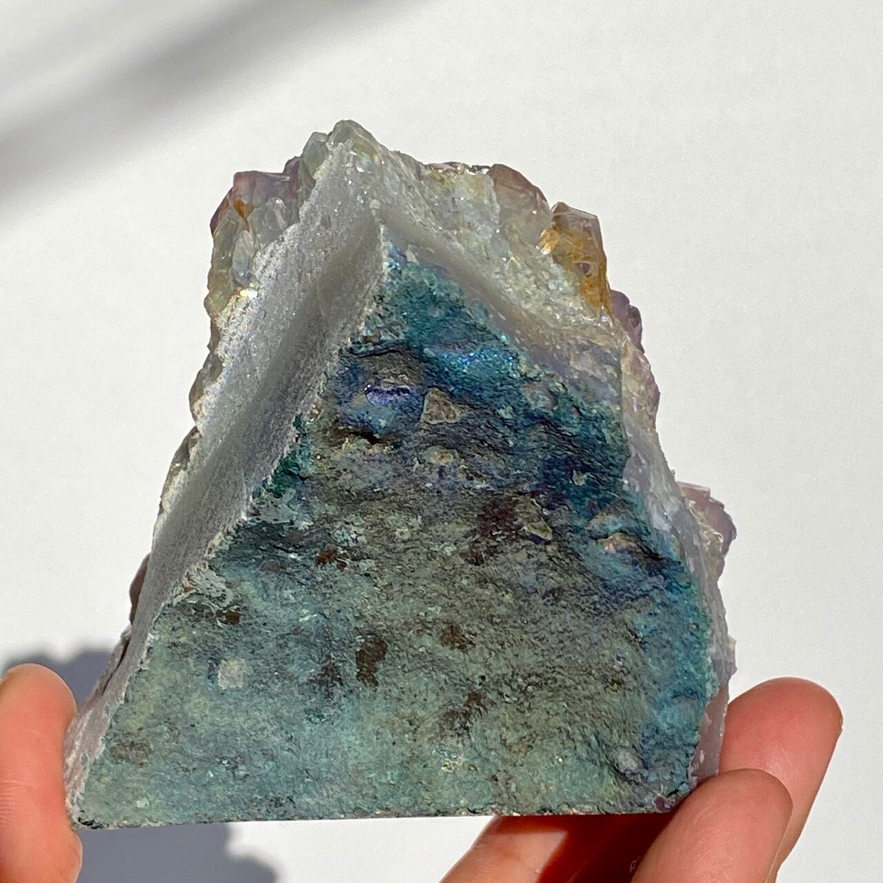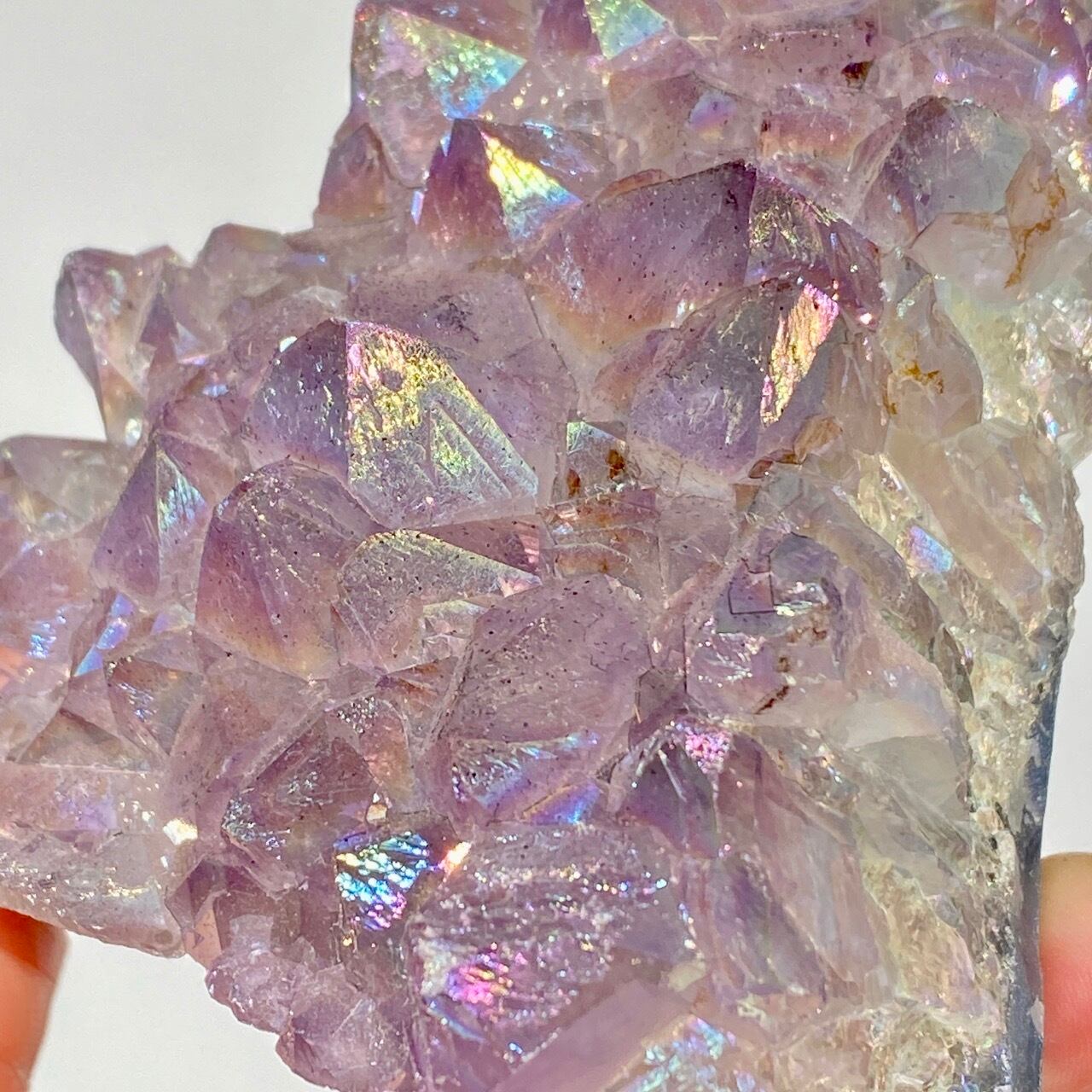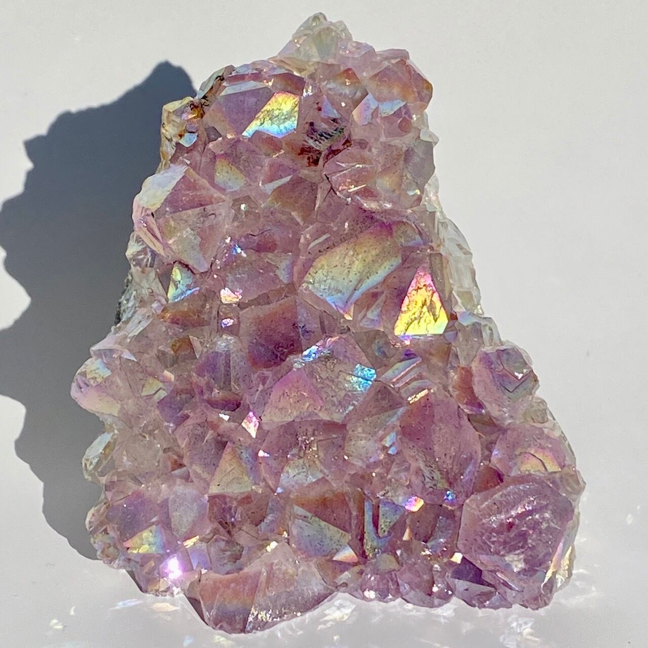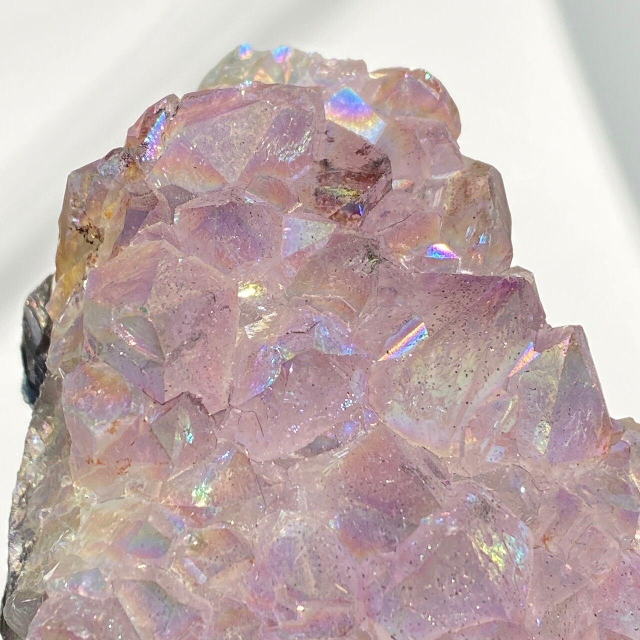 天然のアメジストクラスター(底部分を平らにカットして立たせる事を可能にしたカットベース仕様)の表面にチタンの蒸着と酸素の放射により金属コーティングが施されています。