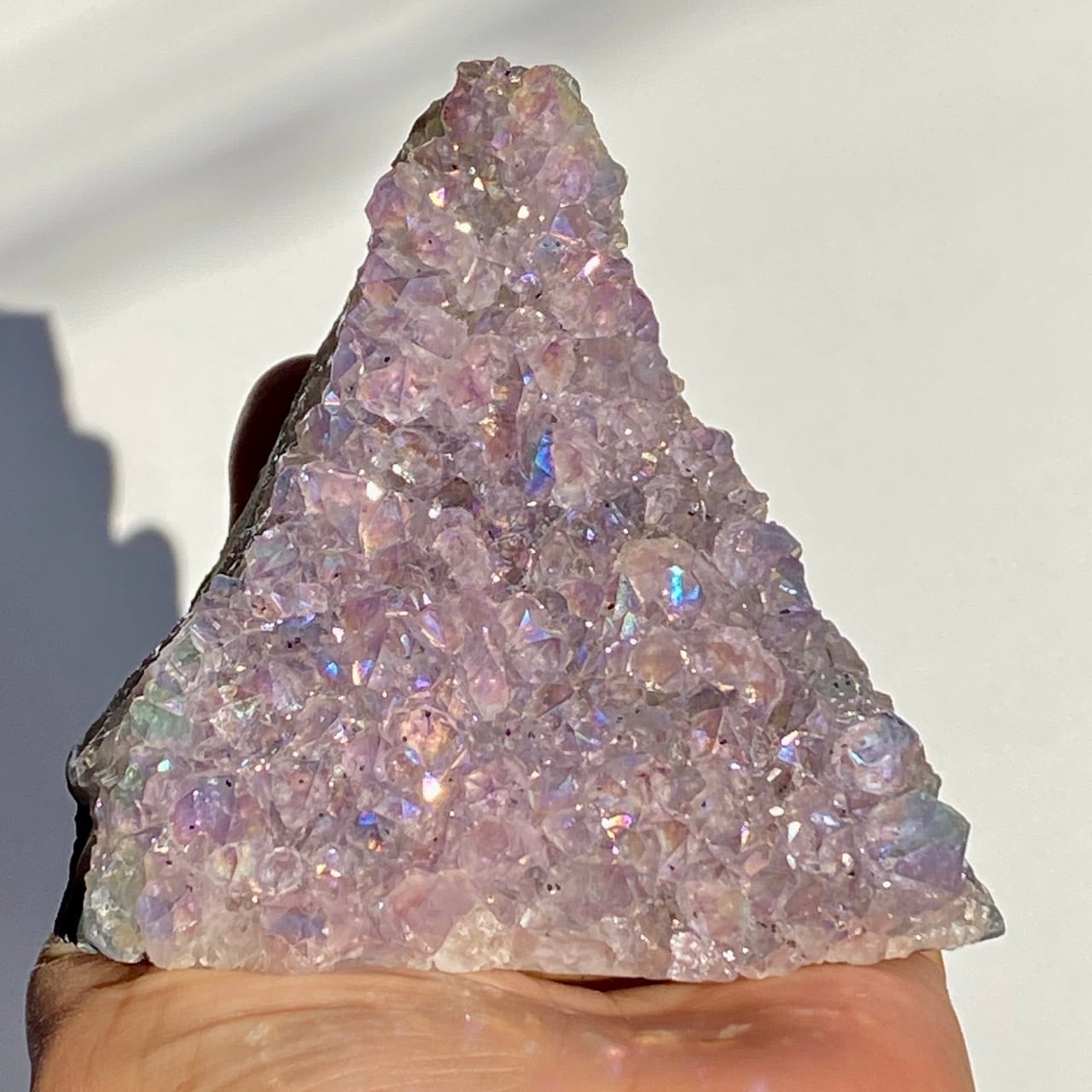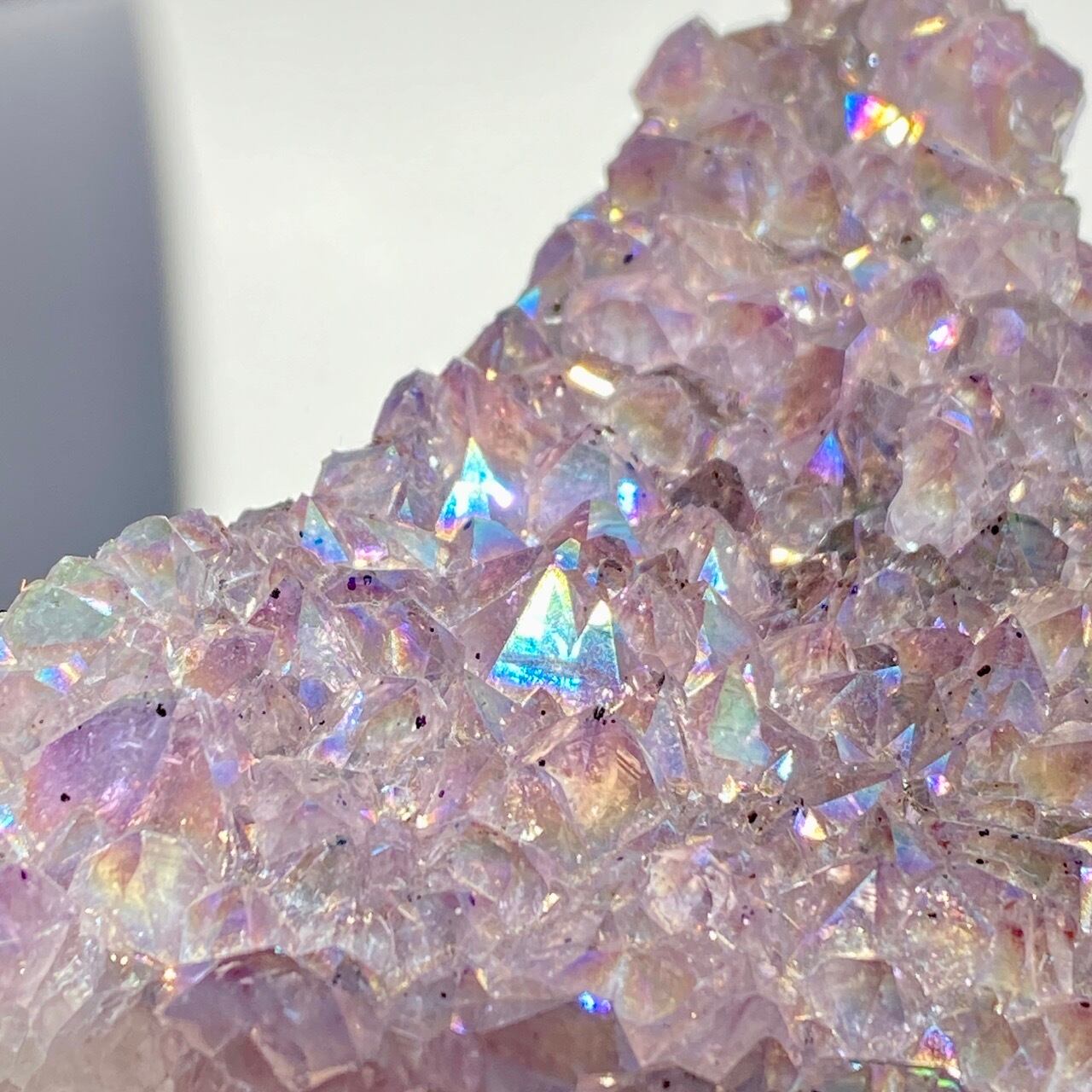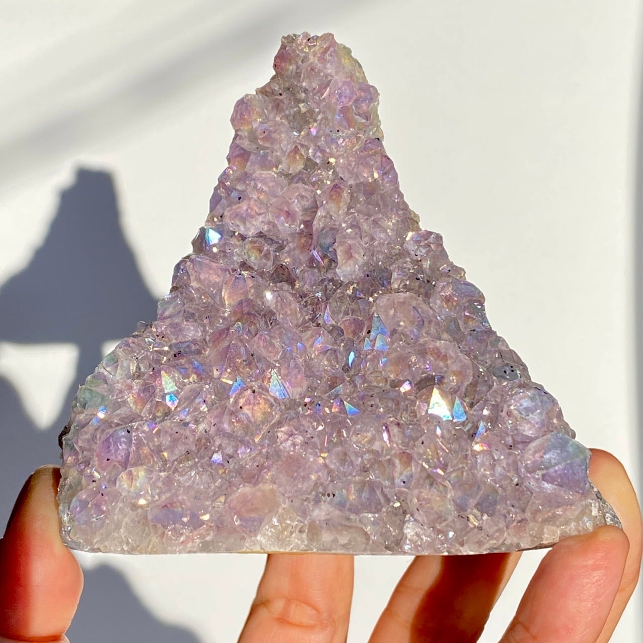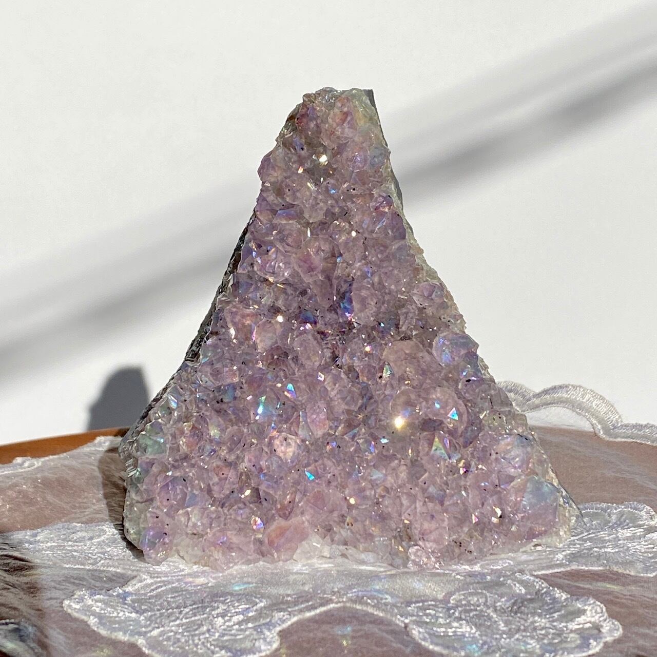富士山♡を思わせるような三角形の形状で、結晶が小さめですがびっしりと表面を覆っているためオーラが細かく輝き優しい色味とも相まってハートがキュンキュンする可愛さです。天使や妖精、ユニコーンと飾っても神々しい可愛さですし、結晶が龍の鱗の様にも見えるので、ドラゴンも可愛いパートナーになると思います。