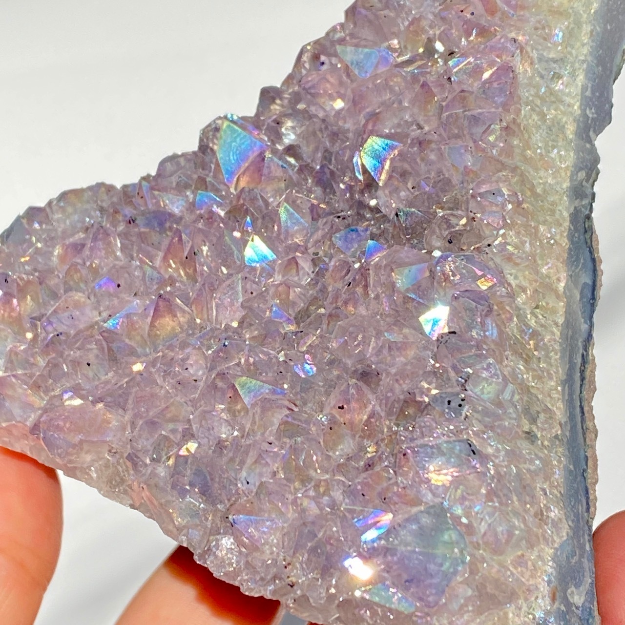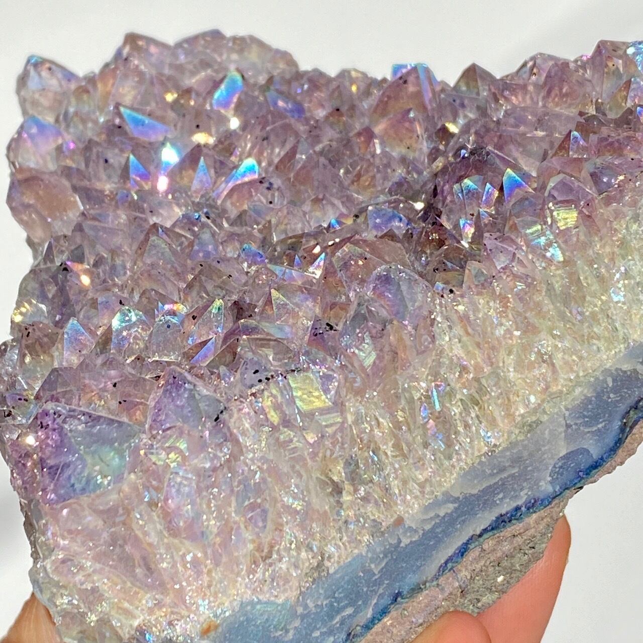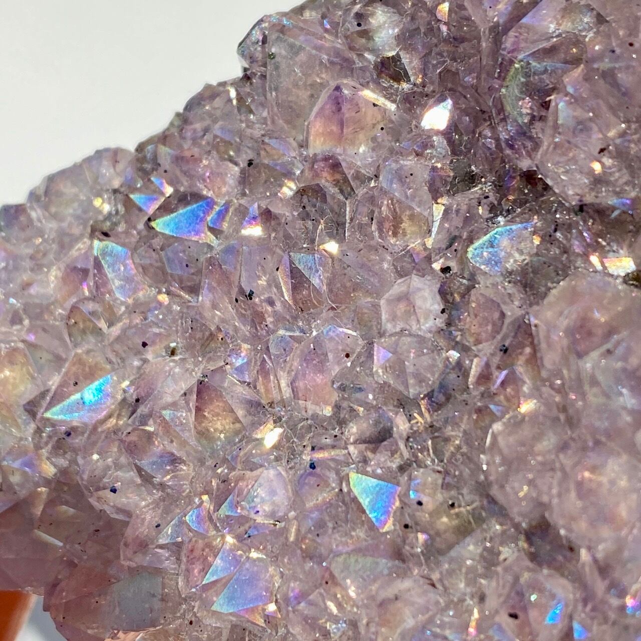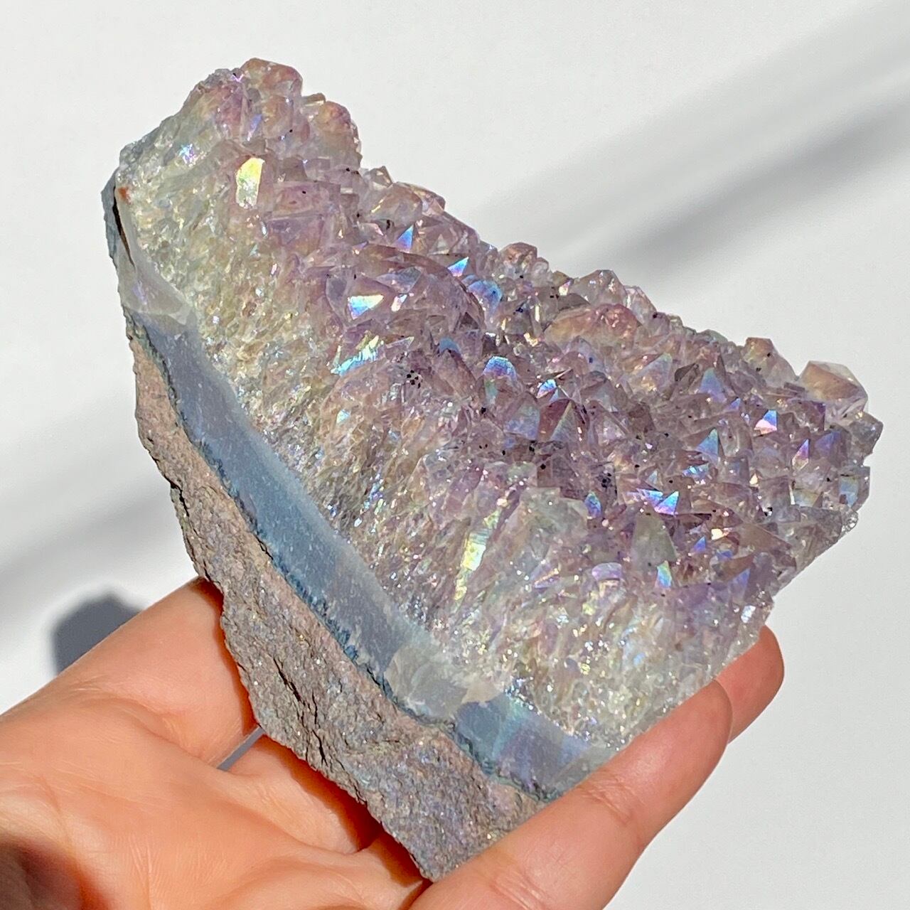 富士山♡を思わせるような三角形の形状で、結晶が小さめですがびっしりと表面を覆っているためオーラが細かく輝き優しい色味とも相まってハートがキュンキュンする可愛さです。天使や妖精、ユニコーンと飾っても神々しい可愛さですし、結晶が龍の鱗の様にも見えるので、ドラゴンも可愛いパートナーになると思います。