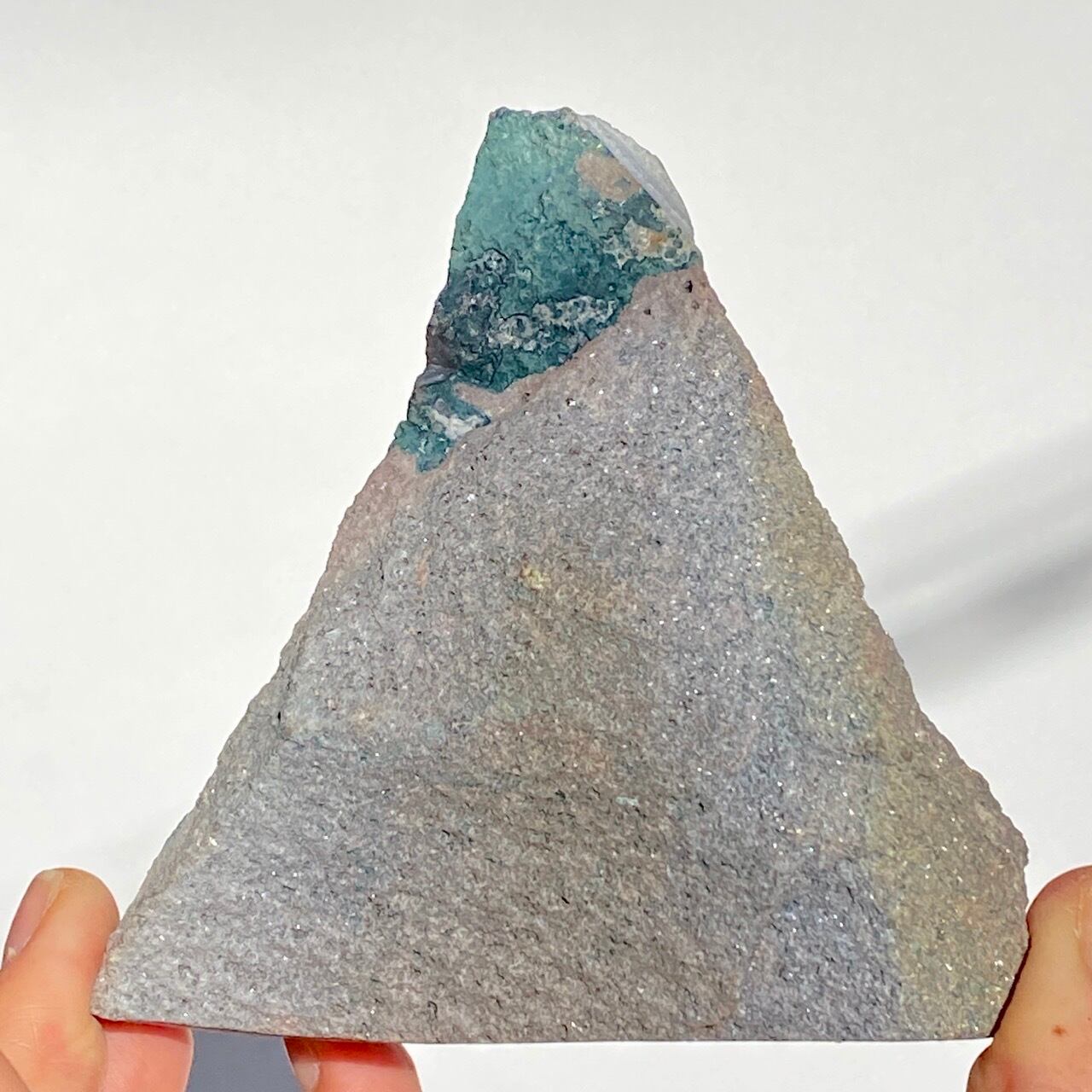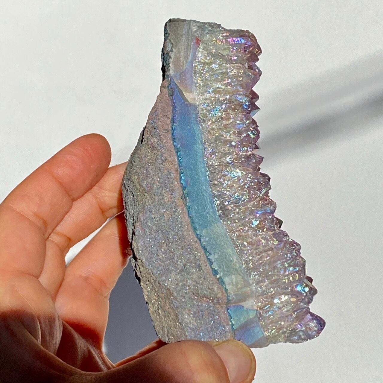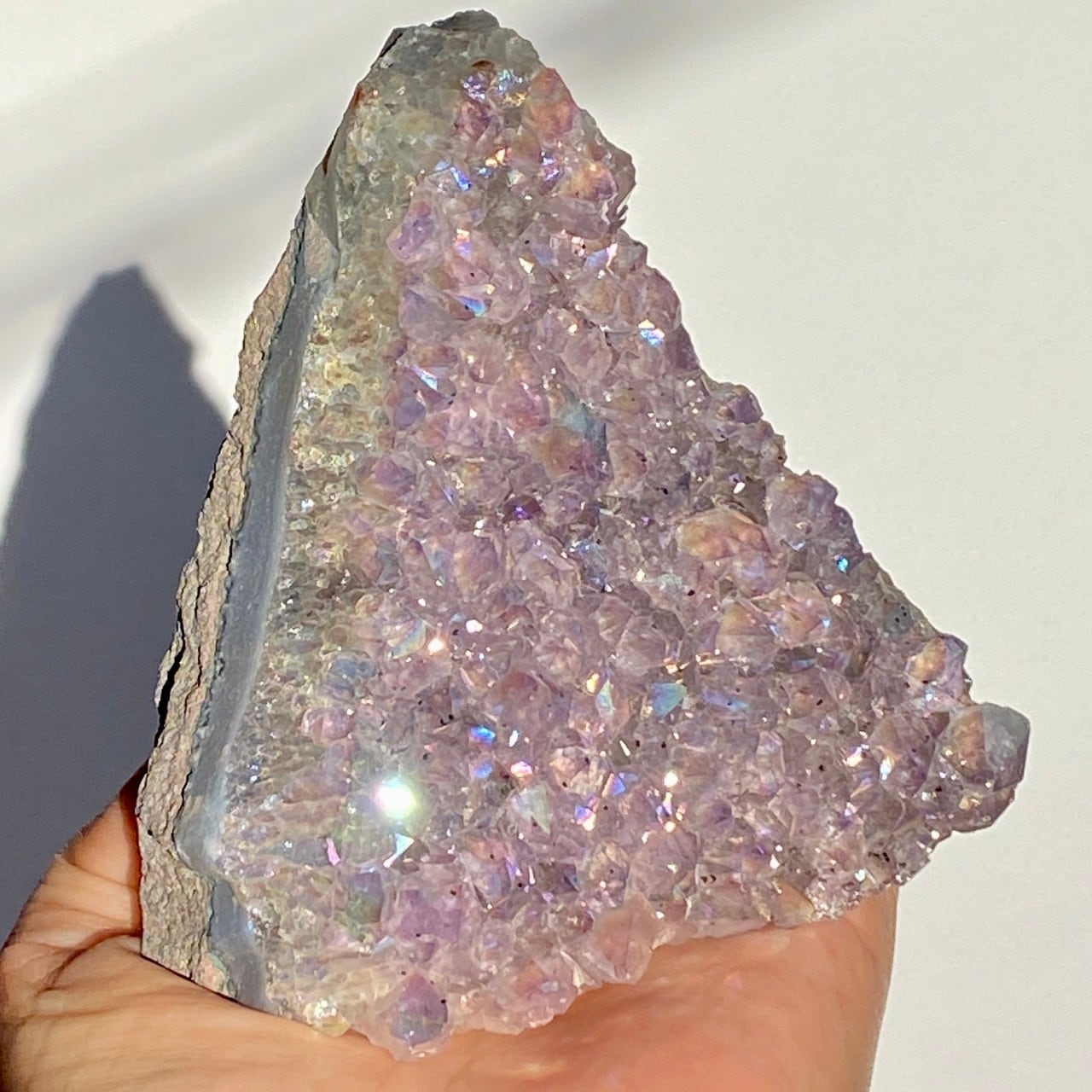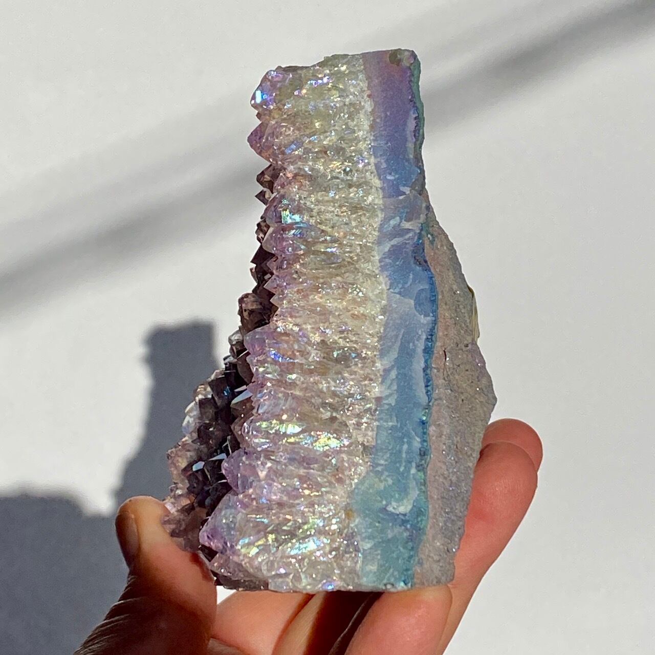 富士山♡を思わせるような三角形の形状で、結晶が小さめですがびっしりと表面を覆っているためオーラが細かく輝き優しい色味とも相まってハートがキュンキュンする可愛さです。天使や妖精、ユニコーンと飾っても神々しい可愛さですし、結晶が龍の鱗の様にも見えるので、ドラゴンも可愛いパートナーになると思います。