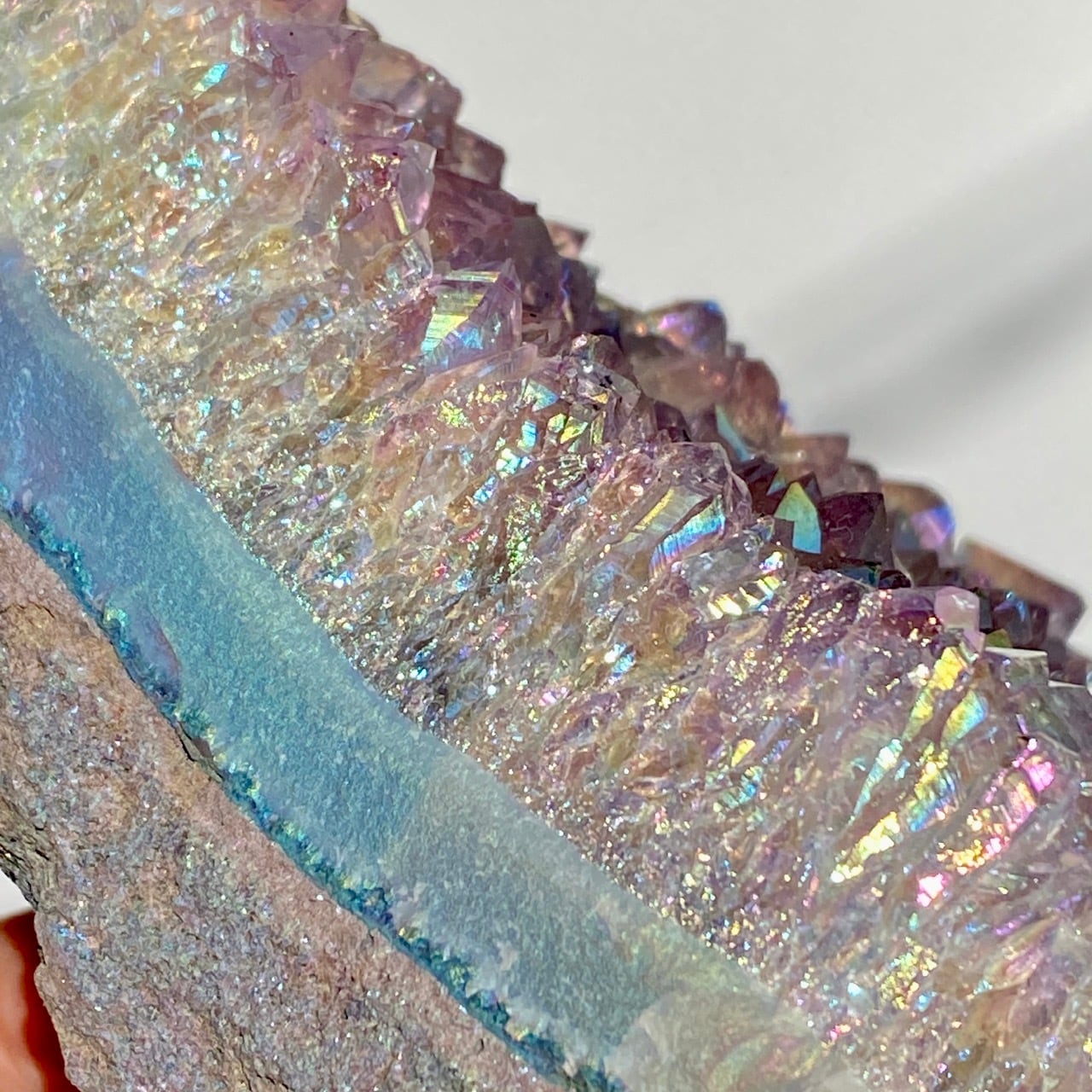 天然のアメジストクラスター(底部分を平らにカットして立たせる事を可能にしたカットベース仕様)の表面にチタンの蒸着と酸素の放射により金属コーティングが施されています。