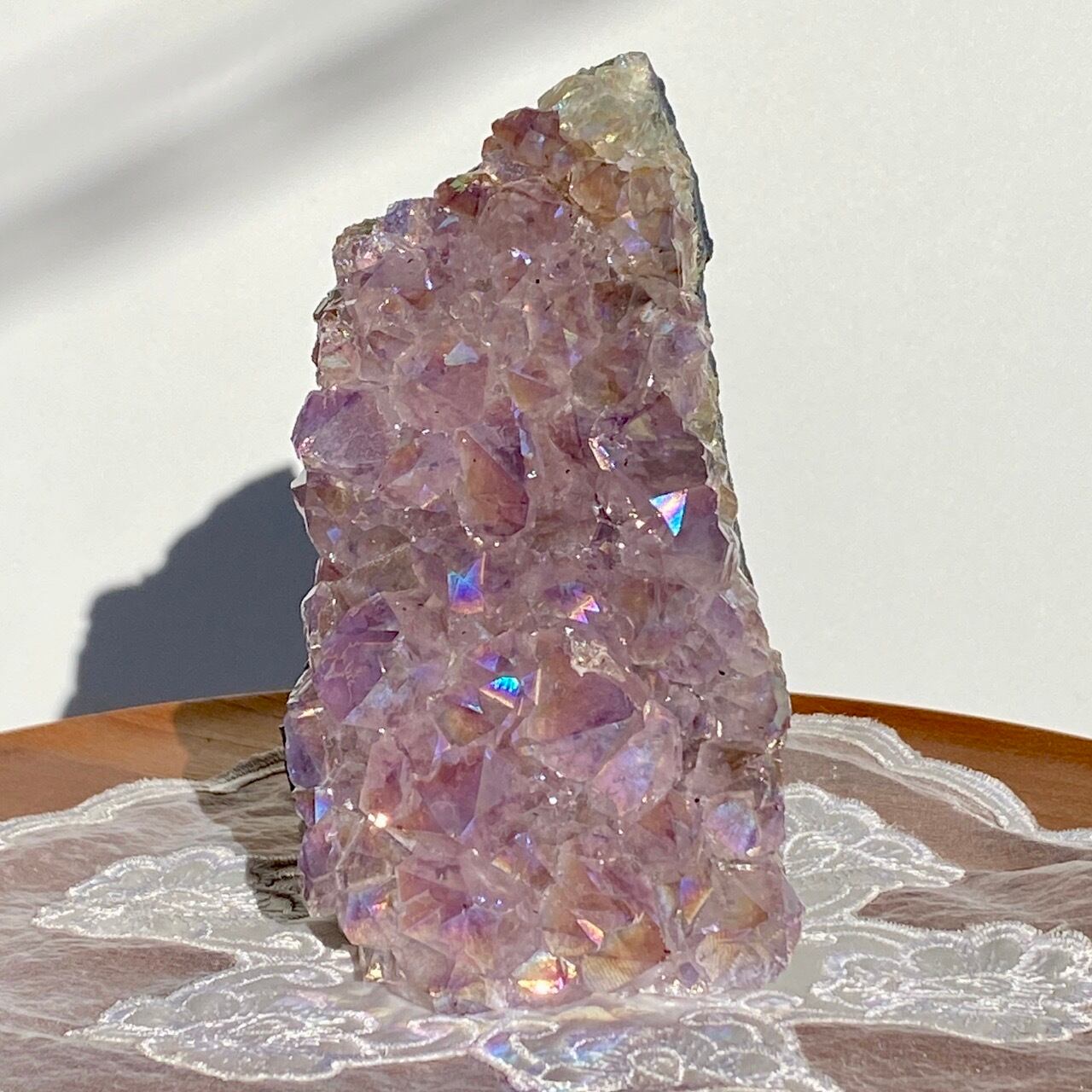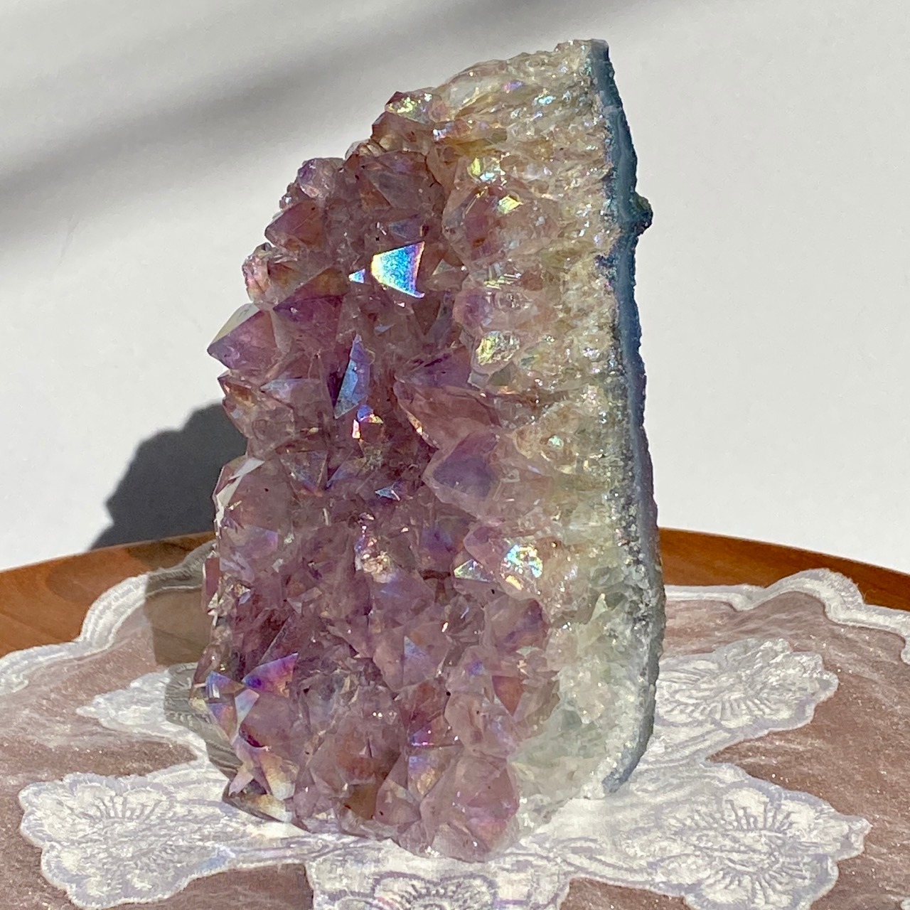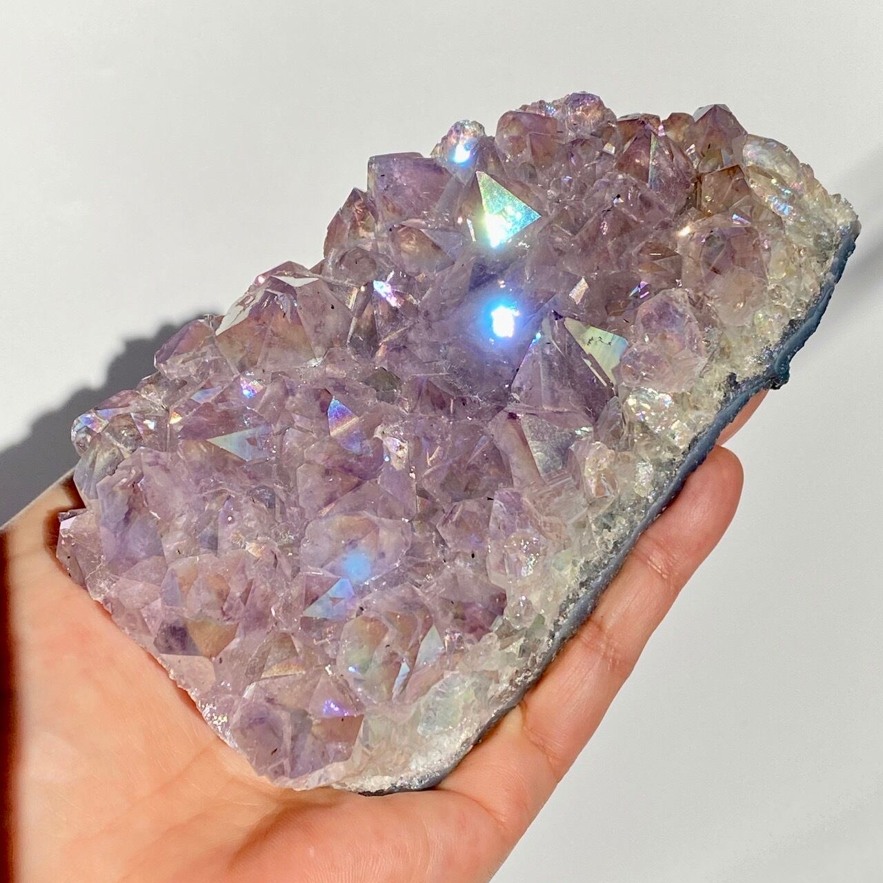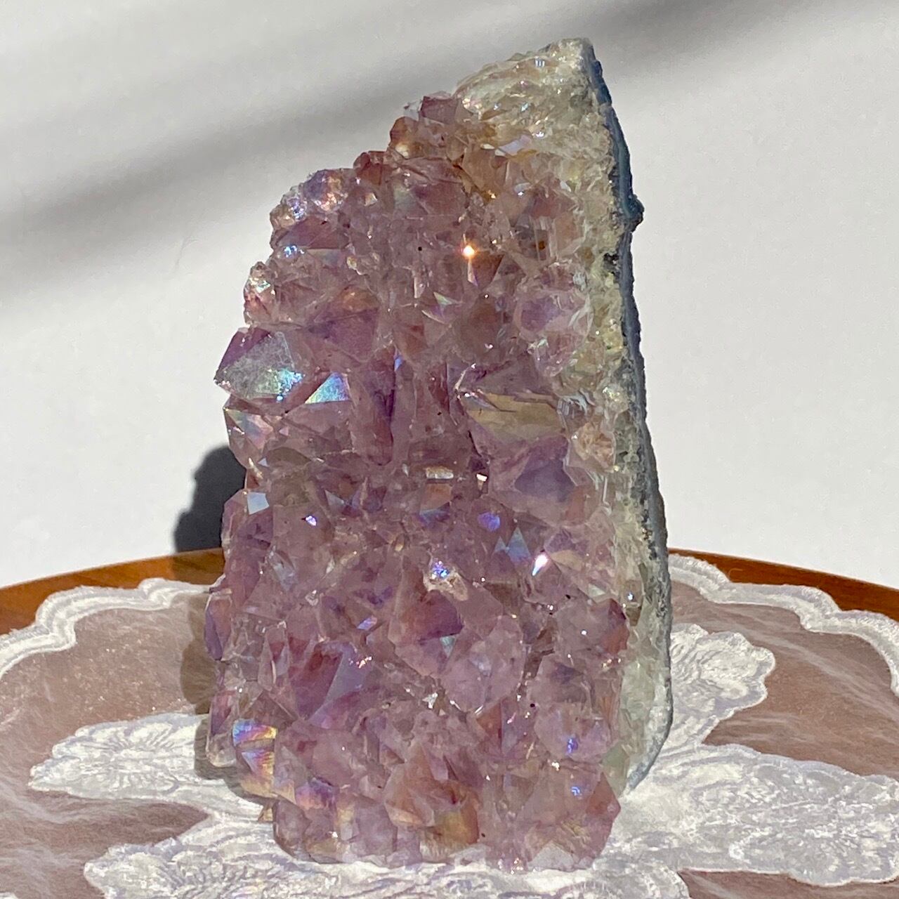 店主が元々キープしようと思っていた美しい子です。色味は艶々ぷるぷるラベンダー。画像では表せていませんが、きらっきらです。天使や妖精、ユニコーンと飾っても神々しい可愛さですし、結晶が龍の鱗の様にも見えるので、ドラゴンも可愛いパートナーになると思います。