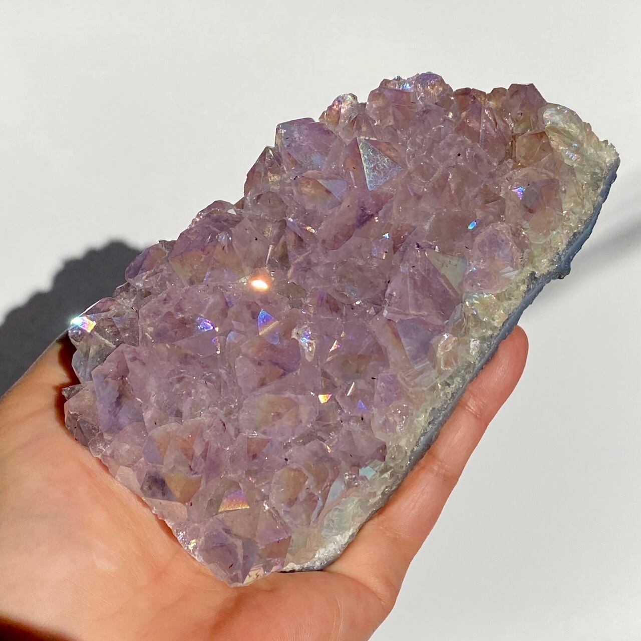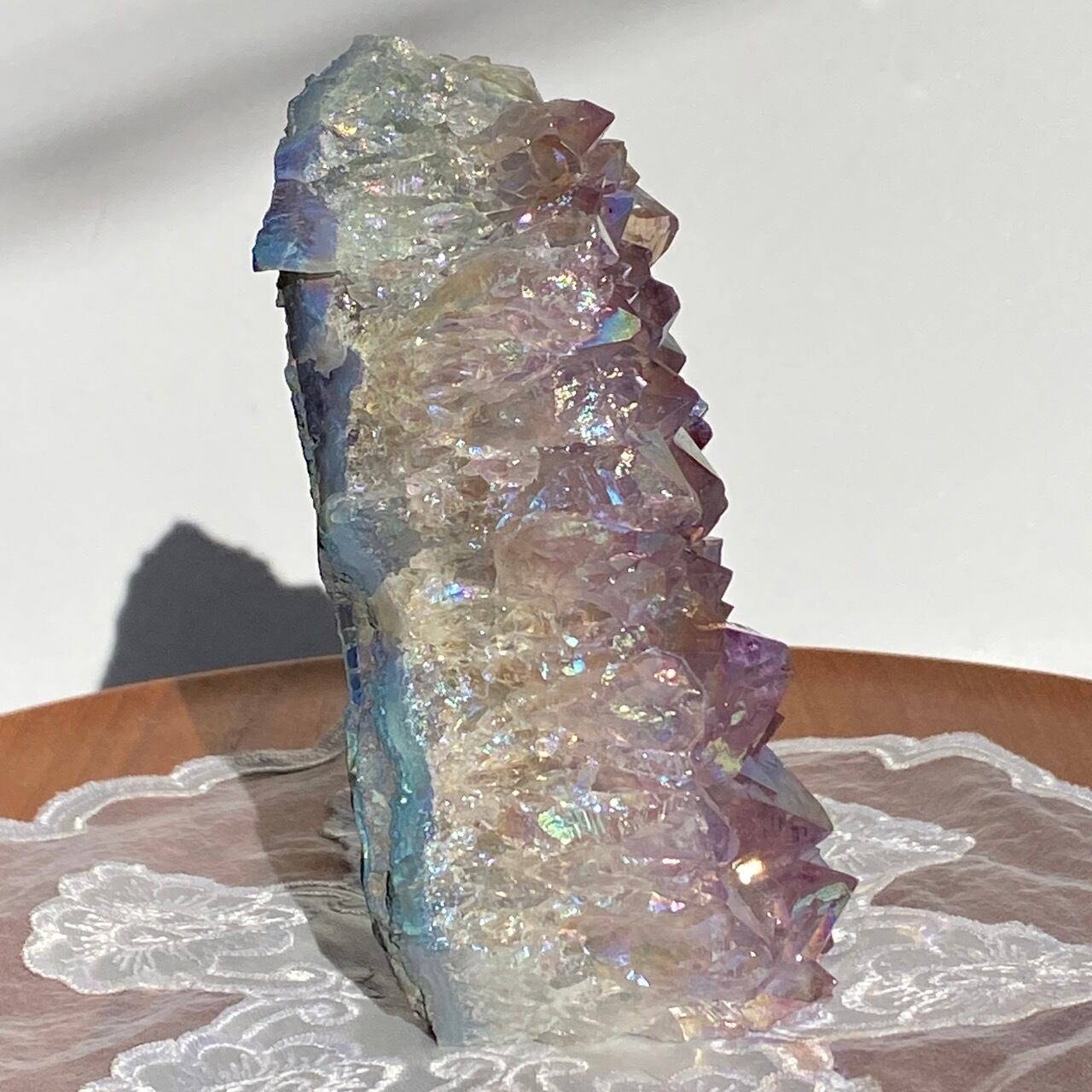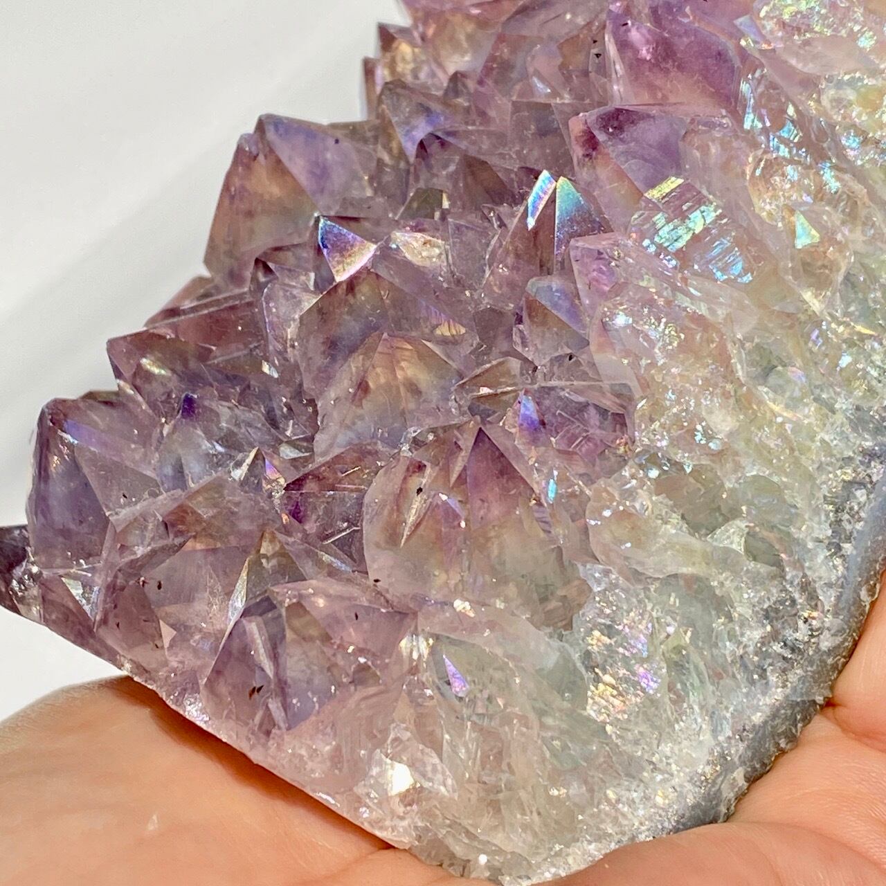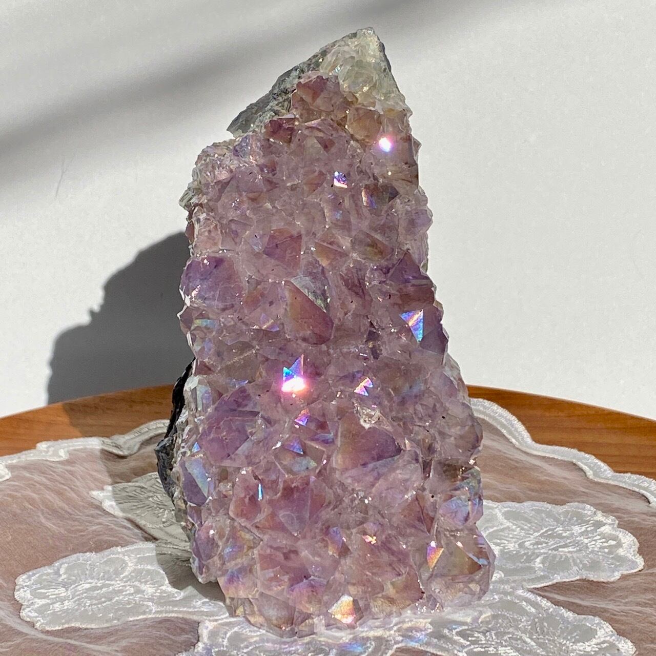 店主が元々キープしようと思っていた美しい子です。色味は艶々ぷるぷるラベンダー。画像では表せていませんが、きらっきらです。天使や妖精、ユニコーンと飾っても神々しい可愛さですし、結晶が龍の鱗の様にも見えるので、ドラゴンも可愛いパートナーになると思います。