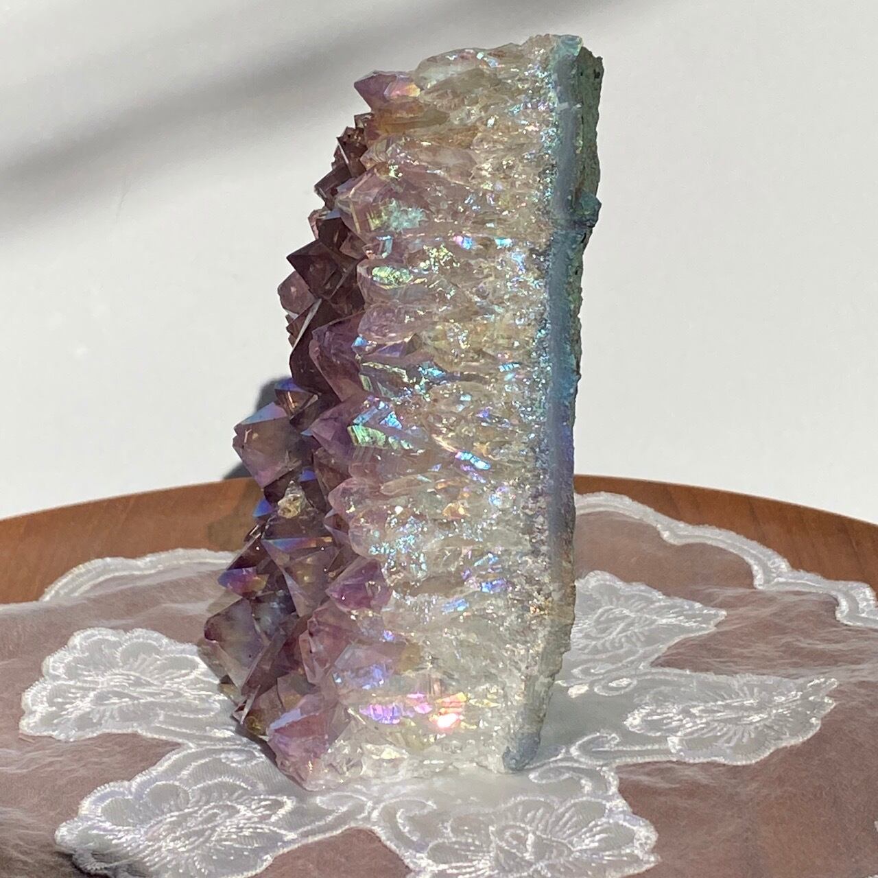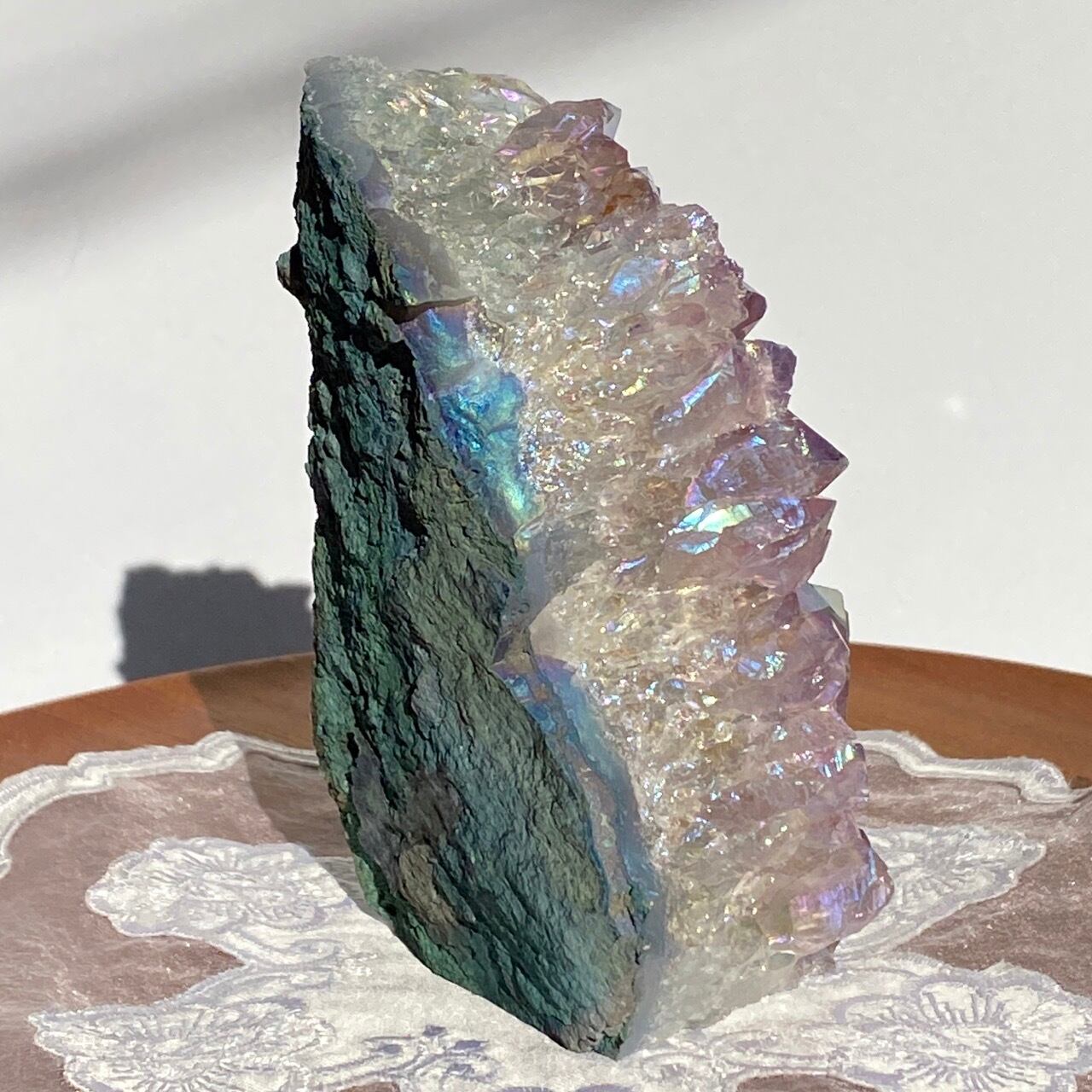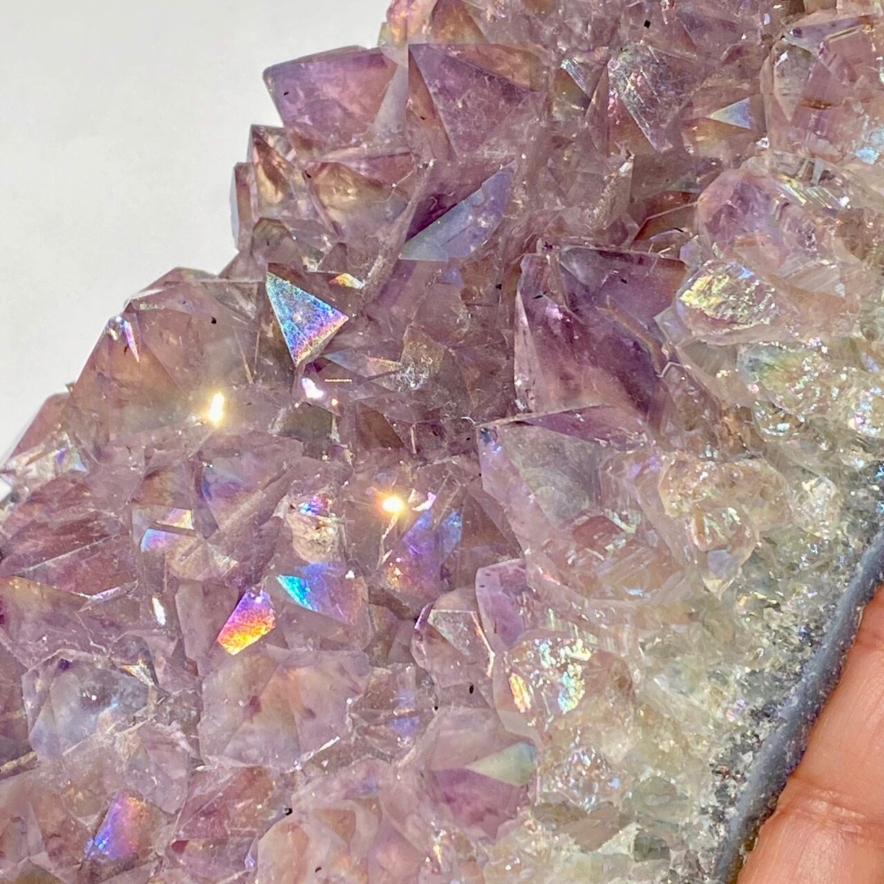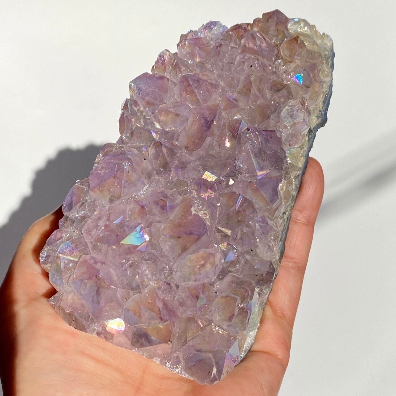 店主が元々キープしようと思っていた美しい子です。色味は艶々ぷるぷるラベンダー。画像では表せていませんが、きらっきらです。天使や妖精、ユニコーンと飾っても神々しい可愛さですし、結晶が龍の鱗の様にも見えるので、ドラゴンも可愛いパートナーになると思います。
