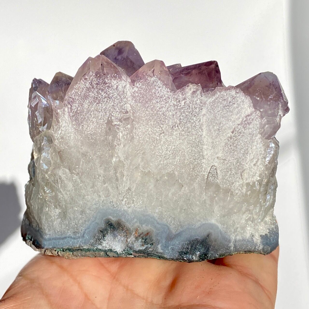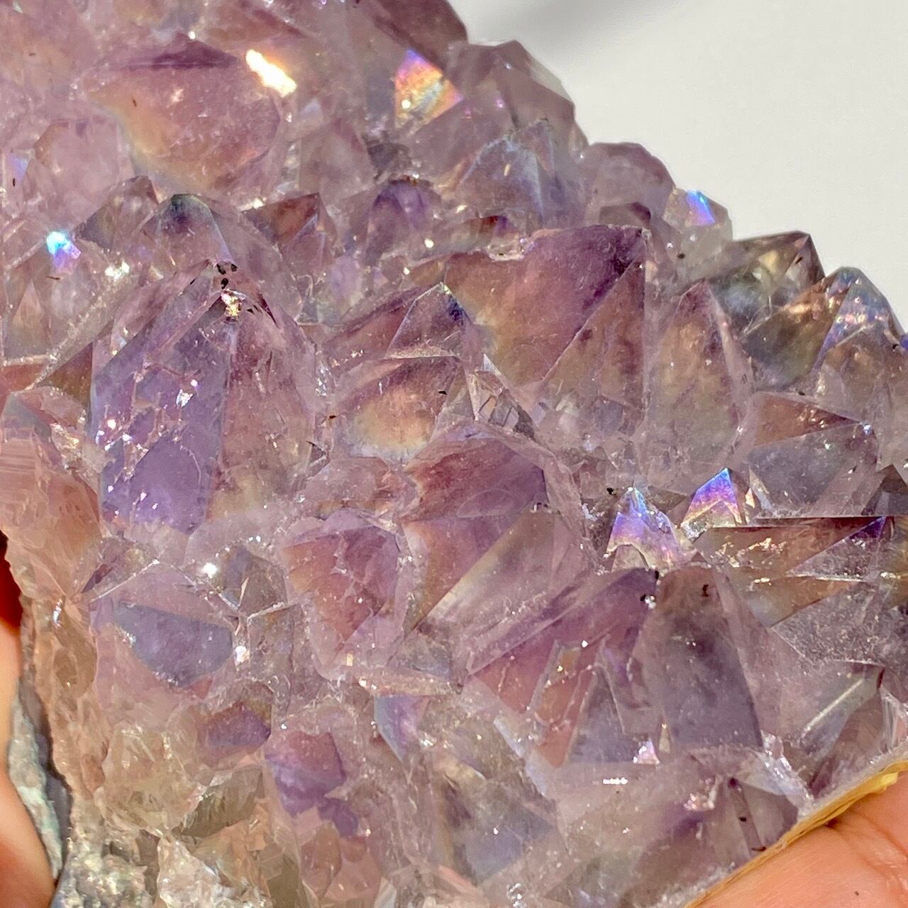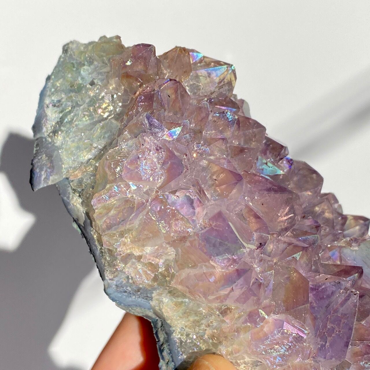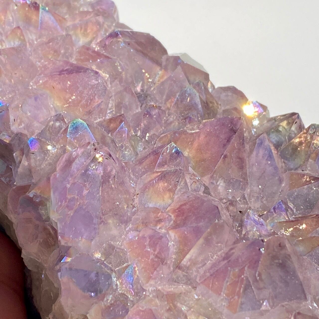 店主が元々キープしようと思っていた美しい子です。色味は艶々ぷるぷるラベンダー。画像では表せていませんが、きらっきらです。天使や妖精、ユニコーンと飾っても神々しい可愛さですし、結晶が龍の鱗の様にも見えるので、ドラゴンも可愛いパートナーになると思います。